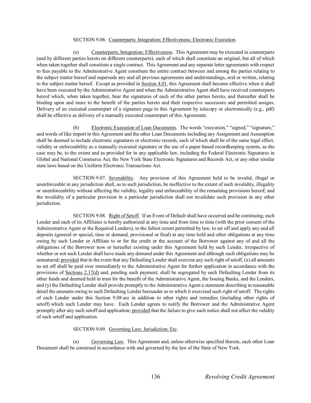 136 Revolving Credit Agreement SECTION 9.06. Counterparts; Integration; Effectiveness; Electronic Execution. (a) Counterparts; Integration; Effectiveness. This Agreement may be executed in counterparts (and by different parties hereto on different counterparts), each of which shall constitute an original, but all of which when taken together shall constitute a single contract. This Agreement and any separate letter agreements with respect to fees payable to the Administrative Agent constitute the entire contract between and among the parties relating to the subject matter hereof and supersede any and all previous agreements and understandings, oral or written, relating to the subject matter hereof. Except as provided in Section 4.01, this Agreement shall become effective when it shall have been executed by the Administrative Agent and when the Administrative Agent shall have received counterparts hereof which, when taken together, bear the signatures of each of the other parties hereto, and thereafter shall be binding upon and inure to the benefit of the parties hereto and their respective successors and permitted assigns. Delivery of an executed counterpart of a signature page to this Agreement by telecopy or electronically (e.g., pdf) shall be effective as delivery of a manually executed counterpart of this Agreement. (b) Electronic Execution of Loan Documents. The words “execution,” “signed,” “signature,” and words of like import in this Agreement and the other Loan Documents including any Assignment and Assumption shall be deemed to include electronic signatures or electronic records, each of which shall be of the same legal effect, validity or enforceability as a manually executed signature or the use of a paper-based recordkeeping system, as the case may be, to the extent and as provided for in any applicable law, including the Federal Electronic Signatures in Global and National Commerce Act, the New York State Electronic Signatures and Records Act, or any other similar state laws based on the Uniform Electronic Transactions Act. SECTION 9.07. Severability. Any provision of this Agreement held to be invalid, illegal or unenforceable in any jurisdiction shall, as to such jurisdiction, be ineffective to the extent of such invalidity, illegality or unenforceability without affecting the validity, legality and enforceability of the remaining provisions hereof; and the invalidity of a particular provision in a particular jurisdiction shall not invalidate such provision in any other jurisdiction. SECTION 9.08. Right of Setoff. If an Event of Default shall have occurred and be continuing, each Lender and each of its Affiliates is hereby authorized at any time and from time to time (with the prior consent of the Administrative Agent or the Required Lenders), to the fullest extent permitted by law, to set off and apply any and all deposits (general or special, time or demand, provisional or final) at any time held and other obligations at any time owing by such Lender or Affiliate to or for the credit or the account of the Borrower against any of and all the obligations of the Borrower now or hereafter existing under this Agreement held by such Lender, irrespective of whether or not such Lender shall have made any demand under this Agreement and although such obligations may be unmatured; provided that in the event that any Defaulting Lender shall exercise any such right of setoff, (x) all amounts so set off shall be paid over immediately to the Administrative Agent for further application in accordance with the provisions of Sections 2.17(d) and, pending such payment, shall be segregated by such Defaulting Lender from its other funds and deemed held in trust for the benefit of the Administrative Agent, the Issuing Banks, and the Lenders, and (y) the Defaulting Lender shall provide promptly to the Administrative Agent a statement describing in reasonable detail the amounts owing to such Defaulting Lender hereunder as to which it exercised such right of setoff. The rights of each Lender under this Section 9.08 are in addition to other rights and remedies (including other rights of setoff) which such Lender may have. Each Lender agrees to notify the Borrower and the Administrative Agent promptly after any such setoff and application; provided that the failure to give such notice shall not affect the validity of such setoff and application. SECTION 9.09. Governing Law; Jurisdiction; Etc. (a) Governing Law. This Agreement and, unless otherwise specified therein, each other Loan Document shall be construed in accordance with and governed by the law of the State of New York.