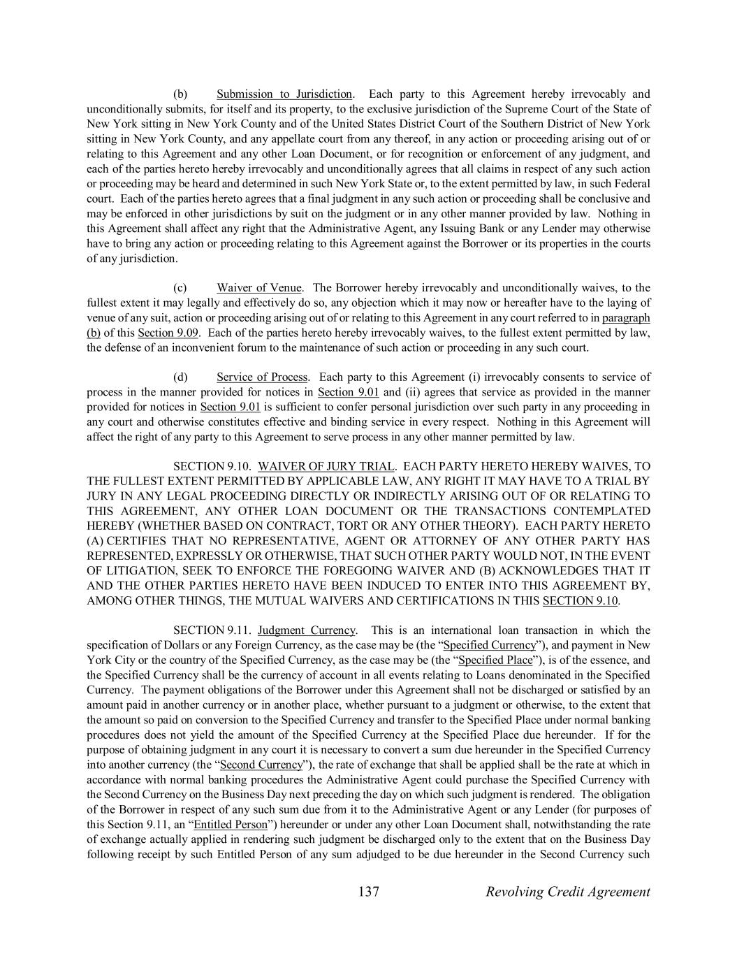 137 Revolving Credit Agreement (b) Submission to Jurisdiction. Each party to this Agreement hereby irrevocably and unconditionally submits, for itself and its property, to the exclusive jurisdiction of the Supreme Court of the State of New York sitting in New York County and of the United States District Court of the Southern District of New York sitting in New York County, and any appellate court from any thereof, in any action or proceeding arising out of or relating to this Agreement and any other Loan Document, or for recognition or enforcement of any judgment, and each of the parties hereto hereby irrevocably and unconditionally agrees that all claims in respect of any such action or proceeding may be heard and determined in such New York State or, to the extent permitted by law, in such Federal court. Each of the parties hereto agrees that a final judgment in any such action or proceeding shall be conclusive and may be enforced in other jurisdictions by suit on the judgment or in any other manner provided by law. Nothing in this Agreement shall affect any right that the Administrative Agent, any Issuing Bank or any Lender may otherwise have to bring any action or proceeding relating to this Agreement against the Borrower or its properties in the courts of any jurisdiction. (c) Waiver of Venue. The Borrower hereby irrevocably and unconditionally waives, to the fullest extent it may legally and effectively do so, any objection which it may now or hereafter have to the laying of venue of any suit, action or proceeding arising out of or relating to this Agreement in any court referred to in paragraph (b) of this Section 9.09. Each of the parties hereto hereby irrevocably waives, to the fullest extent permitted by law, the defense of an inconvenient forum to the maintenance of such action or proceeding in any such court. (d) Service of Process. Each party to this Agreement (i) irrevocably consents to service of process in the manner provided for notices in Section 9.01 and (ii) agrees that service as provided in the manner provided for notices in Section 9.01 is sufficient to confer personal jurisdiction over such party in any proceeding in any court and otherwise constitutes effective and binding service in every respect. Nothing in this Agreement will affect the right of any party to this Agreement to serve process in any other manner permitted by law. SECTION 9.10. WAIVER OF JURY TRIAL. EACH PARTY HERETO HEREBY WAIVES, TO THE FULLEST EXTENT PERMITTED BY APPLICABLE LAW, ANY RIGHT IT MAY HAVE TO A TRIAL BY JURY IN ANY LEGAL PROCEEDING DIRECTLY OR INDIRECTLY ARISING OUT OF OR RELATING TO THIS AGREEMENT, ANY OTHER LOAN DOCUMENT OR THE TRANSACTIONS CONTEMPLATED HEREBY (WHETHER BASED ON CONTRACT, TORT OR ANY OTHER THEORY). EACH PARTY HERETO (A) CERTIFIES THAT NO REPRESENTATIVE, AGENT OR ATTORNEY OF ANY OTHER PARTY HAS REPRESENTED, EXPRESSLY OR OTHERWISE, THAT SUCH OTHER PARTY WOULD NOT, IN THE EVENT OF LITIGATION, SEEK TO ENFORCE THE FOREGOING WAIVER AND (B) ACKNOWLEDGES THAT IT AND THE OTHER PARTIES HERETO HAVE BEEN INDUCED TO ENTER INTO THIS AGREEMENT BY, AMONG OTHER THINGS, THE MUTUAL WAIVERS AND CERTIFICATIONS IN THIS SECTION 9.10. SECTION 9.11. Judgment Currency. This is an international loan transaction in which the specification of Dollars or any Foreign Currency, as the case may be (the “Specified Currency”), and payment in New York City or the country of the Specified Currency, as the case may be (the “Specified Place”), is of the essence, and the Specified Currency shall be the currency of account in all events relating to Loans denominated in the Specified Currency. The payment obligations of the Borrower under this Agreement shall not be discharged or satisfied by an amount paid in another currency or in another place, whether pursuant to a judgment or otherwise, to the extent that the amount so paid on conversion to the Specified Currency and transfer to the Specified Place under normal banking procedures does not yield the amount of the Specified Currency at the Specified Place due hereunder. If for the purpose of obtaining judgment in any court it is necessary to convert a sum due hereunder in the Specified Currency into another currency (the “Second Currency”), the rate of exchange that shall be applied shall be the rate at which in accordance with normal banking procedures the Administrative Agent could purchase the Specified Currency with the Second Currency on the Business Day next preceding the day on which such judgment is rendered. The obligation of the Borrower in respect of any such sum due from it to the Administrative Agent or any Lender (for purposes of this Section 9.11, an “Entitled Person”) hereunder or under any other Loan Document shall, notwithstanding the rate of exchange actually applied in rendering such judgment be discharged only to the extent that on the Business Day following receipt by such Entitled Person of any sum adjudged to be due hereunder in the Second Currency such