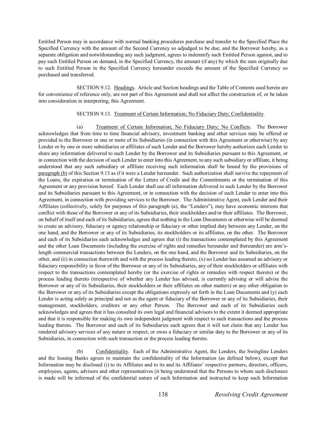 138 Revolving Credit Agreement Entitled Person may in accordance with normal banking procedures purchase and transfer to the Specified Place the Specified Currency with the amount of the Second Currency so adjudged to be due; and the Borrower hereby, as a separate obligation and notwithstanding any such judgment, agrees to indemnify such Entitled Person against, and to pay such Entitled Person on demand, in the Specified Currency, the amount (if any) by which the sum originally due to such Entitled Person in the Specified Currency hereunder exceeds the amount of the Specified Currency so purchased and transferred. SECTION 9.12. Headings. Article and Section headings and the Table of Contents used herein are for convenience of reference only, are not part of this Agreement and shall not affect the construction of, or be taken into consideration in interpreting, this Agreement. SECTION 9.13. Treatment of Certain Information; No Fiduciary Duty; Confidentiality. (a) Treatment of Certain Information; No Fiduciary Duty; No Conflicts. The Borrower acknowledges that from time to time financial advisory, investment banking and other services may be offered or provided to the Borrower or one or more of its Subsidiaries (in connection with this Agreement or otherwise) by any Lender or by one or more subsidiaries or affiliates of such Lender and the Borrower hereby authorizes each Lender to share any information delivered to such Lender by the Borrower and its Subsidiaries pursuant to this Agreement, or in connection with the decision of such Lender to enter into this Agreement, to any such subsidiary or affiliate, it being understood that any such subsidiary or affiliate receiving such information shall be bound by the provisions of paragraph (b) of this Section 9.13 as if it were a Lender hereunder. Such authorization shall survive the repayment of the Loans, the expiration or termination of the Letters of Credit and the Commitments or the termination of this Agreement or any provision hereof. Each Lender shall use all information delivered to such Lender by the Borrower and its Subsidiaries pursuant to this Agreement, or in connection with the decision of such Lender to enter into this Agreement, in connection with providing services to the Borrower. The Administrative Agent, each Lender and their Affiliates (collectively, solely for purposes of this paragraph (a), the “Lenders”), may have economic interests that conflict with those of the Borrower or any of its Subsidiaries, their stockholders and/or their affiliates. The Borrower, on behalf of itself and each of its Subsidiaries, agrees that nothing in the Loan Documents or otherwise will be deemed to create an advisory, fiduciary or agency relationship or fiduciary or other implied duty between any Lender, on the one hand, and the Borrower or any of its Subsidiaries, its stockholders or its affiliates, on the other. The Borrower and each of its Subsidiaries each acknowledges and agrees that (i) the transactions contemplated by this Agreement and the other Loan Documents (including the exercise of rights and remedies hereunder and thereunder) are arm’s- length commercial transactions between the Lenders, on the one hand, and the Borrower and its Subsidiaries, on the other, and (ii) in connection therewith and with the process leading thereto, (x) no Lender has assumed an advisory or fiduciary responsibility in favor of the Borrower or any of its Subsidiaries, any of their stockholders or affiliates with respect to the transactions contemplated hereby (or the exercise of rights or remedies with respect thereto) or the process leading thereto (irrespective of whether any Lender has advised, is currently advising or will advise the Borrower or any of its Subsidiaries, their stockholders or their affiliates on other matters) or any other obligation to the Borrower or any of its Subsidiaries except the obligations expressly set forth in the Loan Documents and (y) each Lender is acting solely as principal and not as the agent or fiduciary of the Borrower or any of its Subsidiaries, their management, stockholders, creditors or any other Person. The Borrower and each of its Subsidiaries each acknowledges and agrees that it has consulted its own legal and financial advisors to the extent it deemed appropriate and that it is responsible for making its own independent judgment with respect to such transactions and the process leading thereto. The Borrower and each of its Subsidiaries each agrees that it will not claim that any Lender has rendered advisory services of any nature or respect, or owes a fiduciary or similar duty to the Borrower or any of its Subsidiaries, in connection with such transaction or the process leading thereto. (b) Confidentiality. Each of the Administrative Agent, the Lenders, the Swingline Lenders and the Issuing Banks agrees to maintain the confidentiality of the Information (as defined below), except that Information may be disclosed (i) to its Affiliates and to its and its Affiliates’ respective partners, directors, officers, employees, agents, advisors and other representatives (it being understood that the Persons to whom such disclosure is made will be informed of the confidential nature of such Information and instructed to keep such Information