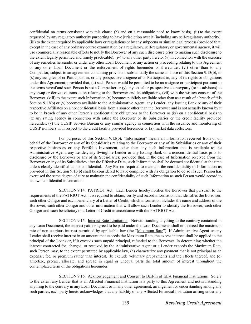 139 Revolving Credit Agreement confidential on terms consistent with this clause (b) and on a reasonable need to know basis), (ii) to the extent requested by any regulatory authority purporting to have jurisdiction over it (including any self-regulatory authority), (iii) to the extent required by applicable laws or regulations or by any subpoena or similar legal process (provided that, except in the case of any ordinary course examination by a regulatory, self-regulatory or governmental agency, it will use commercially reasonable efforts to notify the Borrower of any such disclosure prior to making such disclosure to the extent legally permitted and timely practicable), (iv) to any other party hereto, (v) in connection with the exercise of any remedies hereunder or under any other Loan Document or any action or proceeding relating to this Agreement or any other Loan Document or the enforcement of rights hereunder or thereunder, (vi) other than to any Competitor, subject to an agreement containing provisions substantially the same as those of this Section 9.13(b), to (x) any assignee of or Participant in, or any prospective assignee of or Participant in, any of its rights or obligations under this Agreement; provided that, (a) such Person would be permitted to be an assignee or participant pursuant to the terms hereof and such Person is not a Competitor or (y) any actual or prospective counterparty (or its advisors) to any swap or derivative transaction relating to the Borrower and its obligations, (vii) with the written consent of the Borrower, (viii) to the extent such Information (x) becomes publicly available other than as a result of a breach of this Section 9.13(b) or (y) becomes available to the Administrative Agent, any Lender, any Issuing Bank or any of their respective Affiliates on a nonconfidential basis from a source other than the Borrower and is not actually known by it to be in breach of any other Person’s confidentiality obligations to the Borrower or (ix) on a confidential basis to (x) any rating agency in connection with rating the Borrower or its Subsidiaries or the credit facility provided hereunder, (y) the CUSIP Service Bureau or any similar agency in connection with the issuance and monitoring of CUSIP numbers with respect to the credit facility provided hereunder or (z) market data collectors. For purposes of this Section 9.13(b), “Information” means all information received from or on behalf of the Borrower or any of its Subsidiaries relating to the Borrower or any of its Subsidiaries or any of their respective businesses or any Portfolio Investment, other than any such information that is available to the Administrative Agent, any Lender, any Swingline Lender or any Issuing Bank on a nonconfidential basis prior to disclosure by the Borrower or any of its Subsidiaries; provided that, in the case of Information received from the Borrower or any of its Subsidiaries after the Effective Date, such Information shall be deemed confidential at the time unless clearly identified as nonconfidential. Any Person required to maintain the confidentiality of Information as provided in this Section 9.13(b) shall be considered to have complied with its obligation to do so if such Person has exercised the same degree of care to maintain the confidentiality of such Information as such Person would accord to its own confidential information. SECTION 9.14. PATRIOT Act. Each Lender hereby notifies the Borrower that pursuant to the requirements of the PATRIOT Act, it is required to obtain, verify and record information that identifies the Borrower, each other Obligor and each beneficiary of a Letter of Credit, which information includes the name and address of the Borrower, each other Obligor and other information that will allow such Lender to identify the Borrower, each other Obligor and each beneficiary of a Letter of Credit in accordance with the PATRIOT Act. SECTION 9.15. Interest Rate Limitation. Notwithstanding anything to the contrary contained in any Loan Document, the interest paid or agreed to be paid under the Loan Documents shall not exceed the maximum rate of non-usurious interest permitted by applicable law (the “Maximum Rate”). If Administrative Agent or any Lender shall receive interest in an amount that exceeds the Maximum Rate, the excess interest shall be applied to the principal of the Loans or, if it exceeds such unpaid principal, refunded to the Borrower. In determining whether the interest contracted for, charged, or received by the Administrative Agent or a Lender exceeds the Maximum Rate, such Person may, to the extent permitted by applicable law, (a) characterize any payment that is not principal as an expense, fee, or premium rather than interest, (b) exclude voluntary prepayments and the effects thereof, and (c) amortize, prorate, allocate, and spread in equal or unequal parts the total amount of interest throughout the contemplated term of the obligations hereunder. SECTION 9.16. Acknowledgement and Consent to Bail-In of EEA Financial Institutions. Solely to the extent any Lender that is an Affected Financial Institution is a party to this Agreement and notwithstanding anything to the contrary in any Loan Document or in any other agreement, arrangement or understanding among any such parties, each party hereto acknowledges that any liability of any Affected Financial Institution arising under any