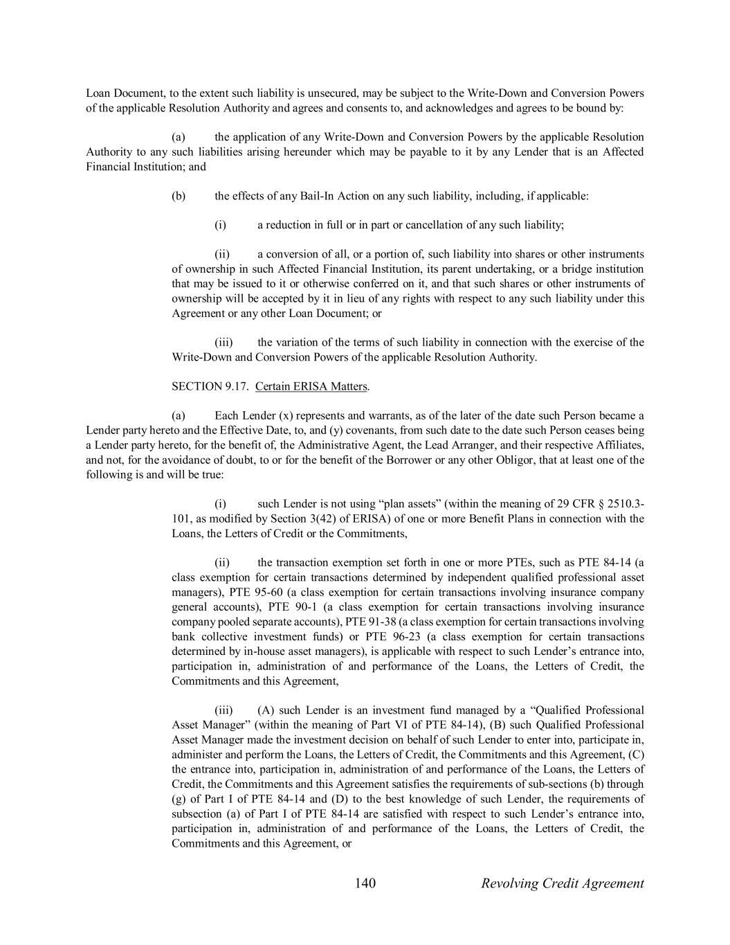 140 Revolving Credit Agreement Loan Document, to the extent such liability is unsecured, may be subject to the Write-Down and Conversion Powers of the applicable Resolution Authority and agrees and consents to, and acknowledges and agrees to be bound by: (a) the application of any Write-Down and Conversion Powers by the applicable Resolution Authority to any such liabilities arising hereunder which may be payable to it by any Lender that is an Affected Financial Institution; and (b) the effects of any Bail-In Action on any such liability, including, if applicable: (i) a reduction in full or in part or cancellation of any such liability; (ii) a conversion of all, or a portion of, such liability into shares or other instruments of ownership in such Affected Financial Institution, its parent undertaking, or a bridge institution that may be issued to it or otherwise conferred on it, and that such shares or other instruments of ownership will be accepted by it in lieu of any rights with respect to any such liability under this Agreement or any other Loan Document; or (iii) the variation of the terms of such liability in connection with the exercise of the Write-Down and Conversion Powers of the applicable Resolution Authority. SECTION 9.17. Certain ERISA Matters. (a) Each Lender (x) represents and warrants, as of the later of the date such Person became a Lender party hereto and the Effective Date, to, and (y) covenants, from such date to the date such Person ceases being a Lender party hereto, for the benefit of, the Administrative Agent, the Lead Arranger, and their respective Affiliates, and not, for the avoidance of doubt, to or for the benefit of the Borrower or any other Obligor, that at least one of the following is and will be true: (i) such Lender is not using “plan assets” (within the meaning of 29 CFR § 2510.3- 101, as modified by Section 3(42) of ERISA) of one or more Benefit Plans in connection with the Loans, the Letters of Credit or the Commitments, (ii) the transaction exemption set forth in one or more PTEs, such as PTE 84-14 (a class exemption for certain transactions determined by independent qualified professional asset managers), PTE 95-60 (a class exemption for certain transactions involving insurance company general accounts), PTE 90-1 (a class exemption for certain transactions involving insurance company pooled separate accounts), PTE 91-38 (a class exemption for certain transactions involving bank collective investment funds) or PTE 96-23 (a class exemption for certain transactions determined by in-house asset managers), is applicable with respect to such Lender’s entrance into, participation in, administration of and performance of the Loans, the Letters of Credit, the Commitments and this Agreement, (iii) (A) such Lender is an investment fund managed by a “Qualified Professional Asset Manager” (within the meaning of Part VI of PTE 84-14), (B) such Qualified Professional Asset Manager made the investment decision on behalf of such Lender to enter into, participate in, administer and perform the Loans, the Letters of Credit, the Commitments and this Agreement, (C) the entrance into, participation in, administration of and performance of the Loans, the Letters of Credit, the Commitments and this Agreement satisfies the requirements of sub-sections (b) through (g) of Part I of PTE 84-14 and (D) to the best knowledge of such Lender, the requirements of subsection (a) of Part I of PTE 84-14 are satisfied with respect to such Lender’s entrance into, participation in, administration of and performance of the Loans, the Letters of Credit, the Commitments and this Agreement, or