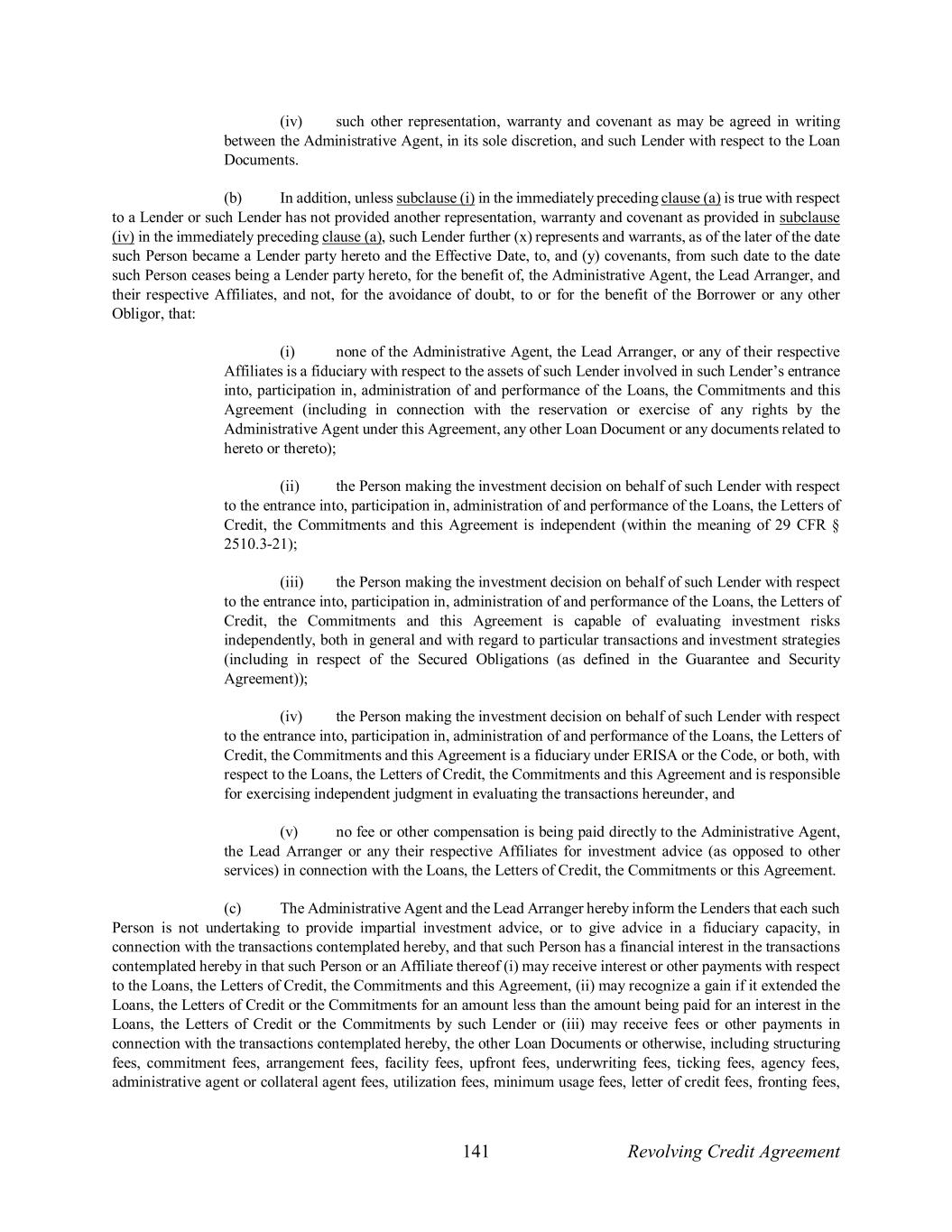141 Revolving Credit Agreement (iv) such other representation, warranty and covenant as may be agreed in writing between the Administrative Agent, in its sole discretion, and such Lender with respect to the Loan Documents. (b) In addition, unless subclause (i) in the immediately preceding clause (a) is true with respect to a Lender or such Lender has not provided another representation, warranty and covenant as provided in subclause (iv) in the immediately preceding clause (a), such Lender further (x) represents and warrants, as of the later of the date such Person became a Lender party hereto and the Effective Date, to, and (y) covenants, from such date to the date such Person ceases being a Lender party hereto, for the benefit of, the Administrative Agent, the Lead Arranger, and their respective Affiliates, and not, for the avoidance of doubt, to or for the benefit of the Borrower or any other Obligor, that: (i) none of the Administrative Agent, the Lead Arranger, or any of their respective Affiliates is a fiduciary with respect to the assets of such Lender involved in such Lender’s entrance into, participation in, administration of and performance of the Loans, the Commitments and this Agreement (including in connection with the reservation or exercise of any rights by the Administrative Agent under this Agreement, any other Loan Document or any documents related to hereto or thereto); (ii) the Person making the investment decision on behalf of such Lender with respect to the entrance into, participation in, administration of and performance of the Loans, the Letters of Credit, the Commitments and this Agreement is independent (within the meaning of 29 CFR § 2510.3-21); (iii) the Person making the investment decision on behalf of such Lender with respect to the entrance into, participation in, administration of and performance of the Loans, the Letters of Credit, the Commitments and this Agreement is capable of evaluating investment risks independently, both in general and with regard to particular transactions and investment strategies (including in respect of the Secured Obligations (as defined in the Guarantee and Security Agreement)); (iv) the Person making the investment decision on behalf of such Lender with respect to the entrance into, participation in, administration of and performance of the Loans, the Letters of Credit, the Commitments and this Agreement is a fiduciary under ERISA or the Code, or both, with respect to the Loans, the Letters of Credit, the Commitments and this Agreement and is responsible for exercising independent judgment in evaluating the transactions hereunder, and (v) no fee or other compensation is being paid directly to the Administrative Agent, the Lead Arranger or any their respective Affiliates for investment advice (as opposed to other services) in connection with the Loans, the Letters of Credit, the Commitments or this Agreement. (c) The Administrative Agent and the Lead Arranger hereby inform the Lenders that each such Person is not undertaking to provide impartial investment advice, or to give advice in a fiduciary capacity, in connection with the transactions contemplated hereby, and that such Person has a financial interest in the transactions contemplated hereby in that such Person or an Affiliate thereof (i) may receive interest or other payments with respect to the Loans, the Letters of Credit, the Commitments and this Agreement, (ii) may recognize a gain if it extended the Loans, the Letters of Credit or the Commitments for an amount less than the amount being paid for an interest in the Loans, the Letters of Credit or the Commitments by such Lender or (iii) may receive fees or other payments in connection with the transactions contemplated hereby, the other Loan Documents or otherwise, including structuring fees, commitment fees, arrangement fees, facility fees, upfront fees, underwriting fees, ticking fees, agency fees, administrative agent or collateral agent fees, utilization fees, minimum usage fees, letter of credit fees, fronting fees,