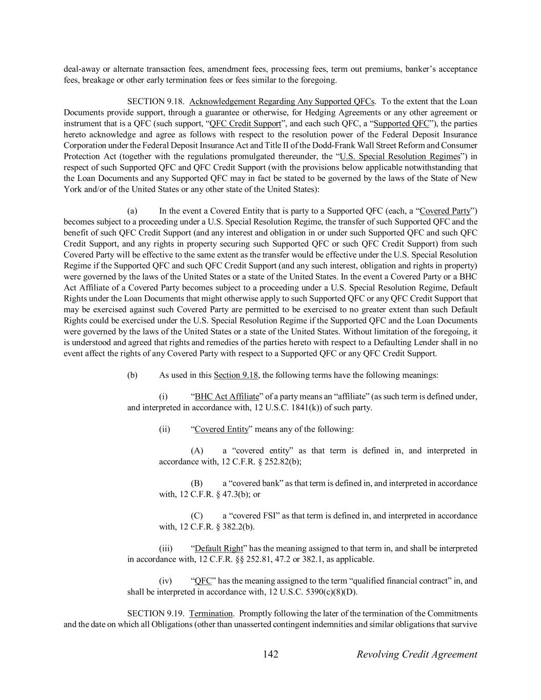 142 Revolving Credit Agreement deal-away or alternate transaction fees, amendment fees, processing fees, term out premiums, banker’s acceptance fees, breakage or other early termination fees or fees similar to the foregoing. SECTION 9.18. Acknowledgement Regarding Any Supported QFCs. To the extent that the Loan Documents provide support, through a guarantee or otherwise, for Hedging Agreements or any other agreement or instrument that is a QFC (such support, “QFC Credit Support”, and each such QFC, a “Supported QFC”), the parties hereto acknowledge and agree as follows with respect to the resolution power of the Federal Deposit Insurance Corporation under the Federal Deposit Insurance Act and Title II of the Dodd-Frank Wall Street Reform and Consumer Protection Act (together with the regulations promulgated thereunder, the “U.S. Special Resolution Regimes”) in respect of such Supported QFC and QFC Credit Support (with the provisions below applicable notwithstanding that the Loan Documents and any Supported QFC may in fact be stated to be governed by the laws of the State of New York and/or of the United States or any other state of the United States): (a) In the event a Covered Entity that is party to a Supported QFC (each, a “Covered Party”) becomes subject to a proceeding under a U.S. Special Resolution Regime, the transfer of such Supported QFC and the benefit of such QFC Credit Support (and any interest and obligation in or under such Supported QFC and such QFC Credit Support, and any rights in property securing such Supported QFC or such QFC Credit Support) from such Covered Party will be effective to the same extent as the transfer would be effective under the U.S. Special Resolution Regime if the Supported QFC and such QFC Credit Support (and any such interest, obligation and rights in property) were governed by the laws of the United States or a state of the United States. In the event a Covered Party or a BHC Act Affiliate of a Covered Party becomes subject to a proceeding under a U.S. Special Resolution Regime, Default Rights under the Loan Documents that might otherwise apply to such Supported QFC or any QFC Credit Support that may be exercised against such Covered Party are permitted to be exercised to no greater extent than such Default Rights could be exercised under the U.S. Special Resolution Regime if the Supported QFC and the Loan Documents were governed by the laws of the United States or a state of the United States. Without limitation of the foregoing, it is understood and agreed that rights and remedies of the parties hereto with respect to a Defaulting Lender shall in no event affect the rights of any Covered Party with respect to a Supported QFC or any QFC Credit Support. (b) As used in this Section 9.18, the following terms have the following meanings: (i) “BHC Act Affiliate” of a party means an “affiliate” (as such term is defined under, and interpreted in accordance with, 12 U.S.C. 1841(k)) of such party. (ii) “Covered Entity” means any of the following: (A) a “covered entity” as that term is defined in, and interpreted in accordance with, 12 C.F.R. § 252.82(b); (B) a “covered bank” as that term is defined in, and interpreted in accordance with, 12 C.F.R. § 47.3(b); or (C) a “covered FSI” as that term is defined in, and interpreted in accordance with, 12 C.F.R. § 382.2(b). (iii) “Default Right” has the meaning assigned to that term in, and shall be interpreted in accordance with, 12 C.F.R. §§ 252.81, 47.2 or 382.1, as applicable. (iv) “QFC” has the meaning assigned to the term “qualified financial contract” in, and shall be interpreted in accordance with, 12 U.S.C. 5390(c)(8)(D). SECTION 9.19. Termination. Promptly following the later of the termination of the Commitments and the date on which all Obligations (other than unasserted contingent indemnities and similar obligations that survive