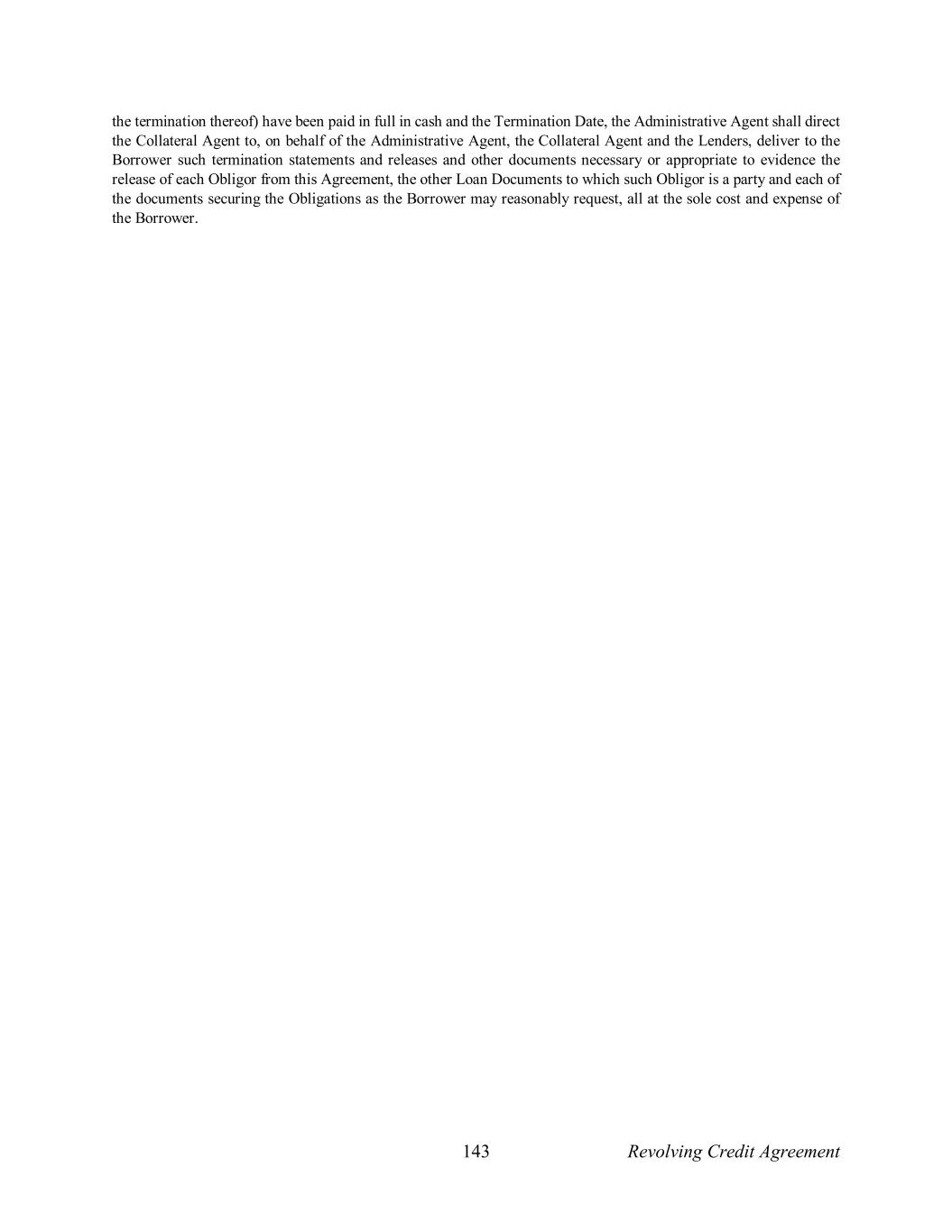 143 Revolving Credit Agreement the termination thereof) have been paid in full in cash and the Termination Date, the Administrative Agent shall direct the Collateral Agent to, on behalf of the Administrative Agent, the Collateral Agent and the Lenders, deliver to the Borrower such termination statements and releases and other documents necessary or appropriate to evidence the release of each Obligor from this Agreement, the other Loan Documents to which such Obligor is a party and each of the documents securing the Obligations as the Borrower may reasonably request, all at the sole cost and expense of the Borrower.