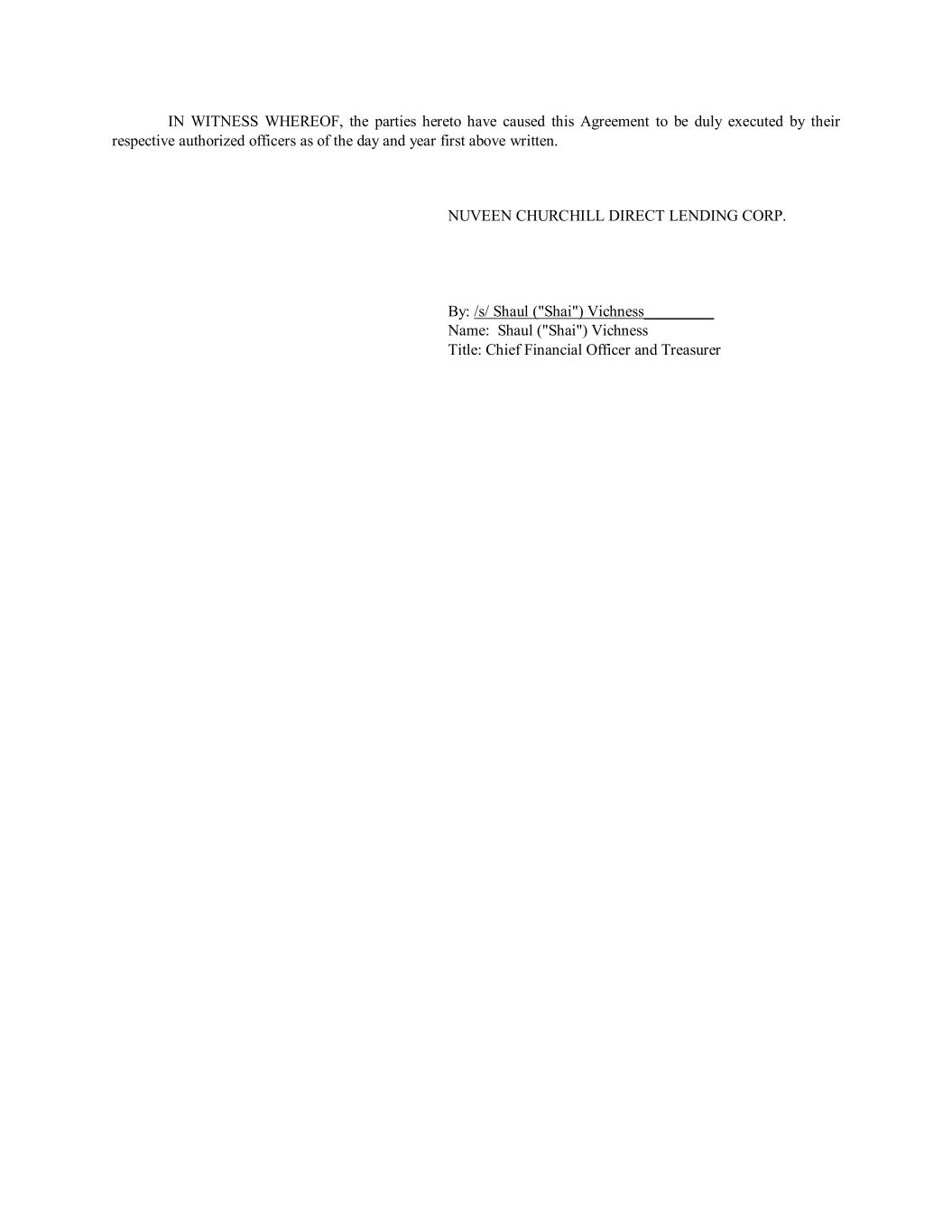 IN WITNESS WHEREOF, the parties hereto have caused this Agreement to be duly executed by their respective authorized officers as of the day and year first above written. NUVEEN CHURCHILL DIRECT LENDING CORP. By: /s/ Shaul ("Shai") Vichness_________ Name: Shaul ("Shai") Vichness Title: Chief Financial Officer and Treasurer