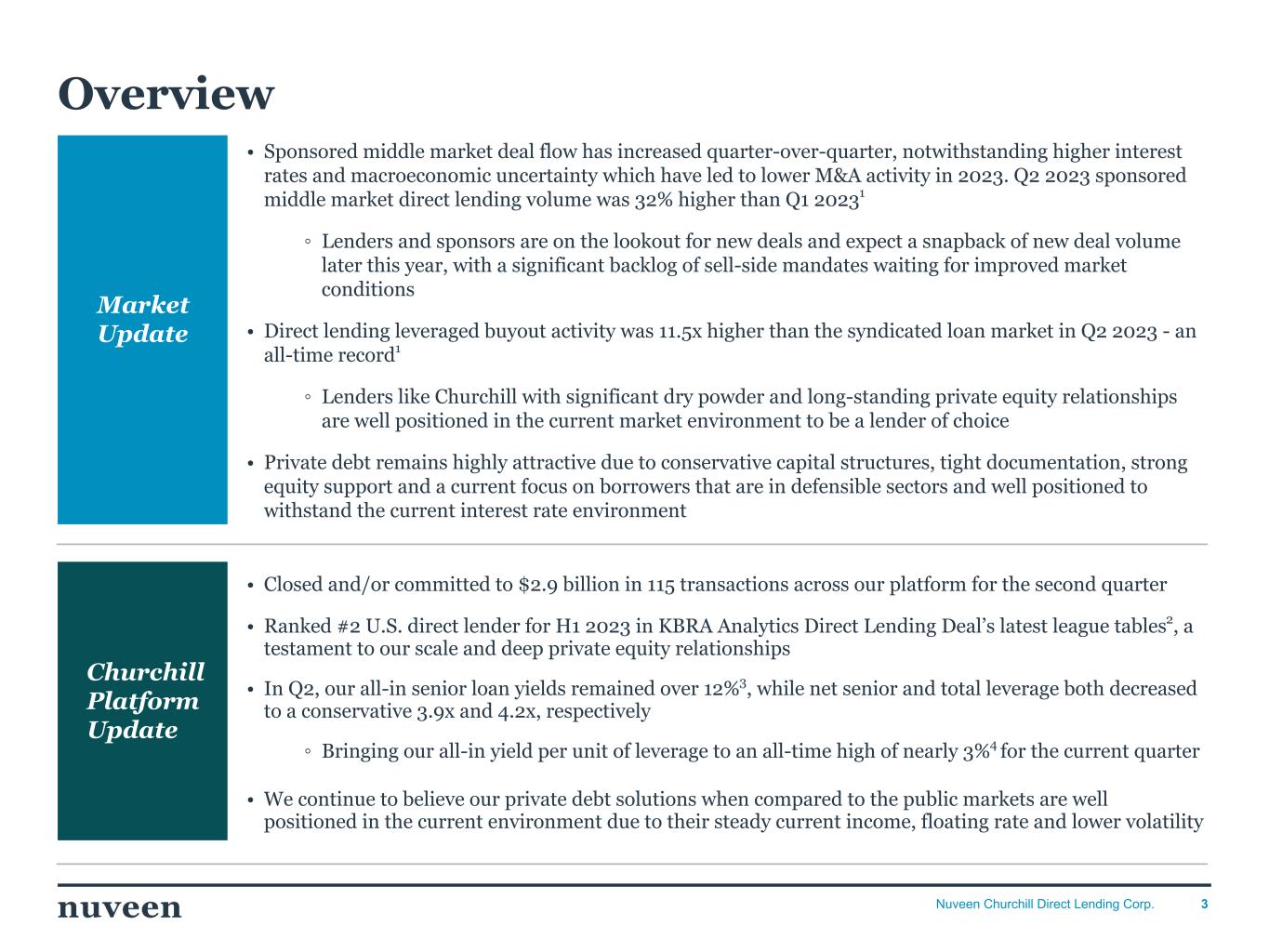2Nuveen Churchill Direct Lending Corp. Disclaimer This presentation is for informational purposes only. It does not convey an offer of any type and is not intended to be, and should not be construed as, an offer to sell, or the solicitation of an offer to buy, any securities of Nuveen Churchill Direct Lending Corp. (the “Company,” “NCDLC,” “we,” “us” or “our”). Any such offering can be made only at the time a qualified offeree receives a confidential private placement memorandum and other operative documents which contain significant details with respect to risks and should be carefully read. In addition, the information in this presentation is qualified in its entirety by reference to all of the information in the Company’s confidential private placement memorandum and the Company’s public filings with the Securities and Exchange Commission (the “SEC”), including without limitation, the risk factors. Nothing in this presentation constitutes investment advice. The Company’s securities have not been registered under the Securities Act of 1933 or listed on any securities exchange. You or your clients may lose money by investing in the Company. The Company is not intended to be a complete investment program and, due to the uncertainty inherent in all investments, there can be no assurance that the Company will achieve its investment objectives. The information contained herein is not intended to provide, and should not be relied upon for, accounting, legal or tax advice or investment recommendations. Prospective investors should also seek advice from their own independent tax, accounting, financial, investment and legal advisors to properly assess the merits and risks associated with an investment in the Company in light of their own financial condition and other circumstances. These materials and the presentations of which they are a part, and the summaries contained herein, do not purport to be complete and no obligation to update or otherwise revise such information is being assumed. Nothing shall be relied upon as a promise or representation as to the future performance of the Company. Such information is qualified in its entirety by reference to the more detailed discussions contained elsewhere in the Company’s confidential private placement memorandum and public filings with the SEC. An investment in the Company is speculative and involves a high degree of risk. There can be no guarantee that the Company’s investment objective will be achieved. The Company may engage in other investment practices that may increase the risk of investment loss. An investor could lose all or substantially all of his, her or its investment. The Company may not provide periodic valuation information to investors, and there may be delays in distributing important tax information. The Company’s fees and expenses may be considered high and, as a result, such fees and expenses may offset the Company’s profits. For a summary of certain of these and other risks, please see the Company’s confidential private placement memorandum and public filings with the SEC. There is no guarantee that any of the estimates, targets or projections illustrated in these materials and any presentation of which they form a part will be achieved. Any references herein to any of the Company’s past or present investments or its past or present performance, have been provided for illustrative purposes only. It should not be assumed that these investments were or will be profitable or that any future investments by the Company will be profitable or will equal the performance of these investments. Diversification of an investor’s portfolio does not assure a profit or protect against loss in a declining market. Opinions expressed reflect the current opinions of Churchill as of the date appearing in the materials only and are based on Churchill’s opinions of the current market environment, which is subject to change. Certain information contained in the materials discusses general market activity, industry or sector trends, or other broad-based economic, market or political conditions and should not be construed as research or investment advice. There can be no assurances that any of the trends described herein will continue or will not reverse. Past events and trends do not imply, predict or guarantee, and are not necessarily indicative of, future events or results. This presentation contains forward-looking statements that involve substantial risks and uncertainties. Such statements involve known and unknown risks, uncertainties and other factors and undue reliance should not be placed thereon. These forward-looking statements are not historical facts, but rather are based on current expectations, estimates and projections about the Company, our current and prospective portfolio investments, our industry, our beliefs and opinions, and our assumptions. Words such as “anticipates,” “expects,” “intends,” “plans,” “will,” “may,” “continue,” “believes,” “seeks,” “estimates,” “would,” “could,” “should,” “targets,” “projects,” “outlook,” “potential,” “predicts” and variations of these words and similar expressions are intended to identify forward- looking statements. These statements are not guarantees of future performance and are subject to risks, uncertainties and other factors that are outlined in the Company’s confidential private placement memorandum and public filings with the SEC, some of which are beyond our control and difficult to predict and could cause actual results to differ materially from those expressed or forecasted in the forward-looking statements, including, without limitation: changes in the markets in which the Company invests and changes in financial and lending markets generally; an economic downturn and its impact on the ability of the Company's portfolio companies to operate and the investment opport