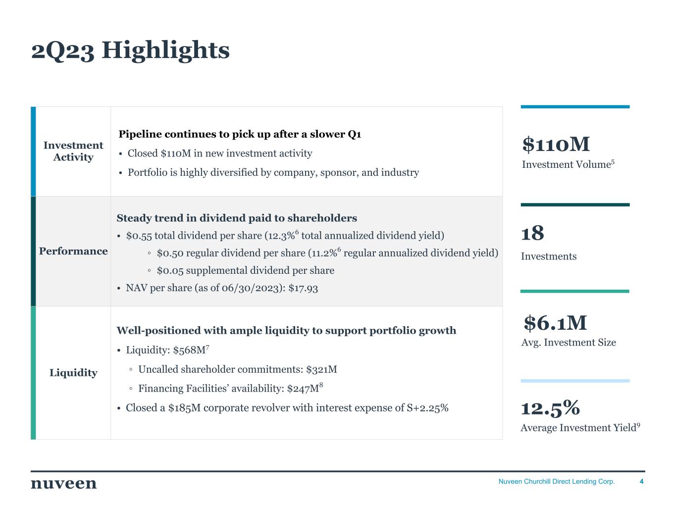 3Nuveen Churchill Direct Lending Corp. • Closed and/or committed to $2.9 billion in 115 transactions across our platform for the second quarter • Ranked #2 U.S. direct lender for H1 2023 in KBRA Analytics Direct Lending Deal’s latest league tables2, a testament to our scale and deep private equity relationships • In Q2, our all-in senior loan yields remained over 12%3, while net senior and total leverage both decreased to a conservative 3.9x and 4.2x, respectively ◦ Bringing our all-in yield per unit of leverage to an all-time high of nearly 3%4 for the current quarter • We continue to believe our private debt solutions when compared to the public markets are well positioned in the current environment due to their steady current income, floating rate and lower volatility • Sponsored middle market deal flow has increased quarter-over-quarter, notwithstanding higher interest rates and macroeconomic uncertainty which have led to lower M&A activity in 2023. Q2 2023 sponsored middle market direct lending volume was 32% higher than Q1 20231 ◦ Lenders and sponsors are on the lookout for new deals and expect a snapback of new deal volume later this year, with a significant backlog of sell-side mandates waiting for improved market conditions • Direct lending leveraged buyout activity was 11.5x higher than the syndicated loan market in Q2 2023 - an all-time record1 ◦ Lenders like Churchill with significant dry powder and long-standing private equity relationships are well positioned in the current market environment to be a lender of choice • Private debt remains highly attractive due to conservative capital structures, tight documentation, strong equity support and a current focus on borrowers that are in defensible sectors and well positioned to withstand the current interest rate environment Overview Market Update Churchill Platform Update