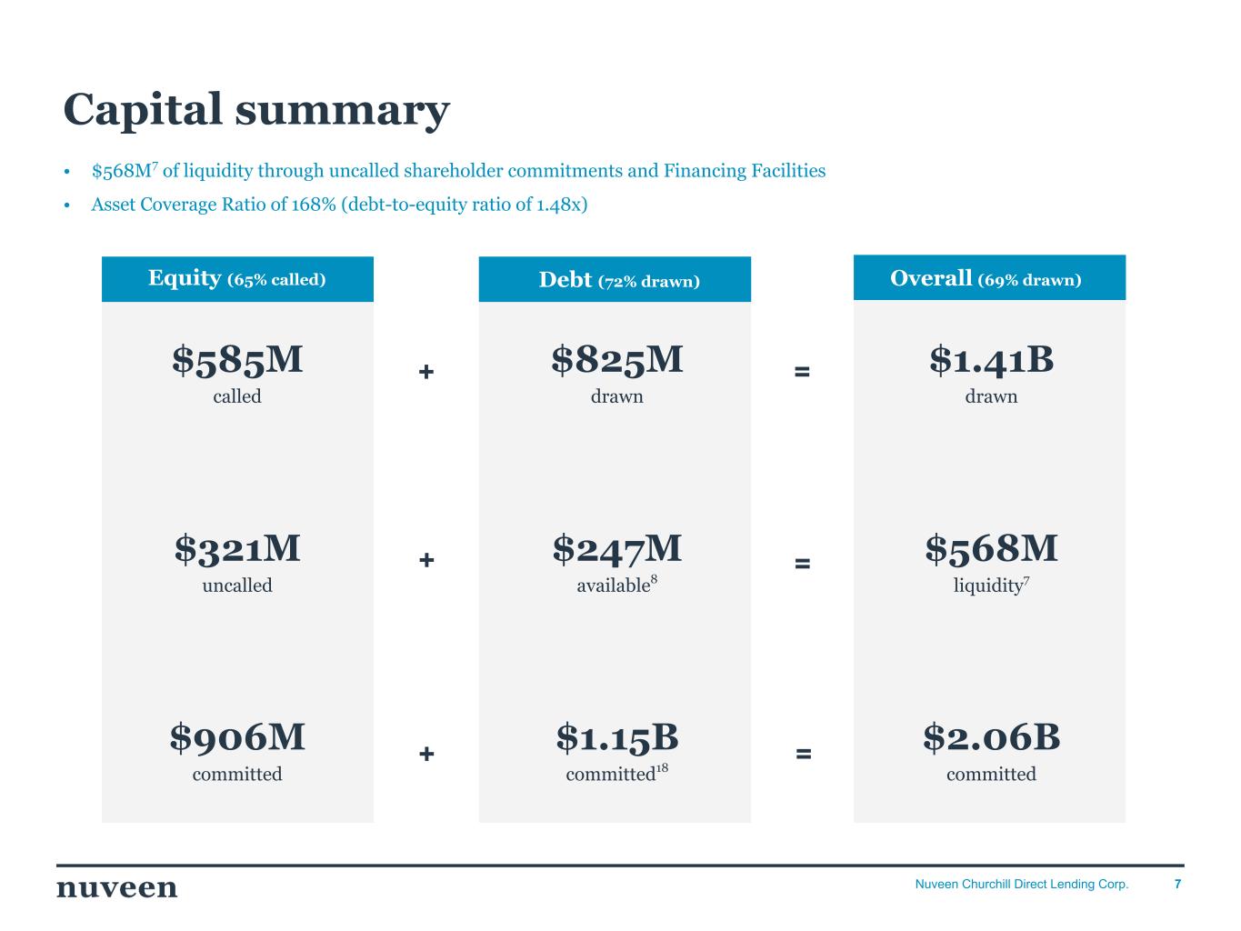6Nuveen Churchill Direct Lending Corp. Services: Business Healthcare & Pharmaceuticals High Tech Industries Automotive Beverage, Food & Tobacco Capital Equipment Services: Consumer Banking, Finance, Insurance, Real Estate Consumer Goods: Non-durable Containers, Packaging & Glass Others (13) First Lien Term Loan (including DDTLs) Subordinated Debt Equity Portfolio overview Average Asset Yield14 11.7% Average Position Size15 Key Portfolio Statistics 20.7 % 10.4 % 9.3 % 5.7 % 5.6 % 5.5 % 5.4 % 5.0 % 4.0 % 3.7 % 24.6 % 86.7% 11.5% 1.8% 1787% First Lien Portfolio composition by investment type16 Portfolio diversification by Moody’s Industry Investment Portfolio at Fair Value13 $1.4B Portfolio Companies 161 PLEASE DO NOT TOUCH THE FORMATTING (MOVE AROUND BOXES, CHANGE CHARTS ETC.) THANK YOU!!! <1%