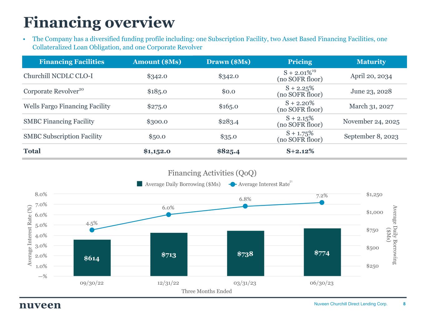 7Nuveen Churchill Direct Lending Corp. Capital summary Equity (65% called) $906M committed $585M called $321M uncalled Debt (72% drawn) $1.15B committed18 $825M drawn $247M available8 Overall (69% drawn) $568M liquidity7 + $2.06B committed $1.41B drawn = • $568M7 of liquidity through uncalled shareholder commitments and Financing Facilities • Asset Coverage Ratio of 168% (debt-to-equity ratio of 1.48x) + = + = PLEASE DO NOT TOUCH THE FORMATTING (MOVE AROUND BOXES, CHANGE CHARTS ETC.) THANK YOU!!!
