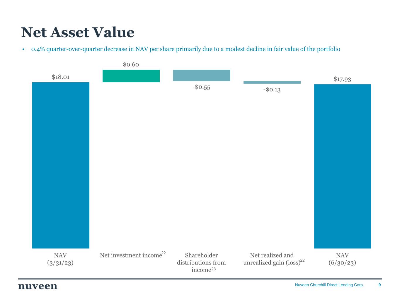 8Nuveen Churchill Direct Lending Corp. • The Company has a diversified funding profile including: one Subscription Facility, two Asset Based Financing Facilities, one Collateralized Loan Obligation, and one Corporate Revolver Financing Facilities Amount ($Ms) Drawn ($Ms) Pricing Maturity Churchill NCDLC CLO-I $342.0 $342.0 S + 2.01%19 (no SOFR floor) April 20, 2034 Corporate Revolver20 $185.0 $0.0 S + 2.25% (no SOFR floor) June 23, 2028 Wells Fargo Financing Facility $275.0 $165.0 S + 2.20% (no SOFR floor) March 31, 2027 SMBC Financing Facility $300.0 $283.4 S + 2.15% (no SOFR floor) November 24, 2025 SMBC Subscription Facility $50.0 $35.0 S + 1.75% (no SOFR floor) September 8, 2023 Total $1,152.0 $825.4 S+2.12% Financing overview Three Months Ended A ve ra ge I n te re st R at e (% ) A verage D aily B orrow in g ($ M s) Financing Activities (QoQ) $614 $713 $738 $774 4.5% 6.0% 6.8% 7.2% Average Daily Borrowing ($Ms) Average Interest Rate 09/30/22 12/31/22 03/31/23 06/30/23 —% 1.0% 2.0% 3.0% 4.0% 5.0% 6.0% 7.0% 8.0% $250 $500 $750 $1,000 $1,250 21 PLEASE DO NOT TOUCH THE FORMATTING (MOVE AROUND BOXES, CHANGE CHARTS ETC.) THANK YOU!!!