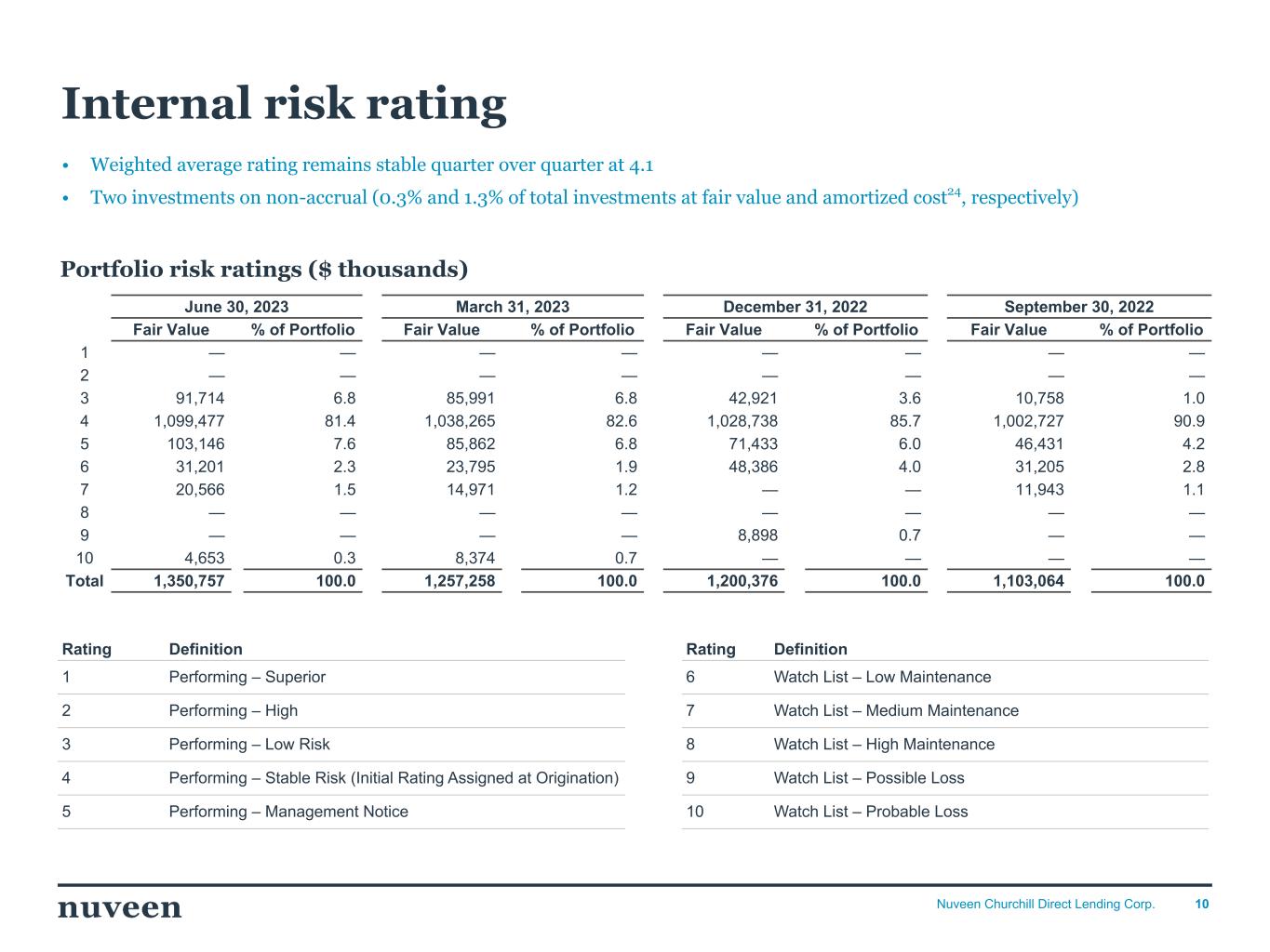 9Nuveen Churchill Direct Lending Corp. Net Asset Value $18.01 $0.60 -$0.55 -$0.13 $17.93 NAV (3/31/23) Net investment income Shareholder distributions from income Net realized and unrealized gain (loss) NAV (6/30/23) 23 22 PLEASE DO NOT TOUCH THE FORMATTING (MOVE AROUND BOXES, CHANGE CHARTS ETC.) THANK YOU!!! 22 • 0.4% quarter-over-quarter decrease in NAV per share primarily due to a modest decline in fair value of the portfolio