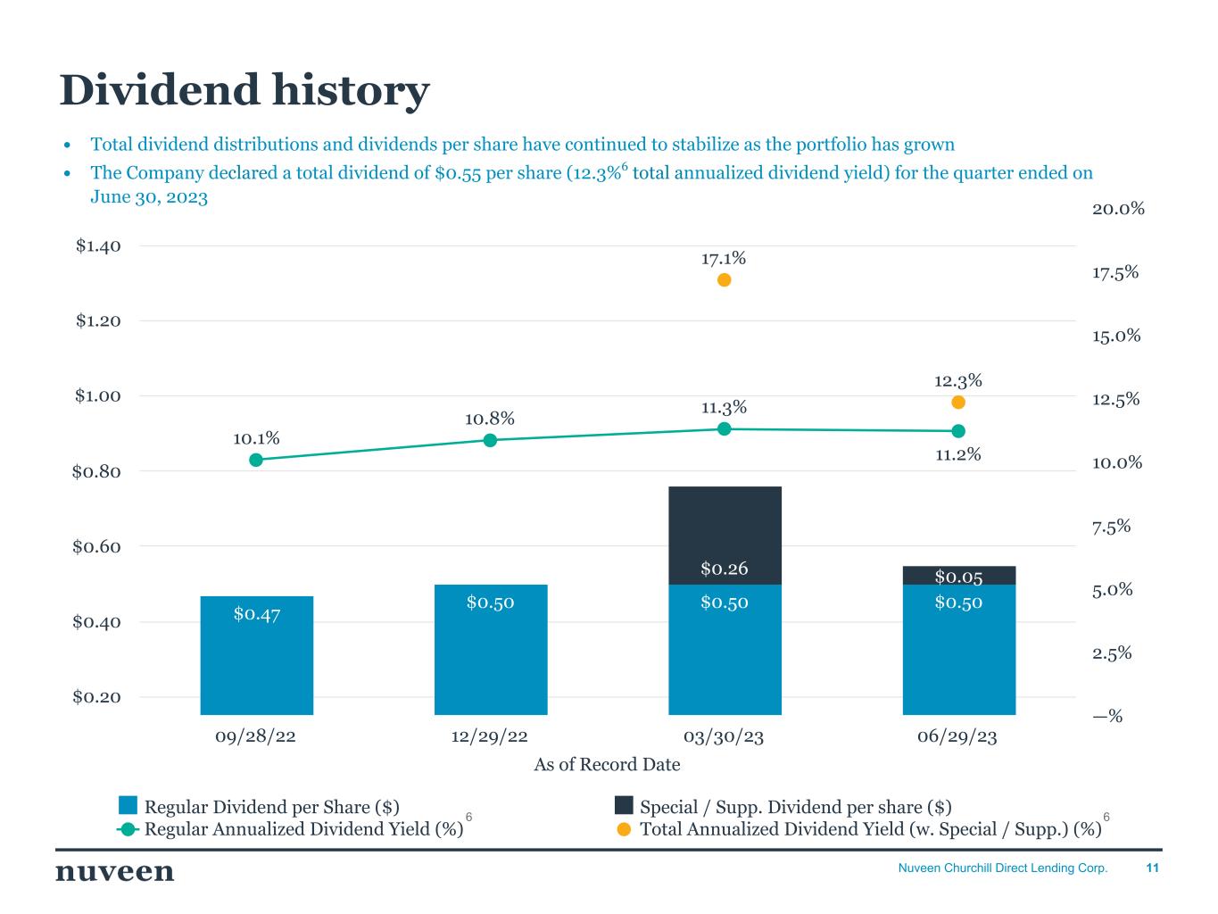 10Nuveen Churchill Direct Lending Corp. Internal risk rating Portfolio risk ratings ($ thousands) June 30, 2023 March 31, 2023 December 31, 2022 September 30, 2022 Fair Value % of Portfolio Fair Value % of Portfolio Fair Value % of Portfolio Fair Value % of Portfolio 1 — — — — — — — — 2 — — — — — — — — 3 91,714 6.8 85,991 6.8 42,921 3.6 10,758 1.0 4 1,099,477 81.4 1,038,265 82.6 1,028,738 85.7 1,002,727 90.9 5 103,146 7.6 85,862 6.8 71,433 6.0 46,431 4.2 6 31,201 2.3 23,795 1.9 48,386 4.0 31,205 2.8 7 20,566 1.5 14,971 1.2 — — 11,943 1.1 8 — — — — — — — — 9 — — — — 8,898 0.7 — — 10 4,653 0.3 8,374 0.7 — — — — Total 1,350,757 100.0 1,257,258 100.0 1,200,376 100.0 1,103,064 100.0 Rating Definition Rating Definition 1 Performing – Superior 6 Watch List – Low Maintenance 2 Performing – High 7 Watch List – Medium Maintenance 3 Performing – Low Risk 8 Watch List – High Maintenance 4 Performing – Stable Risk (Initial Rating Assigned at Origination) 9 Watch List – Possible Loss 5 Performing – Management Notice 10 Watch List – Probable Loss • Weighted average rating remains stable quarter over quarter at 4.1 • Two investments on non-accrual (0.3% and 1.3% of total investments at fair value and amortized cost24, respectively)