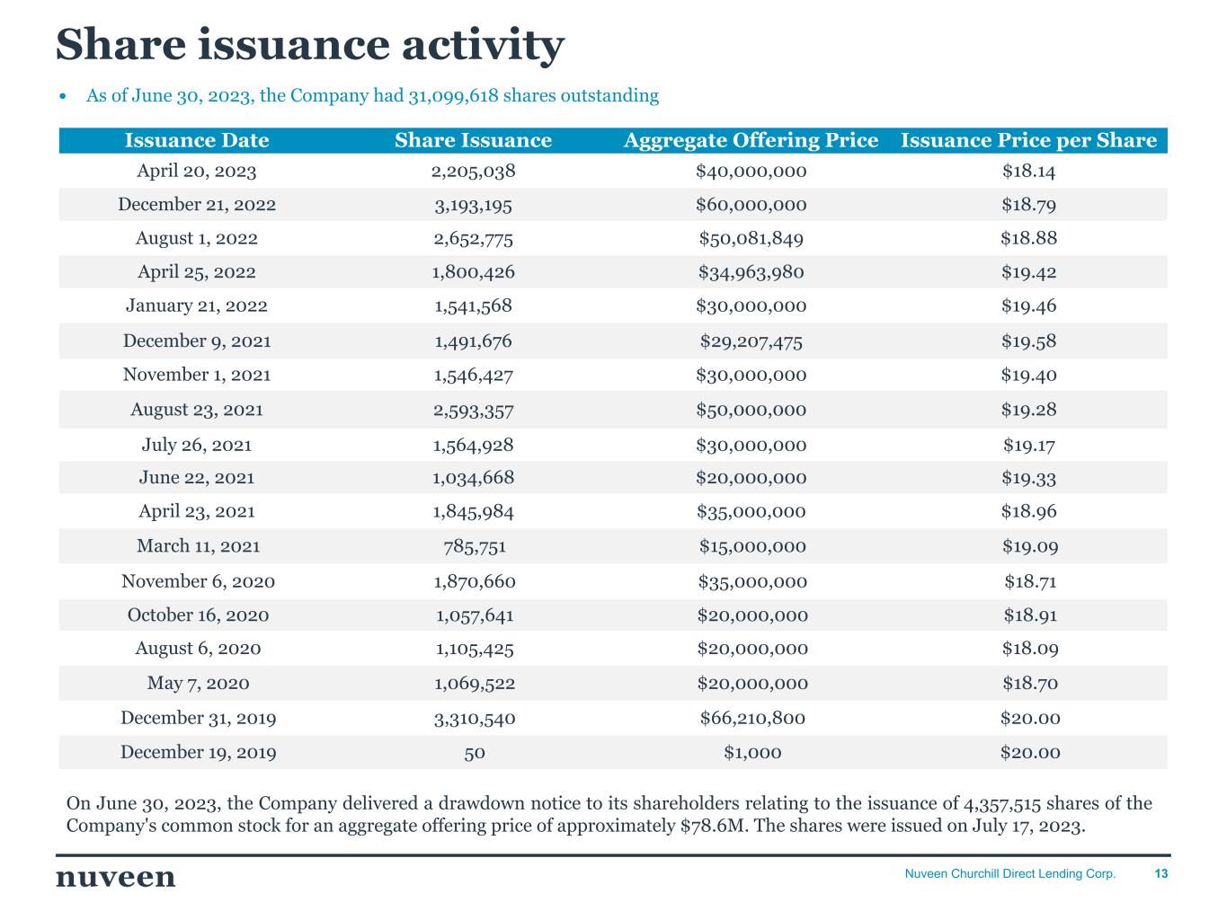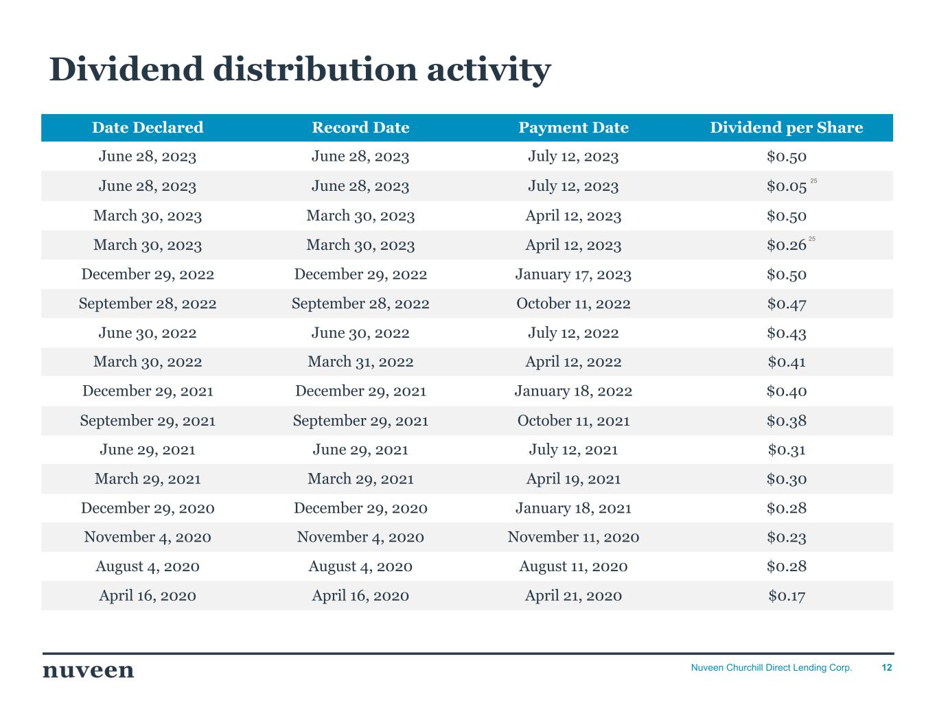 12Nuveen Churchill Direct Lending Corp. Dividend distribution activity Date Declared Record Date Payment Date Dividend per Share June 28, 2023 June 28, 2023 July 12, 2023 $0.50 June 28, 2023 June 28, 2023 July 12, 2023 $0.05 March 30, 2023 March 30, 2023 April 12, 2023 $0.50 March 30, 2023 March 30, 2023 April 12, 2023 $0.26 December 29, 2022 December 29, 2022 January 17, 2023 $0.50 September 28, 2022 September 28, 2022 October 11, 2022 $0.47 June 30, 2022 June 30, 2022 July 12, 2022 $0.43 March 30, 2022 March 31, 2022 April 12, 2022 $0.41 December 29, 2021 December 29, 2021 January 18, 2022 $0.40 September 29, 2021 September 29, 2021 October 11, 2021 $0.38 June 29, 2021 June 29, 2021 July 12, 2021 $0.31 March 29, 2021 March 29, 2021 April 19, 2021 $0.30 December 29, 2020 December 29, 2020 January 18, 2021 $0.28 November 4, 2020 November 4, 2020 November 11, 2020 $0.23 August 4, 2020 August 4, 2020 August 11, 2020 $0.28 April 16, 2020 April 16, 2020 April 21, 2020 $0.17 25 25