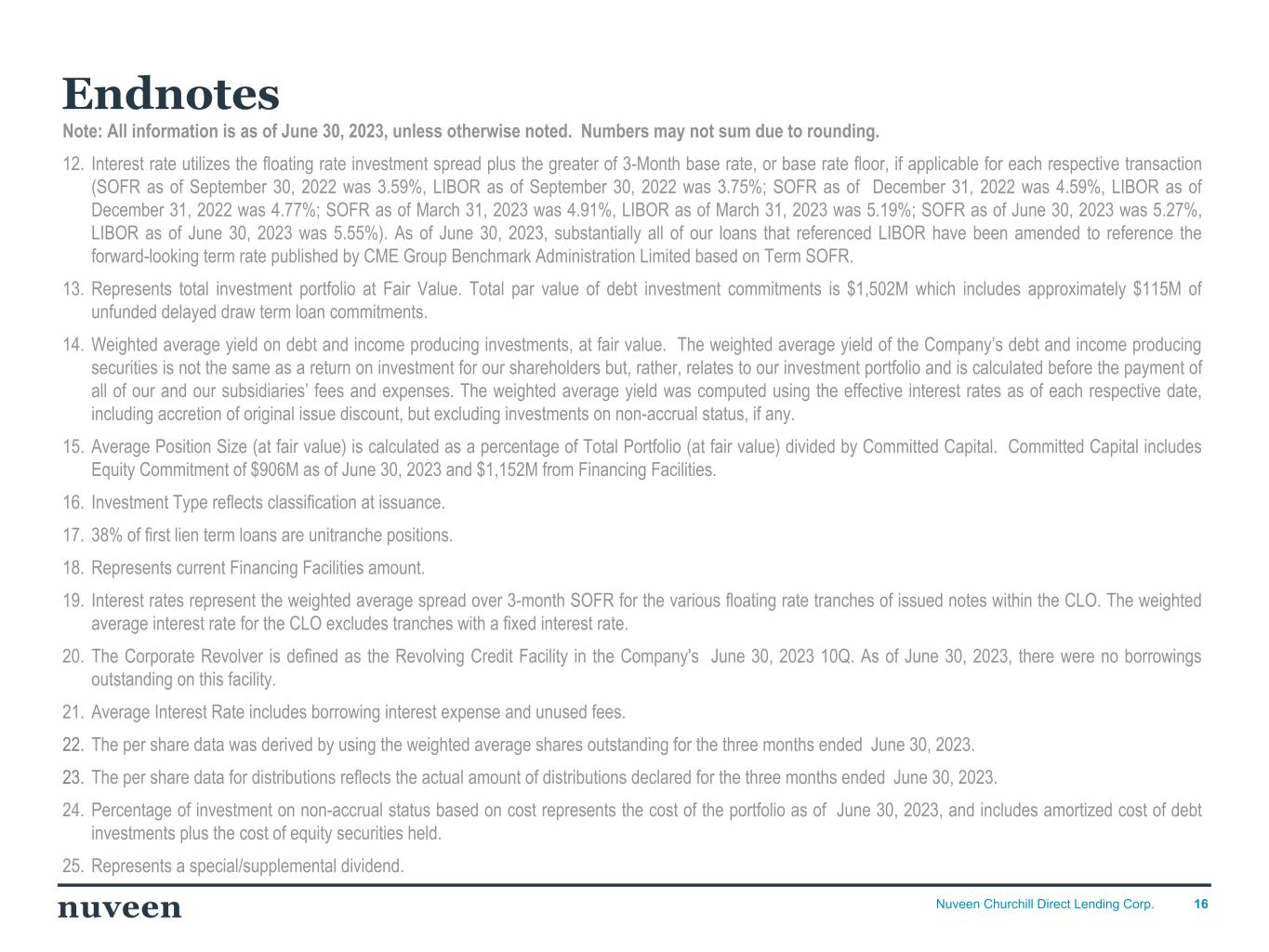15Nuveen Churchill Direct Lending Corp. Note: All information is as of June 30, 2023, unless otherwise noted. Numbers may not sum due to rounding. 1. Source: Refinitiv LPC’s 2Q23 Sponsored Middle Market Private Deals Analysis (July 2023). 2. Source: Direct Lending Deals’ Lender Mandates; Rankings determined by Direct Lending Deals based on total number of eligible transactions from January 1, 2023 to June 30, 2023. Eligible transactions are U.S. non-syndicated loans to private equity-backed companies. The league table comprises top 60 lenders. 3. Utilizes the greater of 3-Month base rate, or base rate floor, if applicable for each respective transaction (3-Month SOFR as of June 30, 2023 was 5.27%; 3-Month LIBOR as of June 30, 2023 was 5.55%). 4. Churchill’s all-in yield (“AIY”) per unit of leverage was calculated on an investment-by-investment basis of AIY (spread + floor on base rate at the time of origination + OID/3) over first lien net leverage, the leverage applicable to each loan. These AIYs/unit of leverage were then weighted by their committed capital on an annual basis. For 2023 data, AIY was calculated using 3-Month SOFR as of June 30, 2023 of 5.27% rather than the rate at the time of origination. This analysis does not incorporate credit spread adjustments, which can account for an additional 15 basis points on average. Portfolio yield is only one component of expected performance and is not and should not be viewed as a statement of the future performance of the strategy. Metrics provided reflect the overall Churchill senior loan platform and do not reflect the Company’s standalone portfolio. 5. Reflects the par amount of total new investment activity for the three months ended June 30, 2023. Investment Activity does not include draws on existing Delayed Draw Term Loans and partial paydowns. 6. Regular Annualized Dividend yield is the Annualized Regular Dividend per share divided by the NAV per share as of quarter end. Total Annualized Dividend yield of 17.1% for the quarter ended March 31, 2023 includes the Regular Dividend of $0.50 per share, the Supplemental Dividend of $0.05 per share and the Special Dividend of $0.21 per share divided by the NAV per share as of March 31, 2023. Total Annualized Dividend yield of 12.3% for the quarter ended June 30, 2023 includes the Regular Dividend of $0.50 per share and the Supplemental Dividend of $0.05 per share divided by the NAV per share as of June 30, 2023. 7. Represents the sum of uncalled shareholder commitments of $321M and Financing Facilities availability of $247M. 8. Available for borrowing based on the computation of collateral to support the borrowings and subject to compliance with applicable covenants and financial ratios. 9. Represents the unlevered weighted average spread plus the greater of 3-Month base rate, or base rate floor, adjusted for credit spread, if applicable, plus amortization of OID over 3-year assumed loan life. 3-Month SOFR as of June 30, 2023 was 5.27%; 3-Month LIBOR as of June 30, 2023 was 5.55%. 10. Average Spread is calculated based off of par amount. 11. Average Coupon is calculated based off of par amount. Average coupon includes 28% cash coupon and 72% PIK. Endnotes