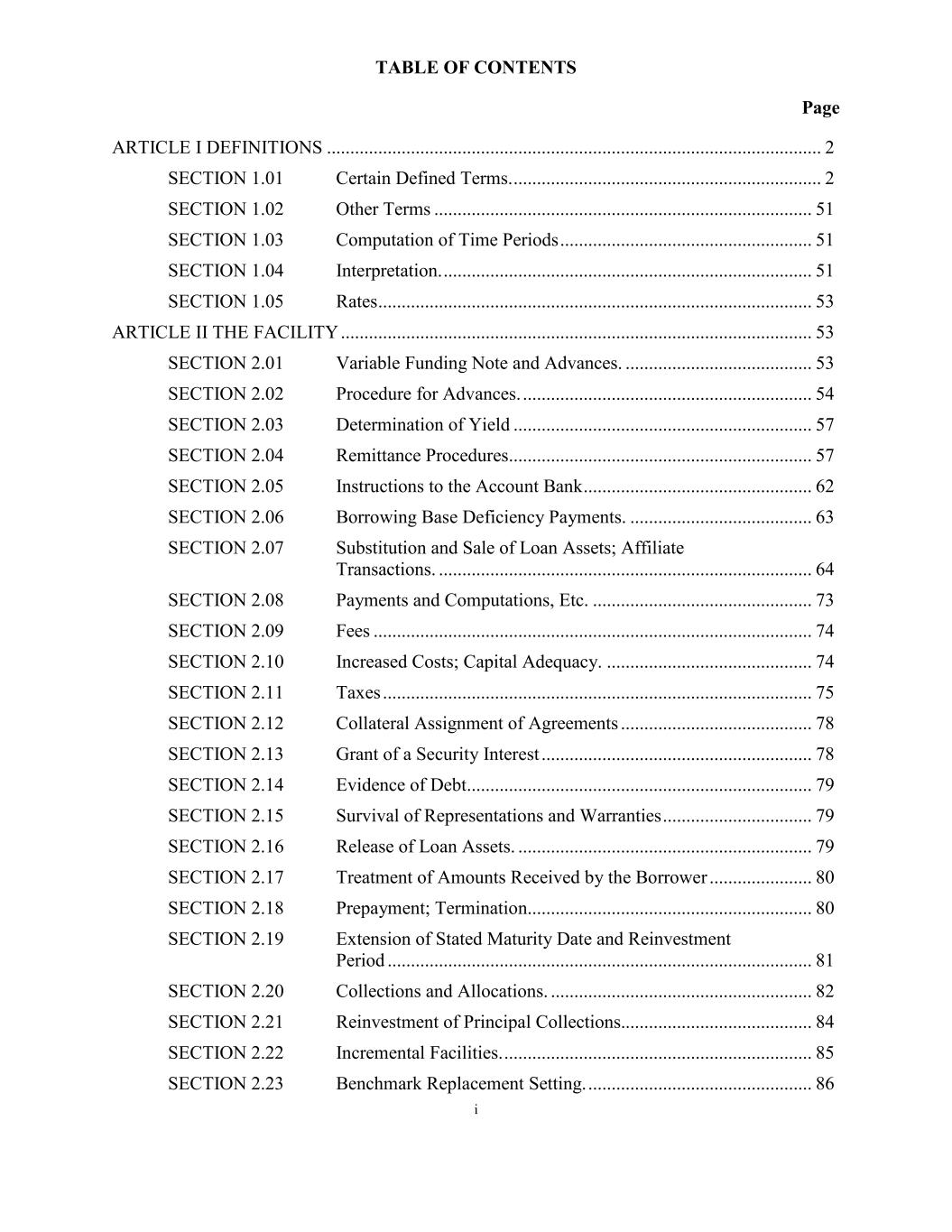 TABLE OF CONTENTS Page i ARTICLE I DEFINITIONS .......................................................................................................... 2 SECTION 1.01 Certain Defined Terms. .................................................................. 2 SECTION 1.02 Other Terms ................................................................................. 51 SECTION 1.03 Computation of Time Periods ...................................................... 51 SECTION 1.04 Interpretation. ............................................................................... 51 SECTION 1.05 Rates ............................................................................................. 53 ARTICLE II THE FACILITY ..................................................................................................... 53 SECTION 2.01 Variable Funding Note and Advances. ........................................ 53 SECTION 2.02 Procedure for Advances. .............................................................. 54 SECTION 2.03 Determination of Yield ................................................................ 57 SECTION 2.04 Remittance Procedures................................................................. 57 SECTION 2.05 Instructions to the Account Bank ................................................. 62 SECTION 2.06 Borrowing Base Deficiency Payments. ....................................... 63 SECTION 2.07 Substitution and Sale of Loan Assets; Affiliate Transactions. ................................................................................ 64 SECTION 2.08 Payments and Computations, Etc. ............................................... 73 SECTION 2.09 Fees .............................................................................................. 74 SECTION 2.10 Increased Costs; Capital Adequacy. ............................................ 74 SECTION 2.11 Taxes ............................................................................................ 75 SECTION 2.12 Collateral Assignment of Agreements ......................................... 78 SECTION 2.13 Grant of a Security Interest .......................................................... 78 SECTION 2.14 Evidence of Debt.......................................................................... 79 SECTION 2.15 Survival of Representations and Warranties ................................ 79 SECTION 2.16 Release of Loan Assets. ............................................................... 79 SECTION 2.17 Treatment of Amounts Received by the Borrower ...................... 80 SECTION 2.18 Prepayment; Termination............................................................. 80 SECTION 2.19 Extension of Stated Maturity Date and Reinvestment Period ........................................................................................... 81 SECTION 2.20 Collections and Allocations. ........................................................ 82 SECTION 2.21 Reinvestment of Principal Collections......................................... 84 SECTION 2.22 Incremental Facilities. .................................................................. 85 SECTION 2.23 Benchmark Replacement Setting. ................................................ 86