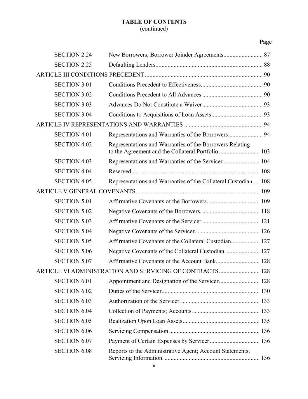 TABLE OF CONTENTS (continued) Page ii SECTION 2.24 New Borrowers; Borrower Joinder Agreements. ......................... 87 SECTION 2.25 Defaulting Lenders....................................................................... 88 ARTICLE III CONDITIONS PRECEDENT .............................................................................. 90 SECTION 3.01 Conditions Precedent to Effectiveness......................................... 90 SECTION 3.02 Conditions Precedent to All Advances ........................................ 90 SECTION 3.03 Advances Do Not Constitute a Waiver ........................................ 93 SECTION 3.04 Conditions to Acquisitions of Loan Assets .................................. 93 ARTICLE IV REPRESENTATIONS AND WARRANTIES .................................................... 94 SECTION 4.01 Representations and Warranties of the Borrowers ....................... 94 SECTION 4.02 Representations and Warranties of the Borrowers Relating to the Agreement and the Collateral Portfolio ........................... 103 SECTION 4.03 Representations and Warranties of the Servicer ........................ 104 SECTION 4.04 Reserved. .................................................................................... 108 SECTION 4.05 Representations and Warranties of the Collateral Custodian .... 108 ARTICLE V GENERAL COVENANTS .................................................................................. 109 SECTION 5.01 Affirmative Covenants of the Borrowers. .................................. 109 SECTION 5.02 Negative Covenants of the Borrowers. ...................................... 118 SECTION 5.03 Affirmative Covenants of the Servicer. ..................................... 121 SECTION 5.04 Negative Covenants of the Servicer. .......................................... 126 SECTION 5.05 Affirmative Covenants of the Collateral Custodian. .................. 127 SECTION 5.06 Negative Covenants of the Collateral Custodian. ...................... 127 SECTION 5.07 Affirmative Covenants of the Account Bank ............................. 128 ARTICLE VI ADMINISTRATION AND SERVICING OF CONTRACTS ........................... 128 SECTION 6.01 Appointment and Designation of the Servicer. .......................... 128 SECTION 6.02 Duties of the Servicer................................................................. 130 SECTION 6.03 Authorization of the Servicer. .................................................... 133 SECTION 6.04 Collection of Payments; Accounts. ............................................ 133 SECTION 6.05 Realization Upon Loan Assets ................................................... 135 SECTION 6.06 Servicing Compensation ............................................................ 136 SECTION 6.07 Payment of Certain Expenses by Servicer ................................. 136 SECTION 6.08 Reports to the Administrative Agent; Account Statements; Servicing Information. ............................................................... 136