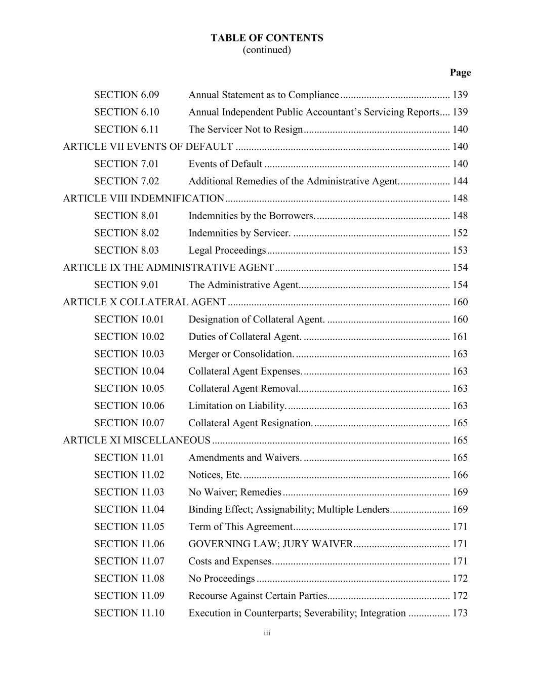 TABLE OF CONTENTS (continued) Page iii SECTION 6.09 Annual Statement as to Compliance .......................................... 139 SECTION 6.10 Annual Independent Public Accountant’s Servicing Reports .... 139 SECTION 6.11 The Servicer Not to Resign ........................................................ 140 ARTICLE VII EVENTS OF DEFAULT .................................................................................. 140 SECTION 7.01 Events of Default ....................................................................... 140 SECTION 7.02 Additional Remedies of the Administrative Agent. ................... 144 ARTICLE VIII INDEMNIFICATION ...................................................................................... 148 SECTION 8.01 Indemnities by the Borrowers. ................................................... 148 SECTION 8.02 Indemnities by Servicer. ............................................................ 152 SECTION 8.03 Legal Proceedings ...................................................................... 153 ARTICLE IX THE ADMINISTRATIVE AGENT ................................................................... 154 SECTION 9.01 The Administrative Agent.......................................................... 154 ARTICLE X COLLATERAL AGENT ..................................................................................... 160 SECTION 10.01 Designation of Collateral Agent. ............................................... 160 SECTION 10.02 Duties of Collateral Agent. ........................................................ 161 SECTION 10.03 Merger or Consolidation. ........................................................... 163 SECTION 10.04 Collateral Agent Expenses. ........................................................ 163 SECTION 10.05 Collateral Agent Removal.......................................................... 163 SECTION 10.06 Limitation on Liability. .............................................................. 163 SECTION 10.07 Collateral Agent Resignation. .................................................... 165 ARTICLE XI MISCELLANEOUS ........................................................................................... 165 SECTION 11.01 Amendments and Waivers. ........................................................ 165 SECTION 11.02 Notices, Etc. ............................................................................... 166 SECTION 11.03 No Waiver; Remedies ................................................................ 169 SECTION 11.04 Binding Effect; Assignability; Multiple Lenders. ...................... 169 SECTION 11.05 Term of This Agreement ............................................................ 171 SECTION 11.06 GOVERNING LAW; JURY WAIVER..................................... 171 SECTION 11.07 Costs and Expenses. ................................................................... 171 SECTION 11.08 No Proceedings .......................................................................... 172 SECTION 11.09 Recourse Against Certain Parties............................................... 172 SECTION 11.10 Execution in Counterparts; Severability; Integration ................ 173
