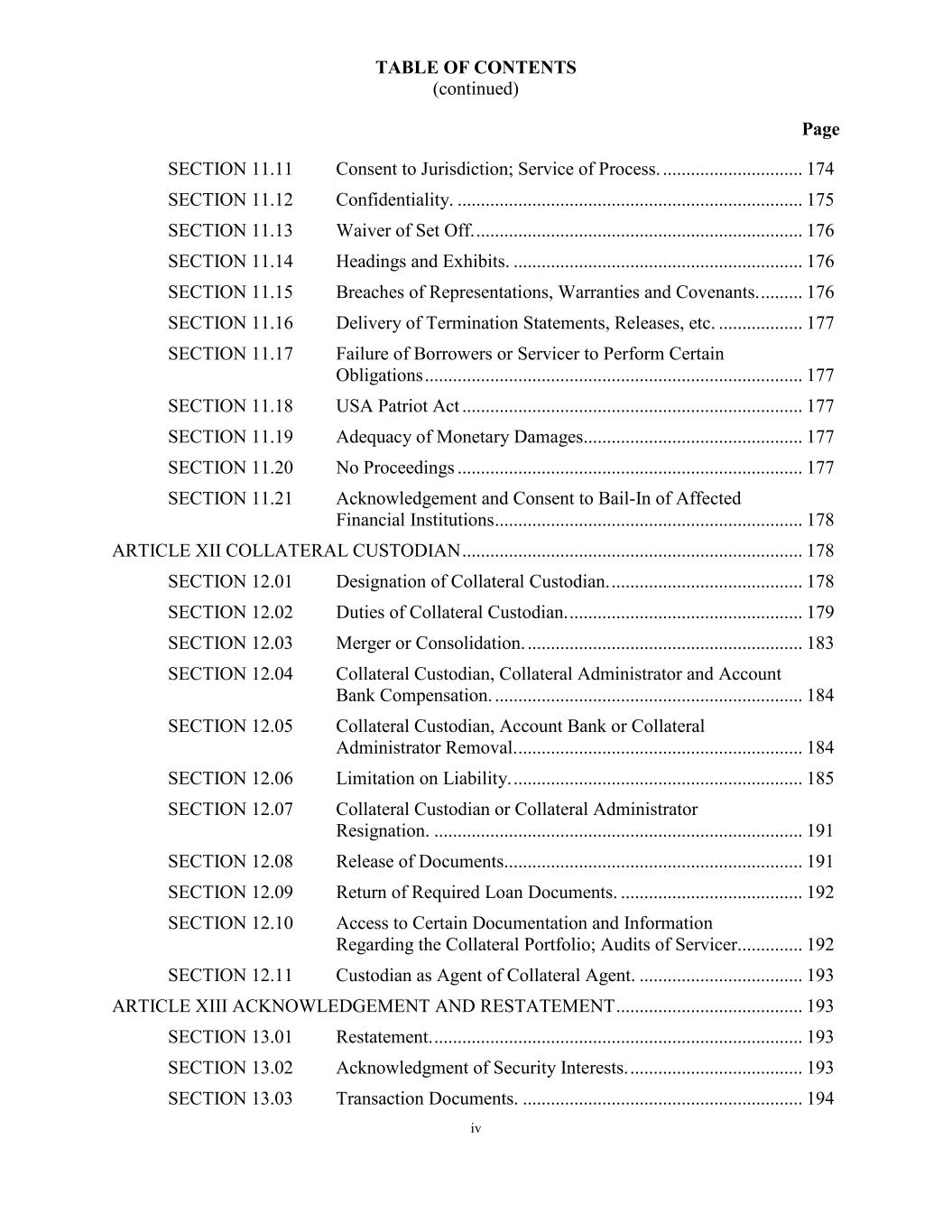 TABLE OF CONTENTS (continued) Page iv SECTION 11.11 Consent to Jurisdiction; Service of Process. .............................. 174 SECTION 11.12 Confidentiality. .......................................................................... 175 SECTION 11.13 Waiver of Set Off. ...................................................................... 176 SECTION 11.14 Headings and Exhibits. .............................................................. 176 SECTION 11.15 Breaches of Representations, Warranties and Covenants. ......... 176 SECTION 11.16 Delivery of Termination Statements, Releases, etc. .................. 177 SECTION 11.17 Failure of Borrowers or Servicer to Perform Certain Obligations ................................................................................. 177 SECTION 11.18 USA Patriot Act ......................................................................... 177 SECTION 11.19 Adequacy of Monetary Damages............................................... 177 SECTION 11.20 No Proceedings .......................................................................... 177 SECTION 11.21 Acknowledgement and Consent to Bail-In of Affected Financial Institutions .................................................................. 178 ARTICLE XII COLLATERAL CUSTODIAN ......................................................................... 178 SECTION 12.01 Designation of Collateral Custodian. ......................................... 178 SECTION 12.02 Duties of Collateral Custodian. .................................................. 179 SECTION 12.03 Merger or Consolidation. ........................................................... 183 SECTION 12.04 Collateral Custodian, Collateral Administrator and Account Bank Compensation. .................................................................. 184 SECTION 12.05 Collateral Custodian, Account Bank or Collateral Administrator Removal. ............................................................. 184 SECTION 12.06 Limitation on Liability. .............................................................. 185 SECTION 12.07 Collateral Custodian or Collateral Administrator Resignation. ............................................................................... 191 SECTION 12.08 Release of Documents................................................................ 191 SECTION 12.09 Return of Required Loan Documents. ....................................... 192 SECTION 12.10 Access to Certain Documentation and Information Regarding the Collateral Portfolio; Audits of Servicer.............. 192 SECTION 12.11 Custodian as Agent of Collateral Agent. ................................... 193 ARTICLE XIII ACKNOWLEDGEMENT AND RESTATEMENT ........................................ 193 SECTION 13.01 Restatement. ............................................................................... 193 SECTION 13.02 Acknowledgment of Security Interests. ..................................... 193 SECTION 13.03 Transaction Documents. ............................................................ 194