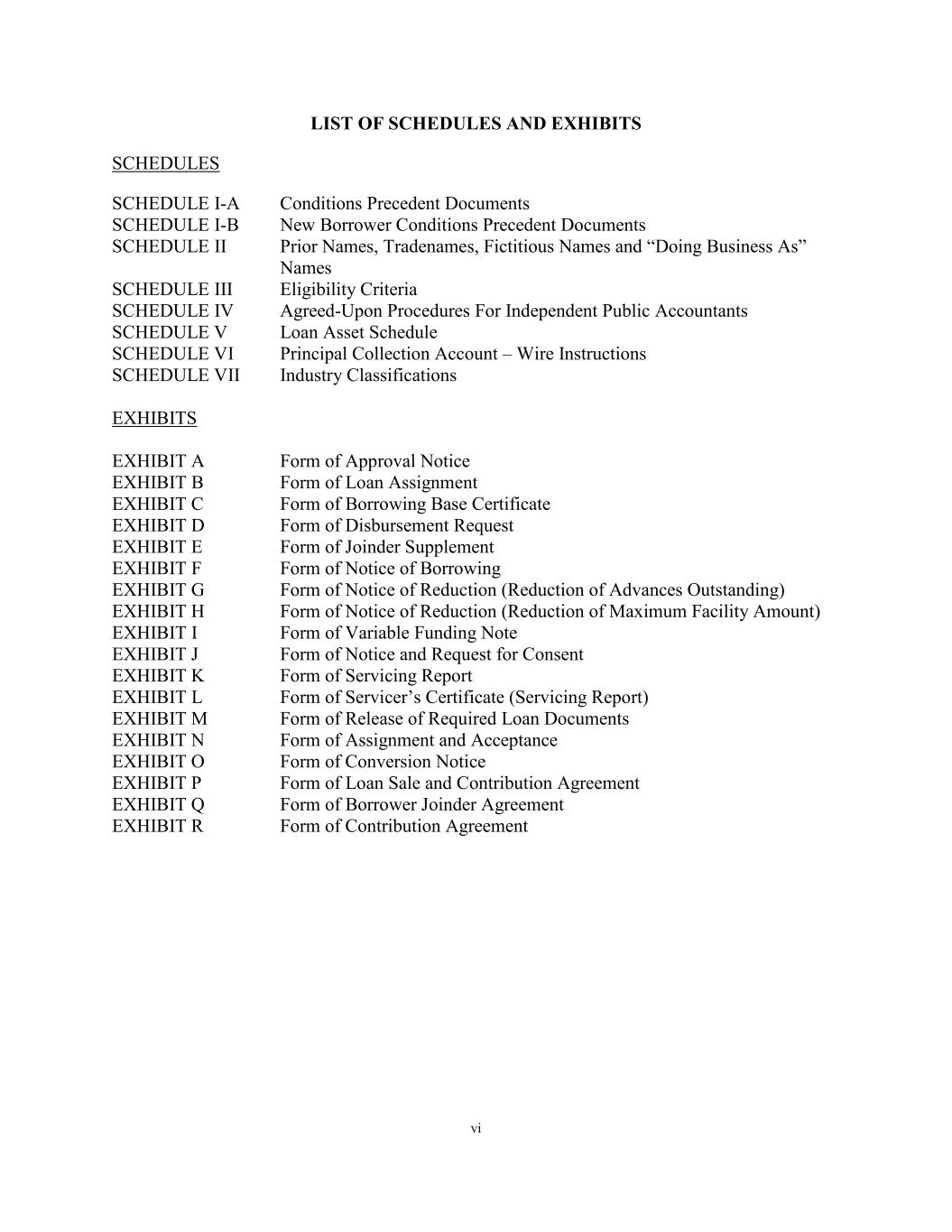 vi LIST OF SCHEDULES AND EXHIBITS SCHEDULES SCHEDULE I-A Conditions Precedent Documents SCHEDULE I-B New Borrower Conditions Precedent Documents SCHEDULE II Prior Names, Tradenames, Fictitious Names and “Doing Business As” Names SCHEDULE III Eligibility Criteria SCHEDULE IV Agreed-Upon Procedures For Independent Public Accountants SCHEDULE V Loan Asset Schedule SCHEDULE VI Principal Collection Account – Wire Instructions SCHEDULE VII Industry Classifications EXHIBITS EXHIBIT A Form of Approval Notice EXHIBIT B Form of Loan Assignment EXHIBIT C Form of Borrowing Base Certificate EXHIBIT D Form of Disbursement Request EXHIBIT E Form of Joinder Supplement EXHIBIT F Form of Notice of Borrowing EXHIBIT G Form of Notice of Reduction (Reduction of Advances Outstanding) EXHIBIT H Form of Notice of Reduction (Reduction of Maximum Facility Amount) EXHIBIT I Form of Variable Funding Note EXHIBIT J Form of Notice and Request for Consent EXHIBIT K Form of Servicing Report EXHIBIT L Form of Servicer’s Certificate (Servicing Report) EXHIBIT M Form of Release of Required Loan Documents EXHIBIT N Form of Assignment and Acceptance EXHIBIT O Form of Conversion Notice EXHIBIT P Form of Loan Sale and Contribution Agreement EXHIBIT Q Form of Borrower Joinder Agreement EXHIBIT R Form of Contribution Agreement