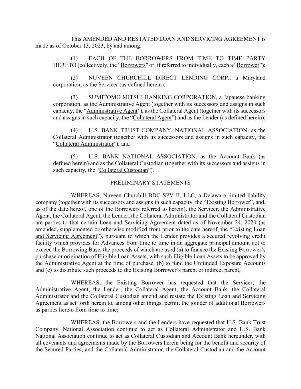 This AMENDED AND RESTATED LOAN AND SERVICING AGREEMENT is made as of October 13, 2023, by and among: (1) EACH OF THE BORROWERS FROM TIME TO TIME PARTY HERETO (collectively, the “Borrowers” or, if referred to individually, each a “Borrower”); (2) NUVEEN CHURCHILL DIRECT LENDING CORP., a Maryland corporation, as the Servicer (as defined herein); (3) SUMITOMO MITSUI BANKING CORPORATION, a Japanese banking corporation, as the Administrative Agent (together with its successors and assigns in such capacity, the “Administrative Agent”), as the Collateral Agent (together with its successors and assigns in such capacity, the “Collateral Agent”) and as the Lender (as defined herein); (4) U.S. BANK TRUST COMPANY, NATIONAL ASSOCIATION, as the Collateral Administrator (together with its successors and assigns in such capacity, the “Collateral Administrator”); and (5) U.S. BANK NATIONAL ASSOCIATION, as the Account Bank (as defined herein) and as the Collateral Custodian (together with its successors and assigns in such capacity, the “Collateral Custodian”). PRELIMINARY STATEMENTS WHEREAS, Nuveen Churchill BDC SPV II, LLC, a Delaware limited liability company (together with its successors and assigns in such capacity, the “Existing Borrower”, and, as of the date hereof, one of the Borrowers referred to herein), the Servicer, the Administrative Agent, the Collateral Agent, the Lender, the Collateral Administrator and the Collateral Custodian are parties to that certain Loan and Servicing Agreement dated as of November 24, 2020 (as amended, supplemented or otherwise modified from prior to the date hereof, the “Existing Loan and Servicing Agreement”), pursuant to which the Lender provides a secured revolving credit facility which provides for Advances from time to time in an aggregate principal amount not to exceed the Borrowing Base, the proceeds of which are used (a) to finance the Existing Borrower’s purchase or origination of Eligible Loan Assets, with such Eligible Loan Assets to be approved by the Administrative Agent at the time of purchase, (b) to fund the Unfunded Exposure Accounts and (c) to distribute such proceeds to the Existing Borrower’s parent or indirect parent; WHEREAS, the Existing Borrower has requested that the Servicer, the Administrative Agent, the Lender, the Collateral Agent, the Account Bank, the Collateral Administrator and the Collateral Custodian amend and restate the Existing Loan and Servicing Agreement as set forth herein to, among other things, permit the joinder of additional Borrowers as parties hereto from time to time; WHEREAS, the Borrowers and the Lenders have requested that U.S. Bank Trust Company, National Association continue to act as Collateral Administrator and U.S. Bank National Association continue to act as Collateral Custodian and Account Bank hereunder, with all covenants and agreements made by the Borrowers herein being for the benefit and security of the Secured Parties; and the Collateral Administrator, the Collateral Custodian and the Account