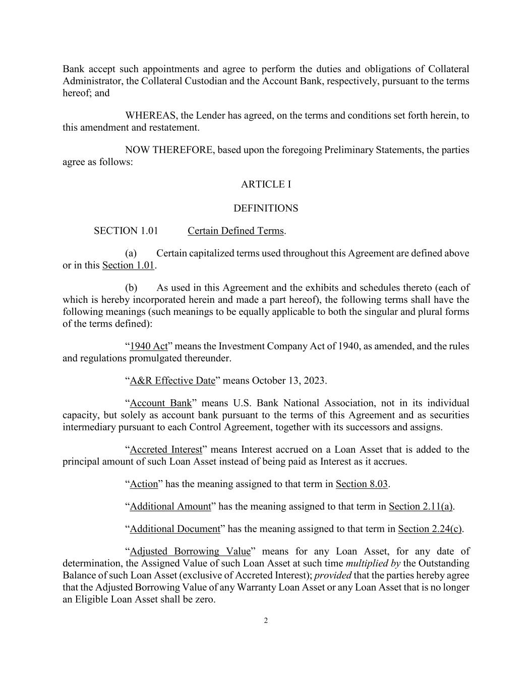 2 Bank accept such appointments and agree to perform the duties and obligations of Collateral Administrator, the Collateral Custodian and the Account Bank, respectively, pursuant to the terms hereof; and WHEREAS, the Lender has agreed, on the terms and conditions set forth herein, to this amendment and restatement. NOW THEREFORE, based upon the foregoing Preliminary Statements, the parties agree as follows: ARTICLE I DEFINITIONS SECTION 1.01 Certain Defined Terms. (a) Certain capitalized terms used throughout this Agreement are defined above or in this Section 1.01. (b) As used in this Agreement and the exhibits and schedules thereto (each of which is hereby incorporated herein and made a part hereof), the following terms shall have the following meanings (such meanings to be equally applicable to both the singular and plural forms of the terms defined): “1940 Act” means the Investment Company Act of 1940, as amended, and the rules and regulations promulgated thereunder. “A&R Effective Date” means October 13, 2023. “Account Bank” means U.S. Bank National Association, not in its individual capacity, but solely as account bank pursuant to the terms of this Agreement and as securities intermediary pursuant to each Control Agreement, together with its successors and assigns. “Accreted Interest” means Interest accrued on a Loan Asset that is added to the principal amount of such Loan Asset instead of being paid as Interest as it accrues. “Action” has the meaning assigned to that term in Section 8.03. “Additional Amount” has the meaning assigned to that term in Section 2.11(a). “Additional Document” has the meaning assigned to that term in Section 2.24(c). “Adjusted Borrowing Value” means for any Loan Asset, for any date of determination, the Assigned Value of such Loan Asset at such time multiplied by the Outstanding Balance of such Loan Asset (exclusive of Accreted Interest); provided that the parties hereby agree that the Adjusted Borrowing Value of any Warranty Loan Asset or any Loan Asset that is no longer an Eligible Loan Asset shall be zero.