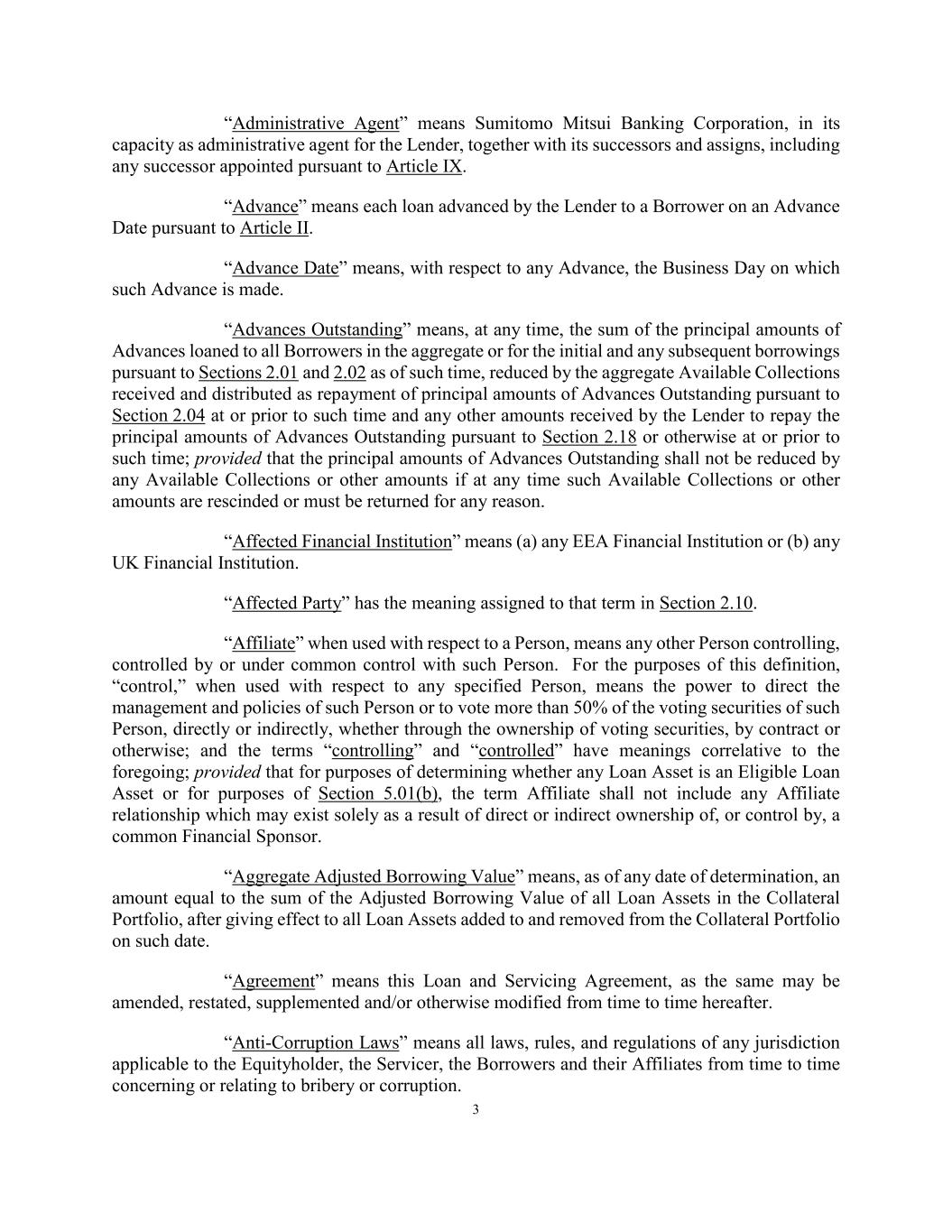 3 “Administrative Agent” means Sumitomo Mitsui Banking Corporation, in its capacity as administrative agent for the Lender, together with its successors and assigns, including any successor appointed pursuant to Article IX. “Advance” means each loan advanced by the Lender to a Borrower on an Advance Date pursuant to Article II. “Advance Date” means, with respect to any Advance, the Business Day on which such Advance is made. “Advances Outstanding” means, at any time, the sum of the principal amounts of Advances loaned to all Borrowers in the aggregate or for the initial and any subsequent borrowings pursuant to Sections 2.01 and 2.02 as of such time, reduced by the aggregate Available Collections received and distributed as repayment of principal amounts of Advances Outstanding pursuant to Section 2.04 at or prior to such time and any other amounts received by the Lender to repay the principal amounts of Advances Outstanding pursuant to Section 2.18 or otherwise at or prior to such time; provided that the principal amounts of Advances Outstanding shall not be reduced by any Available Collections or other amounts if at any time such Available Collections or other amounts are rescinded or must be returned for any reason. “Affected Financial Institution” means (a) any EEA Financial Institution or (b) any UK Financial Institution. “Affected Party” has the meaning assigned to that term in Section 2.10. “Affiliate” when used with respect to a Person, means any other Person controlling, controlled by or under common control with such Person. For the purposes of this definition, “control,” when used with respect to any specified Person, means the power to direct the management and policies of such Person or to vote more than 50% of the voting securities of such Person, directly or indirectly, whether through the ownership of voting securities, by contract or otherwise; and the terms “controlling” and “controlled” have meanings correlative to the foregoing; provided that for purposes of determining whether any Loan Asset is an Eligible Loan Asset or for purposes of Section 5.01(b), the term Affiliate shall not include any Affiliate relationship which may exist solely as a result of direct or indirect ownership of, or control by, a common Financial Sponsor. “Aggregate Adjusted Borrowing Value” means, as of any date of determination, an amount equal to the sum of the Adjusted Borrowing Value of all Loan Assets in the Collateral Portfolio, after giving effect to all Loan Assets added to and removed from the Collateral Portfolio on such date. “Agreement” means this Loan and Servicing Agreement, as the same may be amended, restated, supplemented and/or otherwise modified from time to time hereafter. “Anti-Corruption Laws” means all laws, rules, and regulations of any jurisdiction applicable to the Equityholder, the Servicer, the Borrowers and their Affiliates from time to time concerning or relating to bribery or corruption.