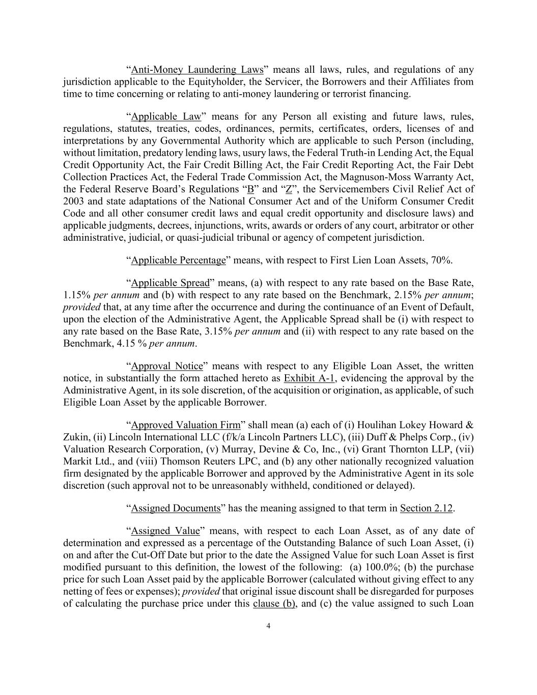 4 “Anti-Money Laundering Laws” means all laws, rules, and regulations of any jurisdiction applicable to the Equityholder, the Servicer, the Borrowers and their Affiliates from time to time concerning or relating to anti-money laundering or terrorist financing. “Applicable Law” means for any Person all existing and future laws, rules, regulations, statutes, treaties, codes, ordinances, permits, certificates, orders, licenses of and interpretations by any Governmental Authority which are applicable to such Person (including, without limitation, predatory lending laws, usury laws, the Federal Truth-in Lending Act, the Equal Credit Opportunity Act, the Fair Credit Billing Act, the Fair Credit Reporting Act, the Fair Debt Collection Practices Act, the Federal Trade Commission Act, the Magnuson-Moss Warranty Act, the Federal Reserve Board’s Regulations “B” and “Z”, the Servicemembers Civil Relief Act of 2003 and state adaptations of the National Consumer Act and of the Uniform Consumer Credit Code and all other consumer credit laws and equal credit opportunity and disclosure laws) and applicable judgments, decrees, injunctions, writs, awards or orders of any court, arbitrator or other administrative, judicial, or quasi-judicial tribunal or agency of competent jurisdiction. “Applicable Percentage” means, with respect to First Lien Loan Assets, 70%. “Applicable Spread” means, (a) with respect to any rate based on the Base Rate, 1.15% per annum and (b) with respect to any rate based on the Benchmark, 2.15% per annum; provided that, at any time after the occurrence and during the continuance of an Event of Default, upon the election of the Administrative Agent, the Applicable Spread shall be (i) with respect to any rate based on the Base Rate, 3.15% per annum and (ii) with respect to any rate based on the Benchmark, 4.15 % per annum. “Approval Notice” means with respect to any Eligible Loan Asset, the written notice, in substantially the form attached hereto as Exhibit A-1, evidencing the approval by the Administrative Agent, in its sole discretion, of the acquisition or origination, as applicable, of such Eligible Loan Asset by the applicable Borrower. “Approved Valuation Firm” shall mean (a) each of (i) Houlihan Lokey Howard & Zukin, (ii) Lincoln International LLC (f/k/a Lincoln Partners LLC), (iii) Duff & Phelps Corp., (iv) Valuation Research Corporation, (v) Murray, Devine & Co, Inc., (vi) Grant Thornton LLP, (vii) Markit Ltd., and (viii) Thomson Reuters LPC, and (b) any other nationally recognized valuation firm designated by the applicable Borrower and approved by the Administrative Agent in its sole discretion (such approval not to be unreasonably withheld, conditioned or delayed). “Assigned Documents” has the meaning assigned to that term in Section 2.12. “Assigned Value” means, with respect to each Loan Asset, as of any date of determination and expressed as a percentage of the Outstanding Balance of such Loan Asset, (i) on and after the Cut-Off Date but prior to the date the Assigned Value for such Loan Asset is first modified pursuant to this definition, the lowest of the following: (a) 100.0%; (b) the purchase price for such Loan Asset paid by the applicable Borrower (calculated without giving effect to any netting of fees or expenses); provided that original issue discount shall be disregarded for purposes of calculating the purchase price under this clause (b), and (c) the value assigned to such Loan