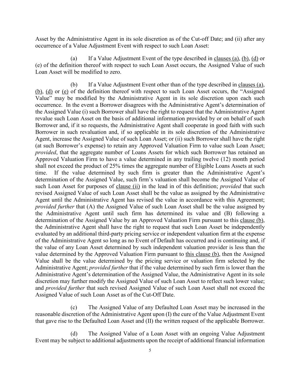 5 Asset by the Administrative Agent in its sole discretion as of the Cut-off Date; and (ii) after any occurrence of a Value Adjustment Event with respect to such Loan Asset: (a) If a Value Adjustment Event of the type described in clauses (a), (b), (d) or (e) of the definition thereof with respect to such Loan Asset occurs, the Assigned Value of such Loan Asset will be modified to zero. (b) If a Value Adjustment Event other than of the type described in clauses (a), (b), (d) or (e) of the definition thereof with respect to such Loan Asset occurs, the “Assigned Value” may be modified by the Administrative Agent in its sole discretion upon each such occurrence. In the event a Borrower disagrees with the Administrative Agent’s determination of the Assigned Value (i) such Borrower shall have the right to request that the Administrative Agent revalue such Loan Asset on the basis of additional information provided by or on behalf of such Borrower and, if it so requests, the Administrative Agent shall cooperate in good faith with such Borrower in such revaluation and, if so applicable in its sole discretion of the Administrative Agent, increase the Assigned Value of such Loan Asset; or (ii) such Borrower shall have the right (at such Borrower’s expense) to retain any Approved Valuation Firm to value such Loan Asset; provided, that the aggregate number of Loans Assets for which such Borrower has retained an Approved Valuation Firm to have a value determined in any trailing twelve (12) month period shall not exceed the product of 25% times the aggregate number of Eligible Loans Assets at such time. If the value determined by such firm is greater than the Administrative Agent’s determination of the Assigned Value, such firm’s valuation shall become the Assigned Value of such Loan Asset for purposes of clause (ii) in the lead in of this definition; provided that such revised Assigned Value of such Loan Asset shall be the value as assigned by the Administrative Agent until the Administrative Agent has revised the value in accordance with this Agreement; provided further that (A) the Assigned Value of such Loan Asset shall be the value assigned by the Administrative Agent until such firm has determined its value and (B) following a determination of the Assigned Value by an Approved Valuation Firm pursuant to this clause (b), the Administrative Agent shall have the right to request that such Loan Asset be independently evaluated by an additional third-party pricing service or independent valuation firm at the expense of the Administrative Agent so long as no Event of Default has occurred and is continuing and, if the value of any Loan Asset determined by such independent valuation provider is less than the value determined by the Approved Valuation Firm pursuant to this clause (b), then the Assigned Value shall be the value determined by the pricing service or valuation firm selected by the Administrative Agent; provided further that if the value determined by such firm is lower than the Administrative Agent’s determination of the Assigned Value, the Administrative Agent in its sole discretion may further modify the Assigned Value of such Loan Asset to reflect such lower value; and provided further that such revised Assigned Value of such Loan Asset shall not exceed the Assigned Value of such Loan Asset as of the Cut-Off Date. (c) The Assigned Value of any Defaulted Loan Asset may be increased in the reasonable discretion of the Administrative Agent upon (I) the cure of the Value Adjustment Event that gave rise to the Defaulted Loan Asset and (II) the written request of the applicable Borrower. (d) The Assigned Value of a Loan Asset with an ongoing Value Adjustment Event may be subject to additional adjustments upon the receipt of additional financial information