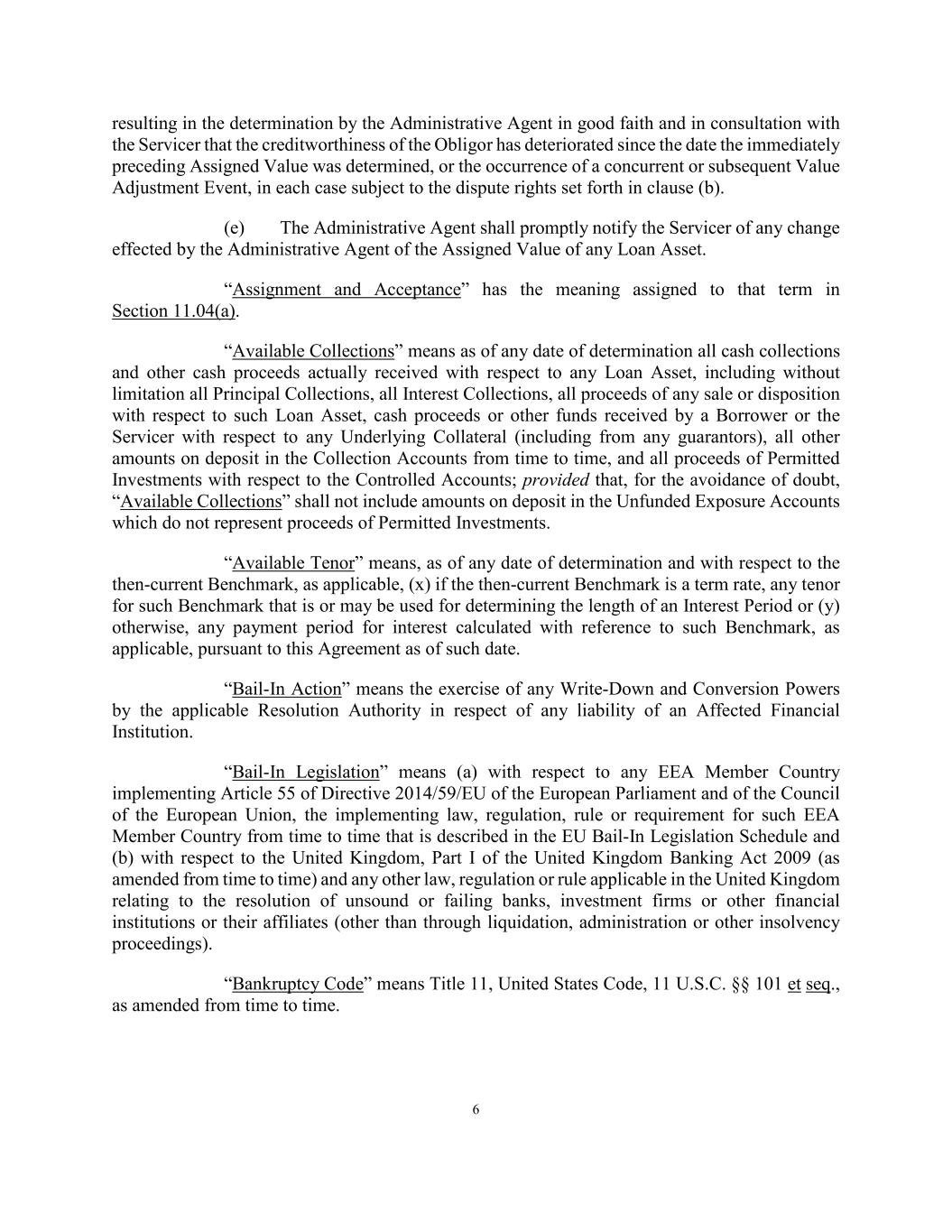 6 resulting in the determination by the Administrative Agent in good faith and in consultation with the Servicer that the creditworthiness of the Obligor has deteriorated since the date the immediately preceding Assigned Value was determined, or the occurrence of a concurrent or subsequent Value Adjustment Event, in each case subject to the dispute rights set forth in clause (b). (e) The Administrative Agent shall promptly notify the Servicer of any change effected by the Administrative Agent of the Assigned Value of any Loan Asset. “Assignment and Acceptance” has the meaning assigned to that term in Section 11.04(a). “Available Collections” means as of any date of determination all cash collections and other cash proceeds actually received with respect to any Loan Asset, including without limitation all Principal Collections, all Interest Collections, all proceeds of any sale or disposition with respect to such Loan Asset, cash proceeds or other funds received by a Borrower or the Servicer with respect to any Underlying Collateral (including from any guarantors), all other amounts on deposit in the Collection Accounts from time to time, and all proceeds of Permitted Investments with respect to the Controlled Accounts; provided that, for the avoidance of doubt, “Available Collections” shall not include amounts on deposit in the Unfunded Exposure Accounts which do not represent proceeds of Permitted Investments. “Available Tenor” means, as of any date of determination and with respect to the then-current Benchmark, as applicable, (x) if the then-current Benchmark is a term rate, any tenor for such Benchmark that is or may be used for determining the length of an Interest Period or (y) otherwise, any payment period for interest calculated with reference to such Benchmark, as applicable, pursuant to this Agreement as of such date. “Bail-In Action” means the exercise of any Write-Down and Conversion Powers by the applicable Resolution Authority in respect of any liability of an Affected Financial Institution. “Bail-In Legislation” means (a) with respect to any EEA Member Country implementing Article 55 of Directive 2014/59/EU of the European Parliament and of the Council of the European Union, the implementing law, regulation, rule or requirement for such EEA Member Country from time to time that is described in the EU Bail-In Legislation Schedule and (b) with respect to the United Kingdom, Part I of the United Kingdom Banking Act 2009 (as amended from time to time) and any other law, regulation or rule applicable in the United Kingdom relating to the resolution of unsound or failing banks, investment firms or other financial institutions or their affiliates (other than through liquidation, administration or other insolvency proceedings). “Bankruptcy Code” means Title 11, United States Code, 11 U.S.C. §§ 101 et seq., as amended from time to time.