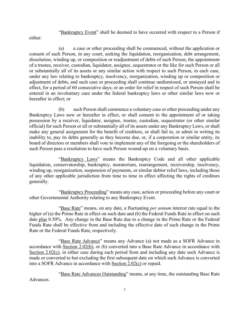 7 “Bankruptcy Event” shall be deemed to have occurred with respect to a Person if either: (a) a case or other proceeding shall be commenced, without the application or consent of such Person, in any court, seeking the liquidation, reorganization, debt arrangement, dissolution, winding up, or composition or readjustment of debts of such Person, the appointment of a trustee, receiver, custodian, liquidator, assignee, sequestrator or the like for such Person or all or substantially all of its assets or any similar action with respect to such Person, in each case, under any law relating to bankruptcy, insolvency, reorganization, winding up or composition or adjustment of debts, and such case or proceeding shall continue undismissed, or unstayed and in effect, for a period of 60 consecutive days; or an order for relief in respect of such Person shall be entered in an involuntary case under the federal bankruptcy laws or other similar laws now or hereafter in effect; or (b) such Person shall commence a voluntary case or other proceeding under any Bankruptcy Laws now or hereafter in effect, or shall consent to the appointment of or taking possession by a receiver, liquidator, assignee, trustee, custodian, sequestrator (or other similar official) for such Person or all or substantially all of its assets under any Bankruptcy Laws, or shall make any general assignment for the benefit of creditors, or shall fail to, or admit in writing its inability to, pay its debts generally as they become due, or, if a corporation or similar entity, its board of directors or members shall vote to implement any of the foregoing or the shareholders of such Person pass a resolution to have such Person wound-up on a voluntary basis. “Bankruptcy Laws” means the Bankruptcy Code and all other applicable liquidation, conservatorship, bankruptcy, moratorium, rearrangement, receivership, insolvency, winding up, reorganization, suspension of payments, or similar debtor relief laws, including those of any other applicable jurisdiction from time to time in effect affecting the rights of creditors generally. “Bankruptcy Proceeding” means any case, action or proceeding before any court or other Governmental Authority relating to any Bankruptcy Event. “Base Rate” means, on any date, a fluctuating per annum interest rate equal to the higher of (a) the Prime Rate in effect on such date and (b) the Federal Funds Rate in effect on such date plus 0.50%. Any change in the Base Rate due to a change in the Prime Rate or the Federal Funds Rate shall be effective from and including the effective date of such change in the Prime Rate or the Federal Funds Rate, respectively. “Base Rate Advance” means any Advance (a) not made as a SOFR Advance in accordance with Section 2.02(b), or (b) converted into a Base Rate Advance in accordance with Section 2.02(c), in either case during each period from and including any date such Advance is made or converted to but excluding the first subsequent date on which such Advance is converted into a SOFR Advance in accordance with Section 2.02(c) or repaid. “Base Rate Advances Outstanding” means, at any time, the outstanding Base Rate Advances.