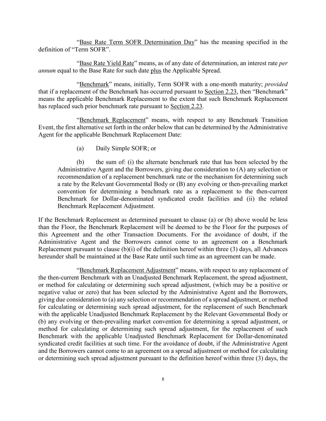 8 “Base Rate Term SOFR Determination Day” has the meaning specified in the definition of “Term SOFR”. “Base Rate Yield Rate” means, as of any date of determination, an interest rate per annum equal to the Base Rate for such date plus the Applicable Spread. “Benchmark” means, initially, Term SOFR with a one-month maturity; provided that if a replacement of the Benchmark has occurred pursuant to Section 2.23, then “Benchmark” means the applicable Benchmark Replacement to the extent that such Benchmark Replacement has replaced such prior benchmark rate pursuant to Section 2.23. “Benchmark Replacement” means, with respect to any Benchmark Transition Event, the first alternative set forth in the order below that can be determined by the Administrative Agent for the applicable Benchmark Replacement Date: (a) Daily Simple SOFR; or (b) the sum of: (i) the alternate benchmark rate that has been selected by the Administrative Agent and the Borrowers, giving due consideration to (A) any selection or recommendation of a replacement benchmark rate or the mechanism for determining such a rate by the Relevant Governmental Body or (B) any evolving or then-prevailing market convention for determining a benchmark rate as a replacement to the then-current Benchmark for Dollar-denominated syndicated credit facilities and (ii) the related Benchmark Replacement Adjustment. If the Benchmark Replacement as determined pursuant to clause (a) or (b) above would be less than the Floor, the Benchmark Replacement will be deemed to be the Floor for the purposes of this Agreement and the other Transaction Documents. For the avoidance of doubt, if the Administrative Agent and the Borrowers cannot come to an agreement on a Benchmark Replacement pursuant to clause (b)(i) of the definition hereof within three (3) days, all Advances hereunder shall be maintained at the Base Rate until such time as an agreement can be made. “Benchmark Replacement Adjustment” means, with respect to any replacement of the then-current Benchmark with an Unadjusted Benchmark Replacement, the spread adjustment, or method for calculating or determining such spread adjustment, (which may be a positive or negative value or zero) that has been selected by the Administrative Agent and the Borrowers, giving due consideration to (a) any selection or recommendation of a spread adjustment, or method for calculating or determining such spread adjustment, for the replacement of such Benchmark with the applicable Unadjusted Benchmark Replacement by the Relevant Governmental Body or (b) any evolving or then-prevailing market convention for determining a spread adjustment, or method for calculating or determining such spread adjustment, for the replacement of such Benchmark with the applicable Unadjusted Benchmark Replacement for Dollar-denominated syndicated credit facilities at such time. For the avoidance of doubt, if the Administrative Agent and the Borrowers cannot come to an agreement on a spread adjustment or method for calculating or determining such spread adjustment pursuant to the definition hereof within three (3) days, the