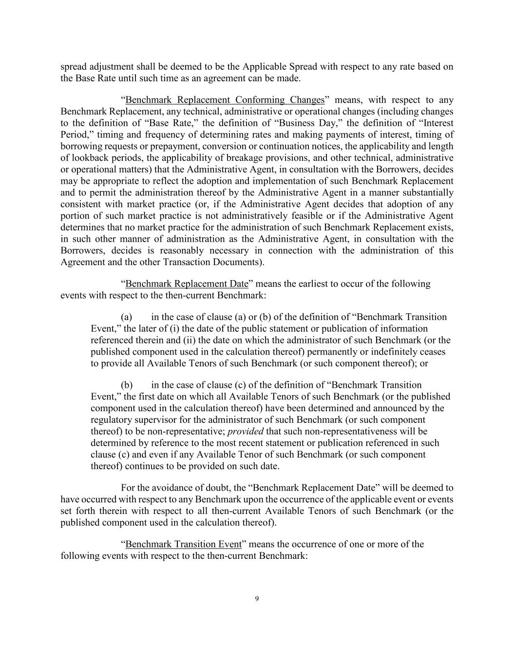 9 spread adjustment shall be deemed to be the Applicable Spread with respect to any rate based on the Base Rate until such time as an agreement can be made. “Benchmark Replacement Conforming Changes” means, with respect to any Benchmark Replacement, any technical, administrative or operational changes (including changes to the definition of “Base Rate,” the definition of “Business Day,” the definition of “Interest Period,” timing and frequency of determining rates and making payments of interest, timing of borrowing requests or prepayment, conversion or continuation notices, the applicability and length of lookback periods, the applicability of breakage provisions, and other technical, administrative or operational matters) that the Administrative Agent, in consultation with the Borrowers, decides may be appropriate to reflect the adoption and implementation of such Benchmark Replacement and to permit the administration thereof by the Administrative Agent in a manner substantially consistent with market practice (or, if the Administrative Agent decides that adoption of any portion of such market practice is not administratively feasible or if the Administrative Agent determines that no market practice for the administration of such Benchmark Replacement exists, in such other manner of administration as the Administrative Agent, in consultation with the Borrowers, decides is reasonably necessary in connection with the administration of this Agreement and the other Transaction Documents). “Benchmark Replacement Date” means the earliest to occur of the following events with respect to the then-current Benchmark: (a) in the case of clause (a) or (b) of the definition of “Benchmark Transition Event,” the later of (i) the date of the public statement or publication of information referenced therein and (ii) the date on which the administrator of such Benchmark (or the published component used in the calculation thereof) permanently or indefinitely ceases to provide all Available Tenors of such Benchmark (or such component thereof); or (b) in the case of clause (c) of the definition of “Benchmark Transition Event,” the first date on which all Available Tenors of such Benchmark (or the published component used in the calculation thereof) have been determined and announced by the regulatory supervisor for the administrator of such Benchmark (or such component thereof) to be non-representative; provided that such non-representativeness will be determined by reference to the most recent statement or publication referenced in such clause (c) and even if any Available Tenor of such Benchmark (or such component thereof) continues to be provided on such date. For the avoidance of doubt, the “Benchmark Replacement Date” will be deemed to have occurred with respect to any Benchmark upon the occurrence of the applicable event or events set forth therein with respect to all then-current Available Tenors of such Benchmark (or the published component used in the calculation thereof). “Benchmark Transition Event” means the occurrence of one or more of the following events with respect to the then-current Benchmark: