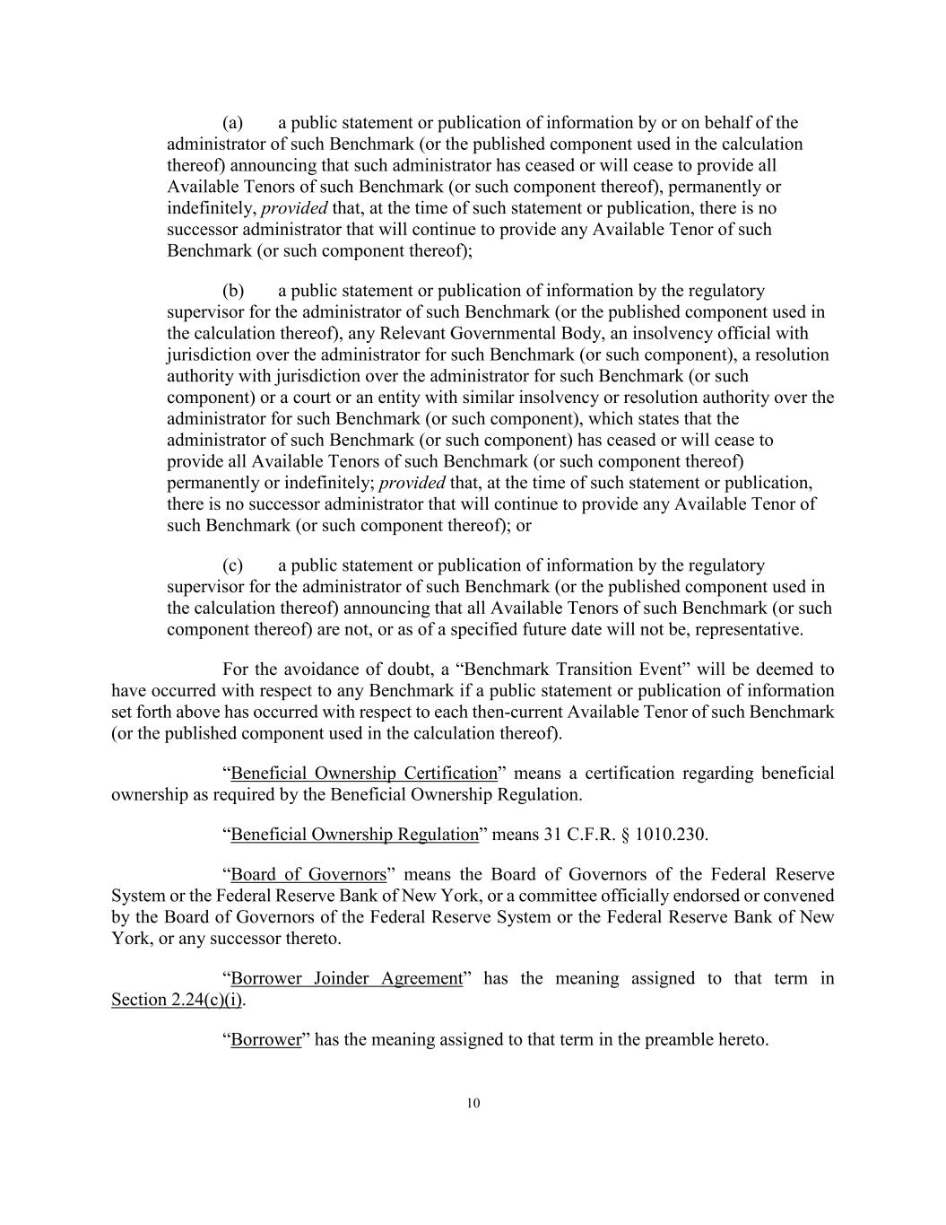 10 (a) a public statement or publication of information by or on behalf of the administrator of such Benchmark (or the published component used in the calculation thereof) announcing that such administrator has ceased or will cease to provide all Available Tenors of such Benchmark (or such component thereof), permanently or indefinitely, provided that, at the time of such statement or publication, there is no successor administrator that will continue to provide any Available Tenor of such Benchmark (or such component thereof); (b) a public statement or publication of information by the regulatory supervisor for the administrator of such Benchmark (or the published component used in the calculation thereof), any Relevant Governmental Body, an insolvency official with jurisdiction over the administrator for such Benchmark (or such component), a resolution authority with jurisdiction over the administrator for such Benchmark (or such component) or a court or an entity with similar insolvency or resolution authority over the administrator for such Benchmark (or such component), which states that the administrator of such Benchmark (or such component) has ceased or will cease to provide all Available Tenors of such Benchmark (or such component thereof) permanently or indefinitely; provided that, at the time of such statement or publication, there is no successor administrator that will continue to provide any Available Tenor of such Benchmark (or such component thereof); or (c) a public statement or publication of information by the regulatory supervisor for the administrator of such Benchmark (or the published component used in the calculation thereof) announcing that all Available Tenors of such Benchmark (or such component thereof) are not, or as of a specified future date will not be, representative. For the avoidance of doubt, a “Benchmark Transition Event” will be deemed to have occurred with respect to any Benchmark if a public statement or publication of information set forth above has occurred with respect to each then-current Available Tenor of such Benchmark (or the published component used in the calculation thereof). “Beneficial Ownership Certification” means a certification regarding beneficial ownership as required by the Beneficial Ownership Regulation. “Beneficial Ownership Regulation” means 31 C.F.R. § 1010.230. “Board of Governors” means the Board of Governors of the Federal Reserve System or the Federal Reserve Bank of New York, or a committee officially endorsed or convened by the Board of Governors of the Federal Reserve System or the Federal Reserve Bank of New York, or any successor thereto. “Borrower Joinder Agreement” has the meaning assigned to that term in Section 2.24(c)(i). “Borrower” has the meaning assigned to that term in the preamble hereto.