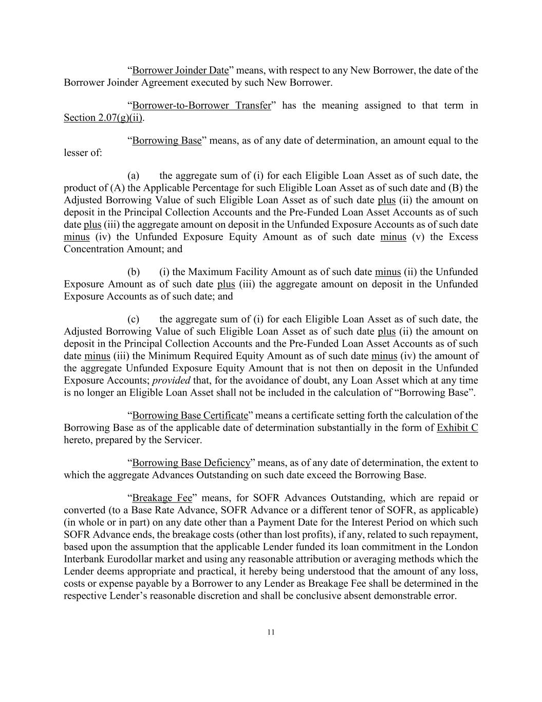 11 “Borrower Joinder Date” means, with respect to any New Borrower, the date of the Borrower Joinder Agreement executed by such New Borrower. “Borrower-to-Borrower Transfer” has the meaning assigned to that term in Section 2.07(g)(ii). “Borrowing Base” means, as of any date of determination, an amount equal to the lesser of: (a) the aggregate sum of (i) for each Eligible Loan Asset as of such date, the product of (A) the Applicable Percentage for such Eligible Loan Asset as of such date and (B) the Adjusted Borrowing Value of such Eligible Loan Asset as of such date plus (ii) the amount on deposit in the Principal Collection Accounts and the Pre-Funded Loan Asset Accounts as of such date plus (iii) the aggregate amount on deposit in the Unfunded Exposure Accounts as of such date minus (iv) the Unfunded Exposure Equity Amount as of such date minus (v) the Excess Concentration Amount; and (b) (i) the Maximum Facility Amount as of such date minus (ii) the Unfunded Exposure Amount as of such date plus (iii) the aggregate amount on deposit in the Unfunded Exposure Accounts as of such date; and (c) the aggregate sum of (i) for each Eligible Loan Asset as of such date, the Adjusted Borrowing Value of such Eligible Loan Asset as of such date plus (ii) the amount on deposit in the Principal Collection Accounts and the Pre-Funded Loan Asset Accounts as of such date minus (iii) the Minimum Required Equity Amount as of such date minus (iv) the amount of the aggregate Unfunded Exposure Equity Amount that is not then on deposit in the Unfunded Exposure Accounts; provided that, for the avoidance of doubt, any Loan Asset which at any time is no longer an Eligible Loan Asset shall not be included in the calculation of “Borrowing Base”. “Borrowing Base Certificate” means a certificate setting forth the calculation of the Borrowing Base as of the applicable date of determination substantially in the form of Exhibit C hereto, prepared by the Servicer. “Borrowing Base Deficiency” means, as of any date of determination, the extent to which the aggregate Advances Outstanding on such date exceed the Borrowing Base. “Breakage Fee” means, for SOFR Advances Outstanding, which are repaid or converted (to a Base Rate Advance, SOFR Advance or a different tenor of SOFR, as applicable) (in whole or in part) on any date other than a Payment Date for the Interest Period on which such SOFR Advance ends, the breakage costs (other than lost profits), if any, related to such repayment, based upon the assumption that the applicable Lender funded its loan commitment in the London Interbank Eurodollar market and using any reasonable attribution or averaging methods which the Lender deems appropriate and practical, it hereby being understood that the amount of any loss, costs or expense payable by a Borrower to any Lender as Breakage Fee shall be determined in the respective Lender’s reasonable discretion and shall be conclusive absent demonstrable error.