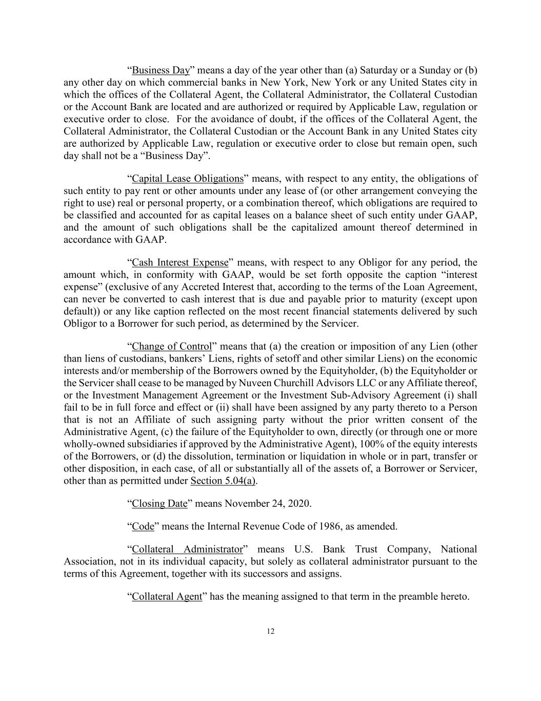 12 “Business Day” means a day of the year other than (a) Saturday or a Sunday or (b) any other day on which commercial banks in New York, New York or any United States city in which the offices of the Collateral Agent, the Collateral Administrator, the Collateral Custodian or the Account Bank are located and are authorized or required by Applicable Law, regulation or executive order to close. For the avoidance of doubt, if the offices of the Collateral Agent, the Collateral Administrator, the Collateral Custodian or the Account Bank in any United States city are authorized by Applicable Law, regulation or executive order to close but remain open, such day shall not be a “Business Day”. “Capital Lease Obligations” means, with respect to any entity, the obligations of such entity to pay rent or other amounts under any lease of (or other arrangement conveying the right to use) real or personal property, or a combination thereof, which obligations are required to be classified and accounted for as capital leases on a balance sheet of such entity under GAAP, and the amount of such obligations shall be the capitalized amount thereof determined in accordance with GAAP. “Cash Interest Expense” means, with respect to any Obligor for any period, the amount which, in conformity with GAAP, would be set forth opposite the caption “interest expense” (exclusive of any Accreted Interest that, according to the terms of the Loan Agreement, can never be converted to cash interest that is due and payable prior to maturity (except upon default)) or any like caption reflected on the most recent financial statements delivered by such Obligor to a Borrower for such period, as determined by the Servicer. “Change of Control” means that (a) the creation or imposition of any Lien (other than liens of custodians, bankers’ Liens, rights of setoff and other similar Liens) on the economic interests and/or membership of the Borrowers owned by the Equityholder, (b) the Equityholder or the Servicer shall cease to be managed by Nuveen Churchill Advisors LLC or any Affiliate thereof, or the Investment Management Agreement or the Investment Sub-Advisory Agreement (i) shall fail to be in full force and effect or (ii) shall have been assigned by any party thereto to a Person that is not an Affiliate of such assigning party without the prior written consent of the Administrative Agent, (c) the failure of the Equityholder to own, directly (or through one or more wholly-owned subsidiaries if approved by the Administrative Agent), 100% of the equity interests of the Borrowers, or (d) the dissolution, termination or liquidation in whole or in part, transfer or other disposition, in each case, of all or substantially all of the assets of, a Borrower or Servicer, other than as permitted under Section 5.04(a). “Closing Date” means November 24, 2020. “Code” means the Internal Revenue Code of 1986, as amended. “Collateral Administrator” means U.S. Bank Trust Company, National Association, not in its individual capacity, but solely as collateral administrator pursuant to the terms of this Agreement, together with its successors and assigns. “Collateral Agent” has the meaning assigned to that term in the preamble hereto.