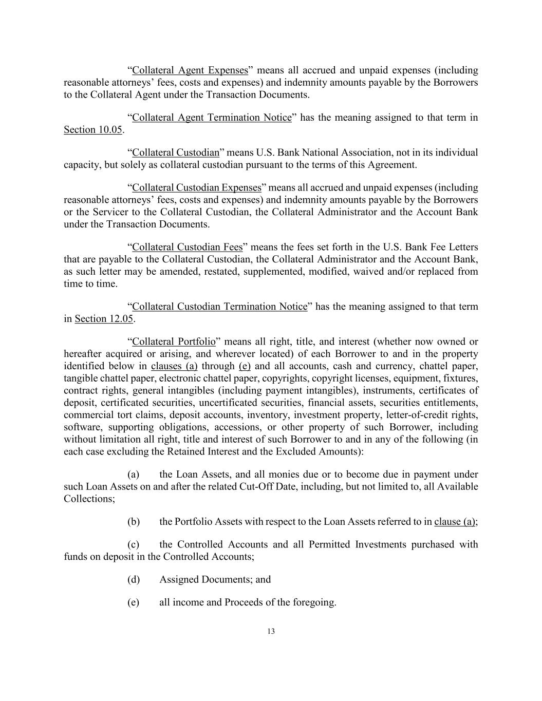 13 “Collateral Agent Expenses” means all accrued and unpaid expenses (including reasonable attorneys’ fees, costs and expenses) and indemnity amounts payable by the Borrowers to the Collateral Agent under the Transaction Documents. “Collateral Agent Termination Notice” has the meaning assigned to that term in Section 10.05. “Collateral Custodian” means U.S. Bank National Association, not in its individual capacity, but solely as collateral custodian pursuant to the terms of this Agreement. “Collateral Custodian Expenses” means all accrued and unpaid expenses (including reasonable attorneys’ fees, costs and expenses) and indemnity amounts payable by the Borrowers or the Servicer to the Collateral Custodian, the Collateral Administrator and the Account Bank under the Transaction Documents. “Collateral Custodian Fees” means the fees set forth in the U.S. Bank Fee Letters that are payable to the Collateral Custodian, the Collateral Administrator and the Account Bank, as such letter may be amended, restated, supplemented, modified, waived and/or replaced from time to time. “Collateral Custodian Termination Notice” has the meaning assigned to that term in Section 12.05. “Collateral Portfolio” means all right, title, and interest (whether now owned or hereafter acquired or arising, and wherever located) of each Borrower to and in the property identified below in clauses (a) through (e) and all accounts, cash and currency, chattel paper, tangible chattel paper, electronic chattel paper, copyrights, copyright licenses, equipment, fixtures, contract rights, general intangibles (including payment intangibles), instruments, certificates of deposit, certificated securities, uncertificated securities, financial assets, securities entitlements, commercial tort claims, deposit accounts, inventory, investment property, letter-of-credit rights, software, supporting obligations, accessions, or other property of such Borrower, including without limitation all right, title and interest of such Borrower to and in any of the following (in each case excluding the Retained Interest and the Excluded Amounts): (a) the Loan Assets, and all monies due or to become due in payment under such Loan Assets on and after the related Cut-Off Date, including, but not limited to, all Available Collections; (b) the Portfolio Assets with respect to the Loan Assets referred to in clause (a); (c) the Controlled Accounts and all Permitted Investments purchased with funds on deposit in the Controlled Accounts; (d) Assigned Documents; and (e) all income and Proceeds of the foregoing.
