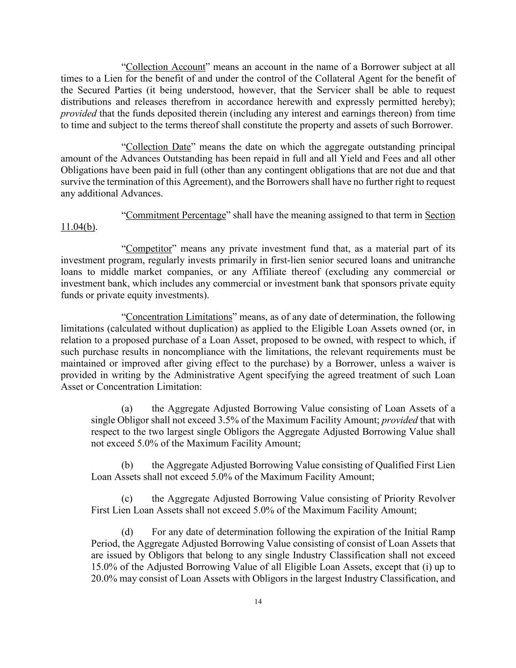 14 “Collection Account” means an account in the name of a Borrower subject at all times to a Lien for the benefit of and under the control of the Collateral Agent for the benefit of the Secured Parties (it being understood, however, that the Servicer shall be able to request distributions and releases therefrom in accordance herewith and expressly permitted hereby); provided that the funds deposited therein (including any interest and earnings thereon) from time to time and subject to the terms thereof shall constitute the property and assets of such Borrower. “Collection Date” means the date on which the aggregate outstanding principal amount of the Advances Outstanding has been repaid in full and all Yield and Fees and all other Obligations have been paid in full (other than any contingent obligations that are not due and that survive the termination of this Agreement), and the Borrowers shall have no further right to request any additional Advances. “Commitment Percentage” shall have the meaning assigned to that term in Section 11.04(b). “Competitor” means any private investment fund that, as a material part of its investment program, regularly invests primarily in first-lien senior secured loans and unitranche loans to middle market companies, or any Affiliate thereof (excluding any commercial or investment bank, which includes any commercial or investment bank that sponsors private equity funds or private equity investments). “Concentration Limitations” means, as of any date of determination, the following limitations (calculated without duplication) as applied to the Eligible Loan Assets owned (or, in relation to a proposed purchase of a Loan Asset, proposed to be owned, with respect to which, if such purchase results in noncompliance with the limitations, the relevant requirements must be maintained or improved after giving effect to the purchase) by a Borrower, unless a waiver is provided in writing by the Administrative Agent specifying the agreed treatment of such Loan Asset or Concentration Limitation: (a) the Aggregate Adjusted Borrowing Value consisting of Loan Assets of a single Obligor shall not exceed 3.5% of the Maximum Facility Amount; provided that with respect to the two largest single Obligors the Aggregate Adjusted Borrowing Value shall not exceed 5.0% of the Maximum Facility Amount; (b) the Aggregate Adjusted Borrowing Value consisting of Qualified First Lien Loan Assets shall not exceed 5.0% of the Maximum Facility Amount; (c) the Aggregate Adjusted Borrowing Value consisting of Priority Revolver First Lien Loan Assets shall not exceed 5.0% of the Maximum Facility Amount; (d) For any date of determination following the expiration of the Initial Ramp Period, the Aggregate Adjusted Borrowing Value consisting of consist of Loan Assets that are issued by Obligors that belong to any single Industry Classification shall not exceed 15.0% of the Adjusted Borrowing Value of all Eligible Loan Assets, except that (i) up to 20.0% may consist of Loan Assets with Obligors in the largest Industry Classification, and
