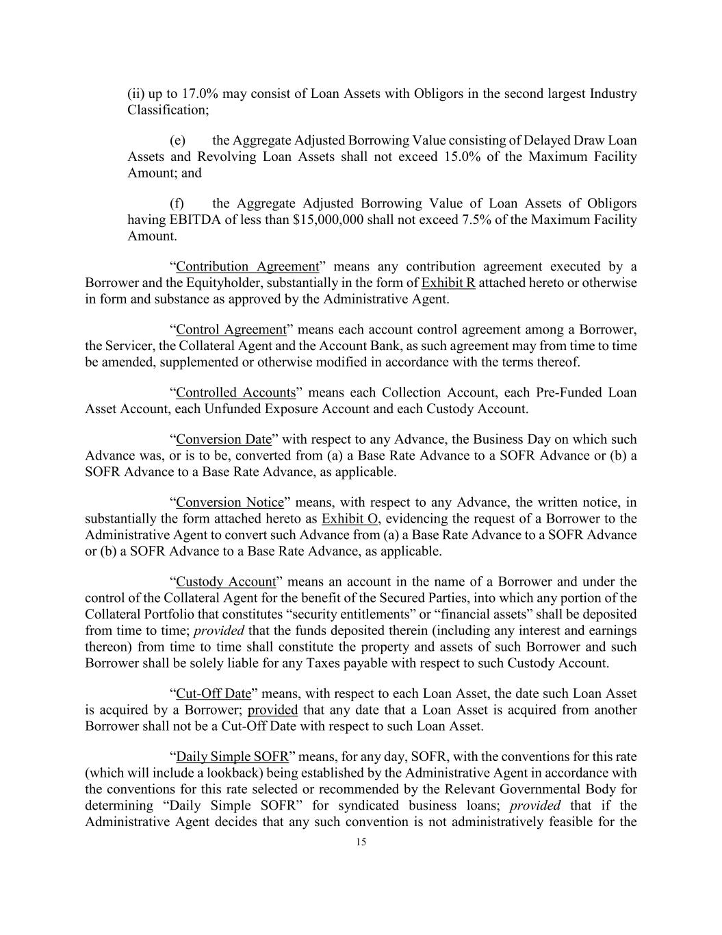 15 (ii) up to 17.0% may consist of Loan Assets with Obligors in the second largest Industry Classification; (e) the Aggregate Adjusted Borrowing Value consisting of Delayed Draw Loan Assets and Revolving Loan Assets shall not exceed 15.0% of the Maximum Facility Amount; and (f) the Aggregate Adjusted Borrowing Value of Loan Assets of Obligors having EBITDA of less than $15,000,000 shall not exceed 7.5% of the Maximum Facility Amount. “Contribution Agreement” means any contribution agreement executed by a Borrower and the Equityholder, substantially in the form of Exhibit R attached hereto or otherwise in form and substance as approved by the Administrative Agent. “Control Agreement” means each account control agreement among a Borrower, the Servicer, the Collateral Agent and the Account Bank, as such agreement may from time to time be amended, supplemented or otherwise modified in accordance with the terms thereof. “Controlled Accounts” means each Collection Account, each Pre-Funded Loan Asset Account, each Unfunded Exposure Account and each Custody Account. “Conversion Date” with respect to any Advance, the Business Day on which such Advance was, or is to be, converted from (a) a Base Rate Advance to a SOFR Advance or (b) a SOFR Advance to a Base Rate Advance, as applicable. “Conversion Notice” means, with respect to any Advance, the written notice, in substantially the form attached hereto as Exhibit O, evidencing the request of a Borrower to the Administrative Agent to convert such Advance from (a) a Base Rate Advance to a SOFR Advance or (b) a SOFR Advance to a Base Rate Advance, as applicable. “Custody Account” means an account in the name of a Borrower and under the control of the Collateral Agent for the benefit of the Secured Parties, into which any portion of the Collateral Portfolio that constitutes “security entitlements” or “financial assets” shall be deposited from time to time; provided that the funds deposited therein (including any interest and earnings thereon) from time to time shall constitute the property and assets of such Borrower and such Borrower shall be solely liable for any Taxes payable with respect to such Custody Account. “Cut-Off Date” means, with respect to each Loan Asset, the date such Loan Asset is acquired by a Borrower; provided that any date that a Loan Asset is acquired from another Borrower shall not be a Cut-Off Date with respect to such Loan Asset. “Daily Simple SOFR” means, for any day, SOFR, with the conventions for this rate (which will include a lookback) being established by the Administrative Agent in accordance with the conventions for this rate selected or recommended by the Relevant Governmental Body for determining “Daily Simple SOFR” for syndicated business loans; provided that if the Administrative Agent decides that any such convention is not administratively feasible for the