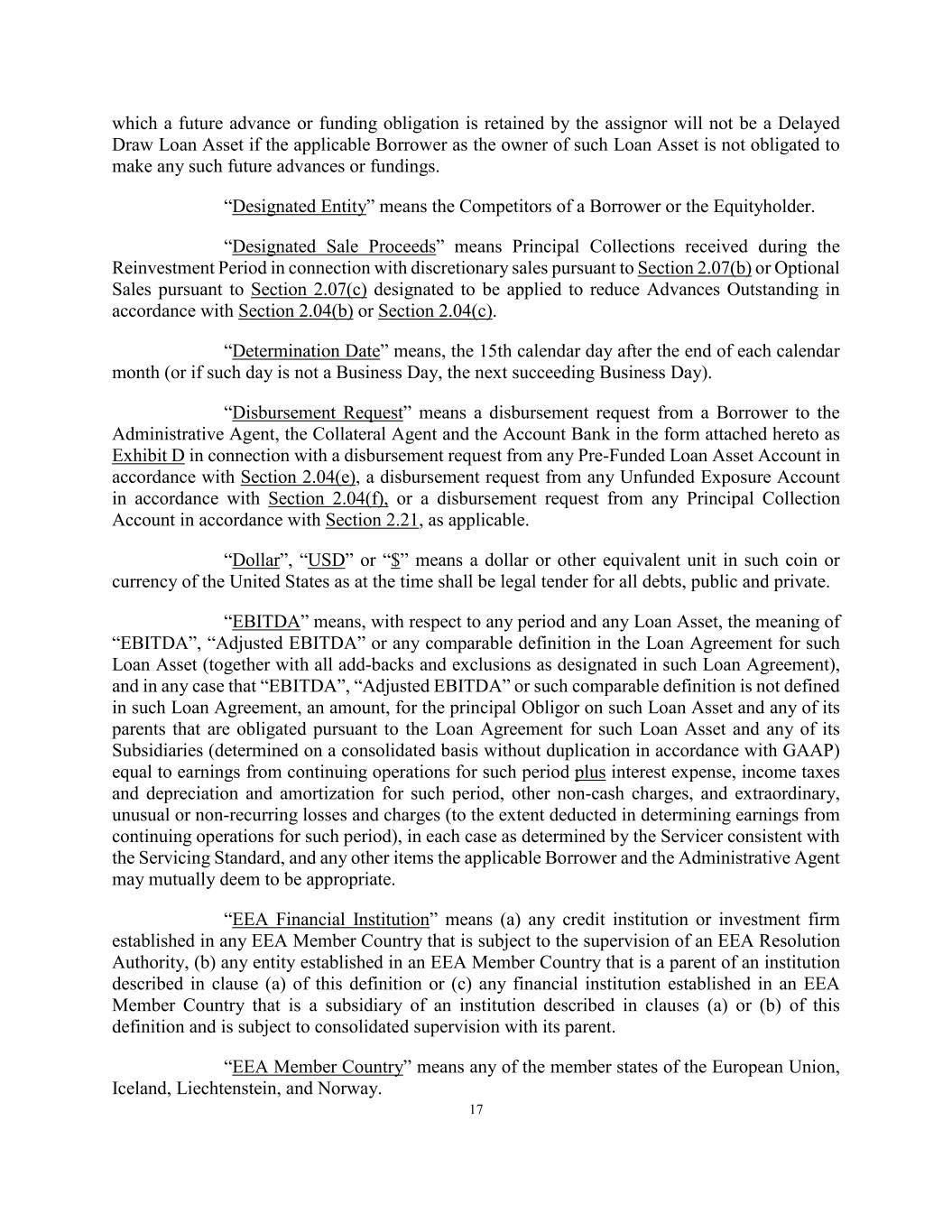 17 which a future advance or funding obligation is retained by the assignor will not be a Delayed Draw Loan Asset if the applicable Borrower as the owner of such Loan Asset is not obligated to make any such future advances or fundings. “Designated Entity” means the Competitors of a Borrower or the Equityholder. “Designated Sale Proceeds” means Principal Collections received during the Reinvestment Period in connection with discretionary sales pursuant to Section 2.07(b) or Optional Sales pursuant to Section 2.07(c) designated to be applied to reduce Advances Outstanding in accordance with Section 2.04(b) or Section 2.04(c). “Determination Date” means, the 15th calendar day after the end of each calendar month (or if such day is not a Business Day, the next succeeding Business Day). “Disbursement Request” means a disbursement request from a Borrower to the Administrative Agent, the Collateral Agent and the Account Bank in the form attached hereto as Exhibit D in connection with a disbursement request from any Pre-Funded Loan Asset Account in accordance with Section 2.04(e), a disbursement request from any Unfunded Exposure Account in accordance with Section 2.04(f), or a disbursement request from any Principal Collection Account in accordance with Section 2.21, as applicable. “Dollar”, “USD” or “$” means a dollar or other equivalent unit in such coin or currency of the United States as at the time shall be legal tender for all debts, public and private. “EBITDA” means, with respect to any period and any Loan Asset, the meaning of “EBITDA”, “Adjusted EBITDA” or any comparable definition in the Loan Agreement for such Loan Asset (together with all add-backs and exclusions as designated in such Loan Agreement), and in any case that “EBITDA”, “Adjusted EBITDA” or such comparable definition is not defined in such Loan Agreement, an amount, for the principal Obligor on such Loan Asset and any of its parents that are obligated pursuant to the Loan Agreement for such Loan Asset and any of its Subsidiaries (determined on a consolidated basis without duplication in accordance with GAAP) equal to earnings from continuing operations for such period plus interest expense, income taxes and depreciation and amortization for such period, other non-cash charges, and extraordinary, unusual or non-recurring losses and charges (to the extent deducted in determining earnings from continuing operations for such period), in each case as determined by the Servicer consistent with the Servicing Standard, and any other items the applicable Borrower and the Administrative Agent may mutually deem to be appropriate. “EEA Financial Institution” means (a) any credit institution or investment firm established in any EEA Member Country that is subject to the supervision of an EEA Resolution Authority, (b) any entity established in an EEA Member Country that is a parent of an institution described in clause (a) of this definition or (c) any financial institution established in an EEA Member Country that is a subsidiary of an institution described in clauses (a) or (b) of this definition and is subject to consolidated supervision with its parent. “EEA Member Country” means any of the member states of the European Union, Iceland, Liechtenstein, and Norway.