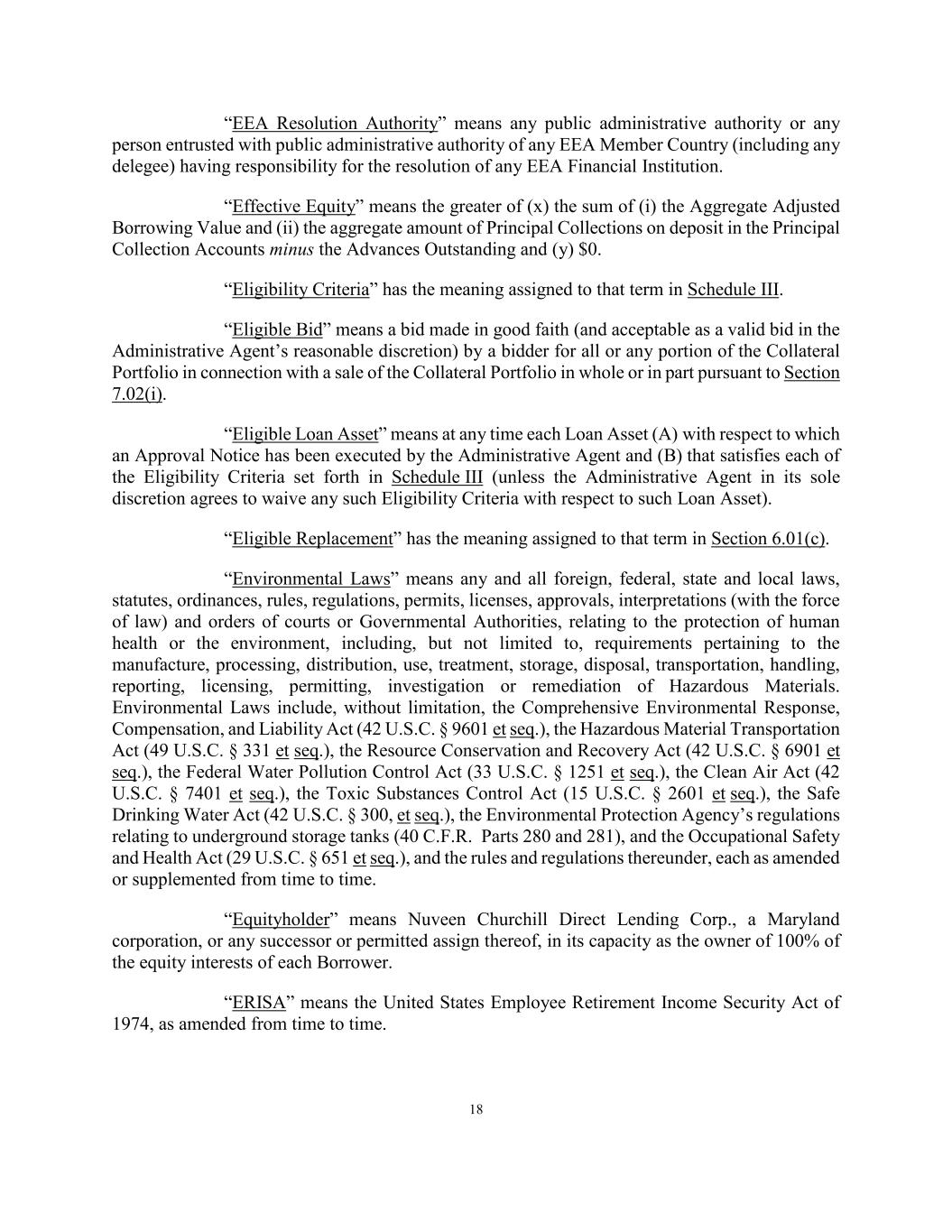18 “EEA Resolution Authority” means any public administrative authority or any person entrusted with public administrative authority of any EEA Member Country (including any delegee) having responsibility for the resolution of any EEA Financial Institution. “Effective Equity” means the greater of (x) the sum of (i) the Aggregate Adjusted Borrowing Value and (ii) the aggregate amount of Principal Collections on deposit in the Principal Collection Accounts minus the Advances Outstanding and (y) $0. “Eligibility Criteria” has the meaning assigned to that term in Schedule III. “Eligible Bid” means a bid made in good faith (and acceptable as a valid bid in the Administrative Agent’s reasonable discretion) by a bidder for all or any portion of the Collateral Portfolio in connection with a sale of the Collateral Portfolio in whole or in part pursuant to Section 7.02(i). “Eligible Loan Asset” means at any time each Loan Asset (A) with respect to which an Approval Notice has been executed by the Administrative Agent and (B) that satisfies each of the Eligibility Criteria set forth in Schedule III (unless the Administrative Agent in its sole discretion agrees to waive any such Eligibility Criteria with respect to such Loan Asset). “Eligible Replacement” has the meaning assigned to that term in Section 6.01(c). “Environmental Laws” means any and all foreign, federal, state and local laws, statutes, ordinances, rules, regulations, permits, licenses, approvals, interpretations (with the force of law) and orders of courts or Governmental Authorities, relating to the protection of human health or the environment, including, but not limited to, requirements pertaining to the manufacture, processing, distribution, use, treatment, storage, disposal, transportation, handling, reporting, licensing, permitting, investigation or remediation of Hazardous Materials. Environmental Laws include, without limitation, the Comprehensive Environmental Response, Compensation, and Liability Act (42 U.S.C. § 9601 et seq.), the Hazardous Material Transportation Act (49 U.S.C. § 331 et seq.), the Resource Conservation and Recovery Act (42 U.S.C. § 6901 et seq.), the Federal Water Pollution Control Act (33 U.S.C. § 1251 et seq.), the Clean Air Act (42 U.S.C. § 7401 et seq.), the Toxic Substances Control Act (15 U.S.C. § 2601 et seq.), the Safe Drinking Water Act (42 U.S.C. § 300, et seq.), the Environmental Protection Agency’s regulations relating to underground storage tanks (40 C.F.R. Parts 280 and 281), and the Occupational Safety and Health Act (29 U.S.C. § 651 et seq.), and the rules and regulations thereunder, each as amended or supplemented from time to time. “Equityholder” means Nuveen Churchill Direct Lending Corp., a Maryland corporation, or any successor or permitted assign thereof, in its capacity as the owner of 100% of the equity interests of each Borrower. “ERISA” means the United States Employee Retirement Income Security Act of 1974, as amended from time to time.