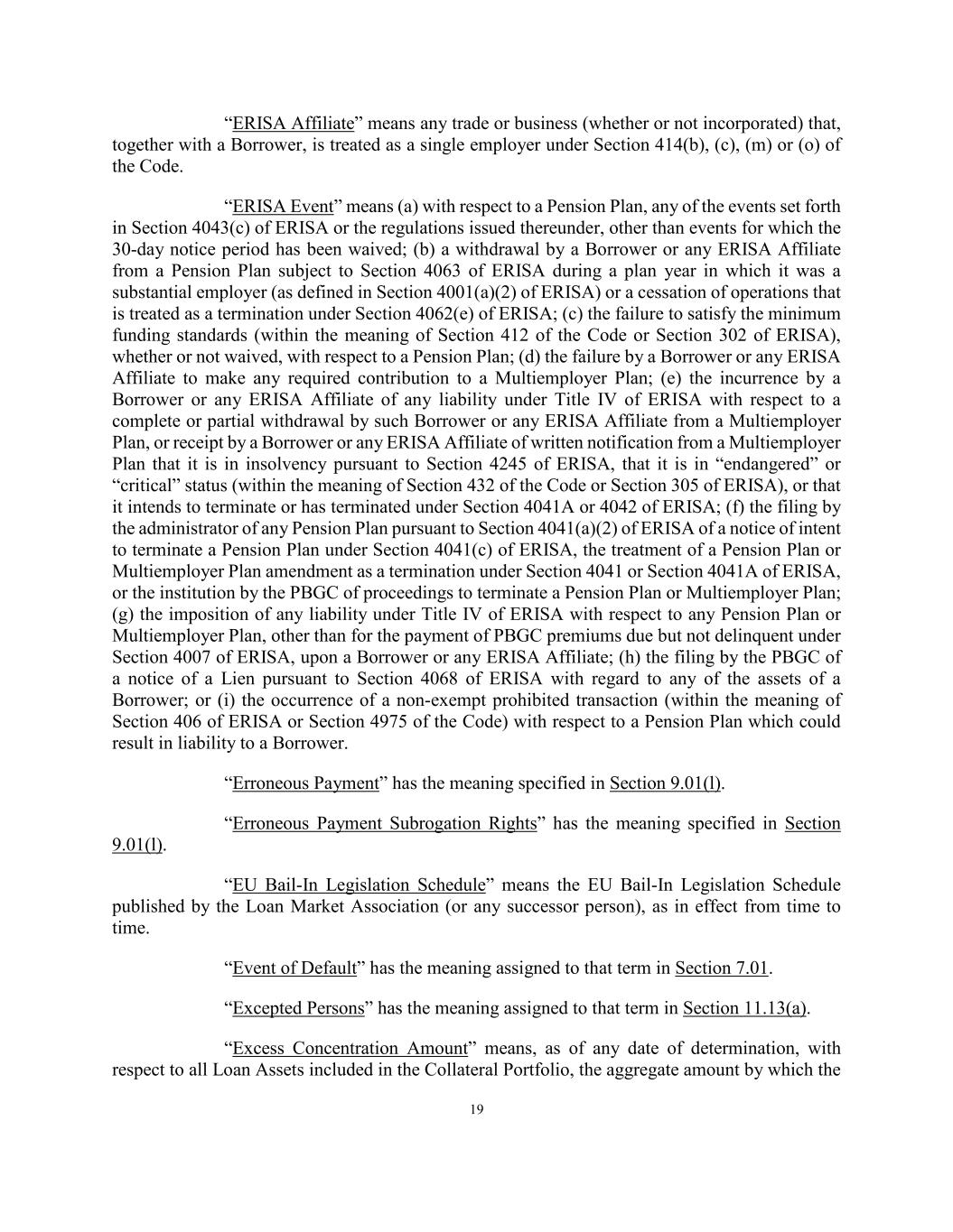 19 “ERISA Affiliate” means any trade or business (whether or not incorporated) that, together with a Borrower, is treated as a single employer under Section 414(b), (c), (m) or (o) of the Code. “ERISA Event” means (a) with respect to a Pension Plan, any of the events set forth in Section 4043(c) of ERISA or the regulations issued thereunder, other than events for which the 30-day notice period has been waived; (b) a withdrawal by a Borrower or any ERISA Affiliate from a Pension Plan subject to Section 4063 of ERISA during a plan year in which it was a substantial employer (as defined in Section 4001(a)(2) of ERISA) or a cessation of operations that is treated as a termination under Section 4062(e) of ERISA; (c) the failure to satisfy the minimum funding standards (within the meaning of Section 412 of the Code or Section 302 of ERISA), whether or not waived, with respect to a Pension Plan; (d) the failure by a Borrower or any ERISA Affiliate to make any required contribution to a Multiemployer Plan; (e) the incurrence by a Borrower or any ERISA Affiliate of any liability under Title IV of ERISA with respect to a complete or partial withdrawal by such Borrower or any ERISA Affiliate from a Multiemployer Plan, or receipt by a Borrower or any ERISA Affiliate of written notification from a Multiemployer Plan that it is in insolvency pursuant to Section 4245 of ERISA, that it is in “endangered” or “critical” status (within the meaning of Section 432 of the Code or Section 305 of ERISA), or that it intends to terminate or has terminated under Section 4041A or 4042 of ERISA; (f) the filing by the administrator of any Pension Plan pursuant to Section 4041(a)(2) of ERISA of a notice of intent to terminate a Pension Plan under Section 4041(c) of ERISA, the treatment of a Pension Plan or Multiemployer Plan amendment as a termination under Section 4041 or Section 4041A of ERISA, or the institution by the PBGC of proceedings to terminate a Pension Plan or Multiemployer Plan; (g) the imposition of any liability under Title IV of ERISA with respect to any Pension Plan or Multiemployer Plan, other than for the payment of PBGC premiums due but not delinquent under Section 4007 of ERISA, upon a Borrower or any ERISA Affiliate; (h) the filing by the PBGC of a notice of a Lien pursuant to Section 4068 of ERISA with regard to any of the assets of a Borrower; or (i) the occurrence of a non-exempt prohibited transaction (within the meaning of Section 406 of ERISA or Section 4975 of the Code) with respect to a Pension Plan which could result in liability to a Borrower. “Erroneous Payment” has the meaning specified in Section 9.01(l). “Erroneous Payment Subrogation Rights” has the meaning specified in Section 9.01(l). “EU Bail-In Legislation Schedule” means the EU Bail-In Legislation Schedule published by the Loan Market Association (or any successor person), as in effect from time to time. “Event of Default” has the meaning assigned to that term in Section 7.01. “Excepted Persons” has the meaning assigned to that term in Section 11.13(a). “Excess Concentration Amount” means, as of any date of determination, with respect to all Loan Assets included in the Collateral Portfolio, the aggregate amount by which the