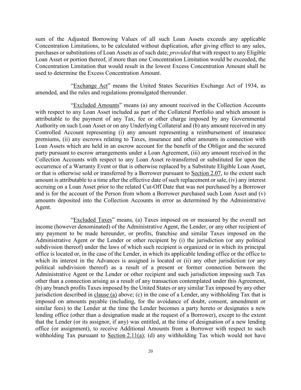 20 sum of the Adjusted Borrowing Values of all such Loan Assets exceeds any applicable Concentration Limitations, to be calculated without duplication, after giving effect to any sales, purchases or substitutions of Loan Assets as of such date; provided that with respect to any Eligible Loan Asset or portion thereof, if more than one Concentration Limitation would be exceeded, the Concentration Limitation that would result in the lowest Excess Concentration Amount shall be used to determine the Excess Concentration Amount. “Exchange Act” means the United States Securities Exchange Act of 1934, as amended, and the rules and regulations promulgated thereunder. “Excluded Amounts” means (a) any amount received in the Collection Accounts with respect to any Loan Asset included as part of the Collateral Portfolio and which amount is attributable to the payment of any Tax, fee or other charge imposed by any Governmental Authority on such Loan Asset or on any Underlying Collateral and (b) any amount received in any Controlled Account representing (i) any amount representing a reimbursement of insurance premiums, (ii) any escrows relating to Taxes, insurance and other amounts in connection with Loan Assets which are held in an escrow account for the benefit of the Obligor and the secured party pursuant to escrow arrangements under a Loan Agreement, (iii) any amount received in the Collection Accounts with respect to any Loan Asset re-transferred or substituted for upon the occurrence of a Warranty Event or that is otherwise replaced by a Substitute Eligible Loan Asset, or that is otherwise sold or transferred by a Borrower pursuant to Section 2.07, to the extent such amount is attributable to a time after the effective date of such replacement or sale, (iv) any interest accruing on a Loan Asset prior to the related Cut-Off Date that was not purchased by a Borrower and is for the account of the Person from whom a Borrower purchased such Loan Asset and (v) amounts deposited into the Collection Accounts in error as determined by the Administrative Agent. “Excluded Taxes” means, (a) Taxes imposed on or measured by the overall net income (however denominated) of the Administrative Agent, the Lender, or any other recipient of any payment to be made hereunder, or profits, franchise and similar Taxes imposed on the Administrative Agent or the Lender or other recipient by (i) the jurisdiction (or any political subdivision thereof) under the laws of which such recipient is organized or in which its principal office is located or, in the case of the Lender, in which its applicable lending office or the office to which its interest in the Advances is assigned is located or (ii) any other jurisdiction (or any political subdivision thereof) as a result of a present or former connection between the Administrative Agent or the Lender or other recipient and such jurisdiction imposing such Tax other than a connection arising as a result of any transaction contemplated under this Agreement, (b) any branch profits Taxes imposed by the United States or any similar Tax imposed by any other jurisdiction described in clause (a) above; (c) in the case of a Lender, any withholding Tax that is imposed on amounts payable (including, for the avoidance of doubt, consent, amendment or similar fees) to the Lender at the time the Lender becomes a party hereto or designates a new lending office (other than a designation made at the request of a Borrower), except to the extent that the Lender (or its assignor, if any) was entitled, at the time of designation of a new lending office (or assignment), to receive Additional Amounts from a Borrower with respect to such withholding Tax pursuant to Section 2.11(a); (d) any withholding Tax which would not have
