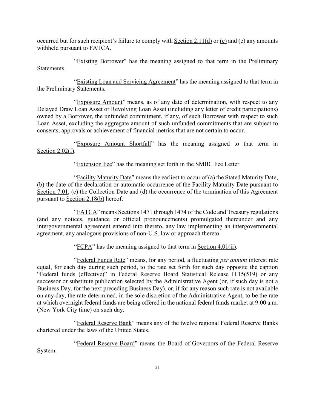21 occurred but for such recipient’s failure to comply with Section 2.11(d) or (e) and (e) any amounts withheld pursuant to FATCA. “Existing Borrower” has the meaning assigned to that term in the Preliminary Statements. “Existing Loan and Servicing Agreement” has the meaning assigned to that term in the Preliminary Statements. “Exposure Amount” means, as of any date of determination, with respect to any Delayed Draw Loan Asset or Revolving Loan Asset (including any letter of credit participations) owned by a Borrower, the unfunded commitment, if any, of such Borrower with respect to such Loan Asset, excluding the aggregate amount of such unfunded commitments that are subject to consents, approvals or achievement of financial metrics that are not certain to occur. “Exposure Amount Shortfall” has the meaning assigned to that term in Section 2.02(f). “Extension Fee” has the meaning set forth in the SMBC Fee Letter. “Facility Maturity Date” means the earliest to occur of (a) the Stated Maturity Date, (b) the date of the declaration or automatic occurrence of the Facility Maturity Date pursuant to Section 7.01, (c) the Collection Date and (d) the occurrence of the termination of this Agreement pursuant to Section 2.18(b) hereof. “FATCA” means Sections 1471 through 1474 of the Code and Treasury regulations (and any notices, guidance or official pronouncements) promulgated thereunder and any intergovernmental agreement entered into thereto, any law implementing an intergovernmental agreement, any analogous provisions of non-U.S. law or approach thereto. “FCPA” has the meaning assigned to that term in Section 4.01(ii). “Federal Funds Rate” means, for any period, a fluctuating per annum interest rate equal, for each day during such period, to the rate set forth for such day opposite the caption “Federal funds (effective)” in Federal Reserve Board Statistical Release H.15(519) or any successor or substitute publication selected by the Administrative Agent (or, if such day is not a Business Day, for the next preceding Business Day), or, if for any reason such rate is not available on any day, the rate determined, in the sole discretion of the Administrative Agent, to be the rate at which overnight federal funds are being offered in the national federal funds market at 9:00 a.m. (New York City time) on such day. “Federal Reserve Bank” means any of the twelve regional Federal Reserve Banks chartered under the laws of the United States. “Federal Reserve Board” means the Board of Governors of the Federal Reserve System.