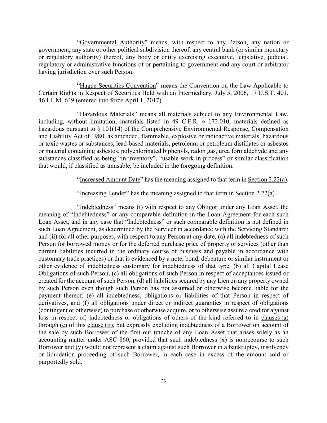 23 “Governmental Authority” means, with respect to any Person, any nation or government, any state or other political subdivision thereof, any central bank (or similar monetary or regulatory authority) thereof, any body or entity exercising executive, legislative, judicial, regulatory or administrative functions of or pertaining to government and any court or arbitrator having jurisdiction over such Person. “Hague Securities Convention” means the Convention on the Law Applicable to Certain Rights in Respect of Securities Held with an Intermediary, July 5, 2006, 17 U.S.T. 401, 46 I.L.M. 649 (entered into force April 1, 2017). “Hazardous Materials” means all materials subject to any Environmental Law, including, without limitation, materials listed in 49 C.F.R. § 172.010, materials defined as hazardous pursuant to § 101(14) of the Comprehensive Environmental Response, Compensation and Liability Act of 1980, as amended, flammable, explosive or radioactive materials, hazardous or toxic wastes or substances, lead-based materials, petroleum or petroleum distillates or asbestos or material containing asbestos, polychlorinated biphenyls, radon gas, urea formaldehyde and any substances classified as being “in inventory”, “usable work in process” or similar classification that would, if classified as unusable, be included in the foregoing definition. “Increased Amount Date” has the meaning assigned to that term in Section 2.22(a). “Increasing Lender” has the meaning assigned to that term in Section 2.22(a). “Indebtedness” means (i) with respect to any Obligor under any Loan Asset, the meaning of “Indebtedness” or any comparable definition in the Loan Agreement for each such Loan Asset, and in any case that “Indebtedness” or such comparable definition is not defined in such Loan Agreement, as determined by the Servicer in accordance with the Servicing Standard; and (ii) for all other purposes, with respect to any Person at any date, (a) all indebtedness of such Person for borrowed money or for the deferred purchase price of property or services (other than current liabilities incurred in the ordinary course of business and payable in accordance with customary trade practices) or that is evidenced by a note, bond, debenture or similar instrument or other evidence of indebtedness customary for indebtedness of that type, (b) all Capital Lease Obligations of such Person, (c) all obligations of such Person in respect of acceptances issued or created for the account of such Person, (d) all liabilities secured by any Lien on any property owned by such Person even though such Person has not assumed or otherwise become liable for the payment thereof, (e) all indebtedness, obligations or liabilities of that Person in respect of derivatives, and (f) all obligations under direct or indirect guaranties in respect of obligations (contingent or otherwise) to purchase or otherwise acquire, or to otherwise assure a creditor against loss in respect of, indebtedness or obligations of others of the kind referred to in clauses (a) through (e) of this clause (ii), but expressly excluding indebtedness of a Borrower on account of the sale by such Borrower of the first out tranche of any Loan Asset that arises solely as an accounting matter under ASC 860, provided that such indebtedness (x) is nonrecourse to such Borrower and (y) would not represent a claim against such Borrower in a bankruptcy, insolvency or liquidation proceeding of such Borrower, in each case in excess of the amount sold or purportedly sold.