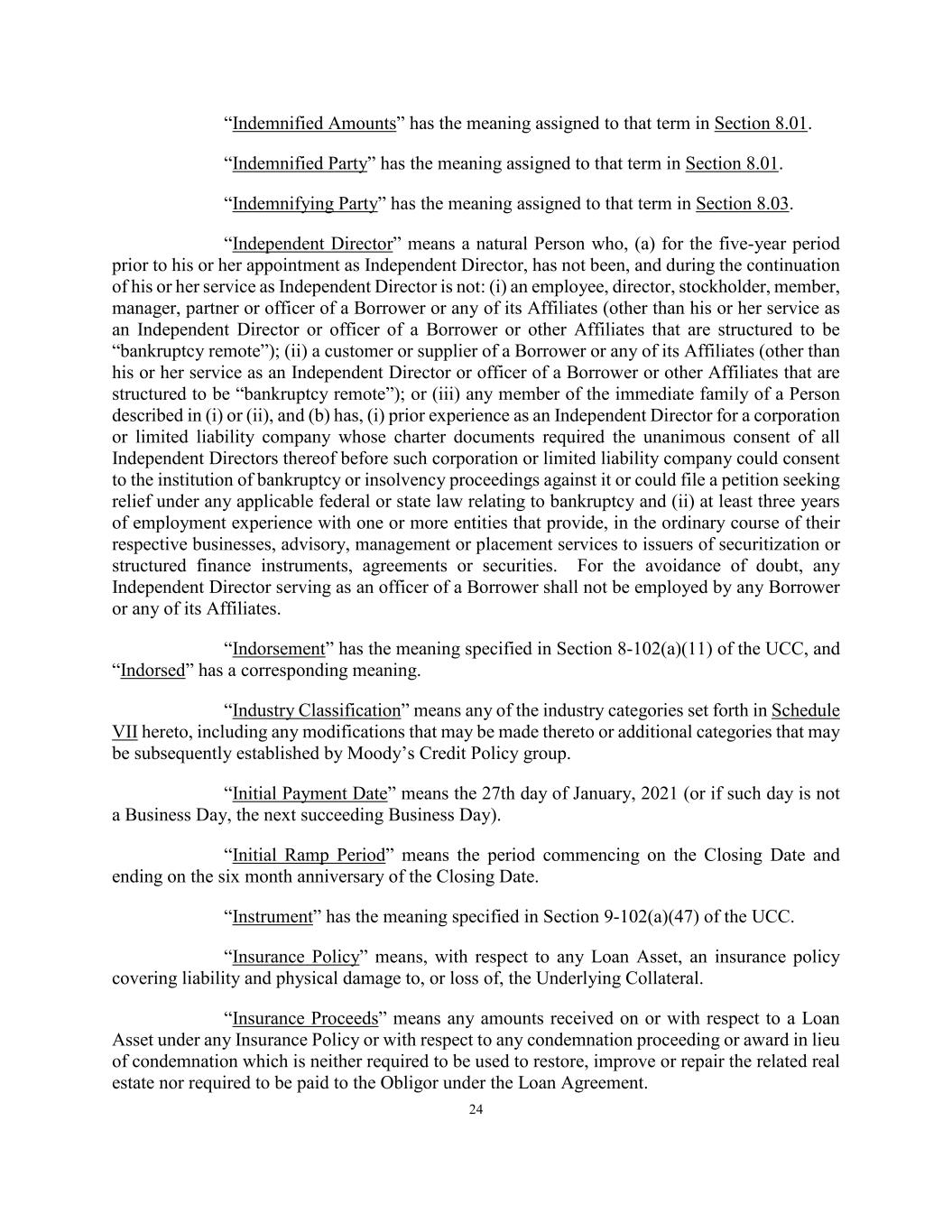 24 “Indemnified Amounts” has the meaning assigned to that term in Section 8.01. “Indemnified Party” has the meaning assigned to that term in Section 8.01. “Indemnifying Party” has the meaning assigned to that term in Section 8.03. “Independent Director” means a natural Person who, (a) for the five-year period prior to his or her appointment as Independent Director, has not been, and during the continuation of his or her service as Independent Director is not: (i) an employee, director, stockholder, member, manager, partner or officer of a Borrower or any of its Affiliates (other than his or her service as an Independent Director or officer of a Borrower or other Affiliates that are structured to be “bankruptcy remote”); (ii) a customer or supplier of a Borrower or any of its Affiliates (other than his or her service as an Independent Director or officer of a Borrower or other Affiliates that are structured to be “bankruptcy remote”); or (iii) any member of the immediate family of a Person described in (i) or (ii), and (b) has, (i) prior experience as an Independent Director for a corporation or limited liability company whose charter documents required the unanimous consent of all Independent Directors thereof before such corporation or limited liability company could consent to the institution of bankruptcy or insolvency proceedings against it or could file a petition seeking relief under any applicable federal or state law relating to bankruptcy and (ii) at least three years of employment experience with one or more entities that provide, in the ordinary course of their respective businesses, advisory, management or placement services to issuers of securitization or structured finance instruments, agreements or securities. For the avoidance of doubt, any Independent Director serving as an officer of a Borrower shall not be employed by any Borrower or any of its Affiliates. “Indorsement” has the meaning specified in Section 8-102(a)(11) of the UCC, and “Indorsed” has a corresponding meaning. “Industry Classification” means any of the industry categories set forth in Schedule VII hereto, including any modifications that may be made thereto or additional categories that may be subsequently established by Moody’s Credit Policy group. “Initial Payment Date” means the 27th day of January, 2021 (or if such day is not a Business Day, the next succeeding Business Day). “Initial Ramp Period” means the period commencing on the Closing Date and ending on the six month anniversary of the Closing Date. “Instrument” has the meaning specified in Section 9-102(a)(47) of the UCC. “Insurance Policy” means, with respect to any Loan Asset, an insurance policy covering liability and physical damage to, or loss of, the Underlying Collateral. “Insurance Proceeds” means any amounts received on or with respect to a Loan Asset under any Insurance Policy or with respect to any condemnation proceeding or award in lieu of condemnation which is neither required to be used to restore, improve or repair the related real estate nor required to be paid to the Obligor under the Loan Agreement.