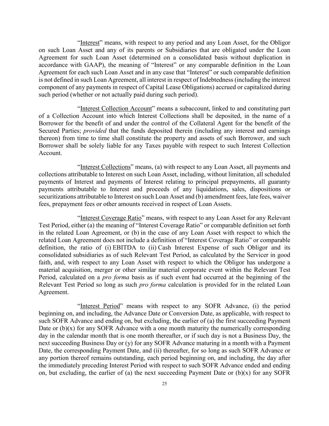 25 “Interest” means, with respect to any period and any Loan Asset, for the Obligor on such Loan Asset and any of its parents or Subsidiaries that are obligated under the Loan Agreement for such Loan Asset (determined on a consolidated basis without duplication in accordance with GAAP), the meaning of “Interest” or any comparable definition in the Loan Agreement for each such Loan Asset and in any case that “Interest” or such comparable definition is not defined in such Loan Agreement, all interest in respect of Indebtedness (including the interest component of any payments in respect of Capital Lease Obligations) accrued or capitalized during such period (whether or not actually paid during such period). “Interest Collection Account” means a subaccount, linked to and constituting part of a Collection Account into which Interest Collections shall be deposited, in the name of a Borrower for the benefit of and under the control of the Collateral Agent for the benefit of the Secured Parties; provided that the funds deposited therein (including any interest and earnings thereon) from time to time shall constitute the property and assets of such Borrower, and such Borrower shall be solely liable for any Taxes payable with respect to such Interest Collection Account. “Interest Collections” means, (a) with respect to any Loan Asset, all payments and collections attributable to Interest on such Loan Asset, including, without limitation, all scheduled payments of Interest and payments of Interest relating to principal prepayments, all guaranty payments attributable to Interest and proceeds of any liquidations, sales, dispositions or securitizations attributable to Interest on such Loan Asset and (b) amendment fees, late fees, waiver fees, prepayment fees or other amounts received in respect of Loan Assets. “Interest Coverage Ratio” means, with respect to any Loan Asset for any Relevant Test Period, either (a) the meaning of “Interest Coverage Ratio” or comparable definition set forth in the related Loan Agreement, or (b) in the case of any Loan Asset with respect to which the related Loan Agreement does not include a definition of “Interest Coverage Ratio” or comparable definition, the ratio of (i) EBITDA to (ii) Cash Interest Expense of such Obligor and its consolidated subsidiaries as of such Relevant Test Period, as calculated by the Servicer in good faith, and, with respect to any Loan Asset with respect to which the Obligor has undergone a material acquisition, merger or other similar material corporate event within the Relevant Test Period, calculated on a pro forma basis as if such event had occurred at the beginning of the Relevant Test Period so long as such pro forma calculation is provided for in the related Loan Agreement. “Interest Period” means with respect to any SOFR Advance, (i) the period beginning on, and including, the Advance Date or Conversion Date, as applicable, with respect to such SOFR Advance and ending on, but excluding, the earlier of (a) the first succeeding Payment Date or (b)(x) for any SOFR Advance with a one month maturity the numerically corresponding day in the calendar month that is one month thereafter, or if such day is not a Business Day, the next succeeding Business Day or (y) for any SOFR Advance maturing in a month with a Payment Date, the corresponding Payment Date, and (ii) thereafter, for so long as such SOFR Advance or any portion thereof remains outstanding, each period beginning on, and including, the day after the immediately preceding Interest Period with respect to such SOFR Advance ended and ending on, but excluding, the earlier of (a) the next succeeding Payment Date or (b)(x) for any SOFR