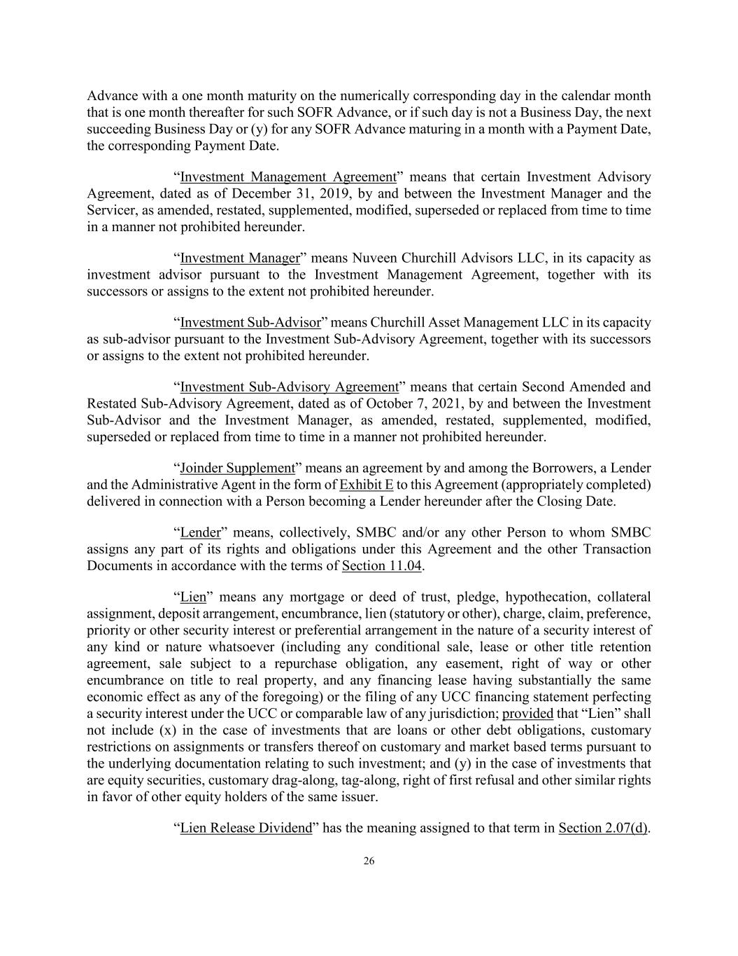 26 Advance with a one month maturity on the numerically corresponding day in the calendar month that is one month thereafter for such SOFR Advance, or if such day is not a Business Day, the next succeeding Business Day or (y) for any SOFR Advance maturing in a month with a Payment Date, the corresponding Payment Date. “Investment Management Agreement” means that certain Investment Advisory Agreement, dated as of December 31, 2019, by and between the Investment Manager and the Servicer, as amended, restated, supplemented, modified, superseded or replaced from time to time in a manner not prohibited hereunder. “Investment Manager” means Nuveen Churchill Advisors LLC, in its capacity as investment advisor pursuant to the Investment Management Agreement, together with its successors or assigns to the extent not prohibited hereunder. “Investment Sub-Advisor” means Churchill Asset Management LLC in its capacity as sub-advisor pursuant to the Investment Sub-Advisory Agreement, together with its successors or assigns to the extent not prohibited hereunder. “Investment Sub-Advisory Agreement” means that certain Second Amended and Restated Sub-Advisory Agreement, dated as of October 7, 2021, by and between the Investment Sub-Advisor and the Investment Manager, as amended, restated, supplemented, modified, superseded or replaced from time to time in a manner not prohibited hereunder. “Joinder Supplement” means an agreement by and among the Borrowers, a Lender and the Administrative Agent in the form of Exhibit E to this Agreement (appropriately completed) delivered in connection with a Person becoming a Lender hereunder after the Closing Date. “Lender” means, collectively, SMBC and/or any other Person to whom SMBC assigns any part of its rights and obligations under this Agreement and the other Transaction Documents in accordance with the terms of Section 11.04. “Lien” means any mortgage or deed of trust, pledge, hypothecation, collateral assignment, deposit arrangement, encumbrance, lien (statutory or other), charge, claim, preference, priority or other security interest or preferential arrangement in the nature of a security interest of any kind or nature whatsoever (including any conditional sale, lease or other title retention agreement, sale subject to a repurchase obligation, any easement, right of way or other encumbrance on title to real property, and any financing lease having substantially the same economic effect as any of the foregoing) or the filing of any UCC financing statement perfecting a security interest under the UCC or comparable law of any jurisdiction; provided that “Lien” shall not include (x) in the case of investments that are loans or other debt obligations, customary restrictions on assignments or transfers thereof on customary and market based terms pursuant to the underlying documentation relating to such investment; and (y) in the case of investments that are equity securities, customary drag-along, tag-along, right of first refusal and other similar rights in favor of other equity holders of the same issuer. “Lien Release Dividend” has the meaning assigned to that term in Section 2.07(d).