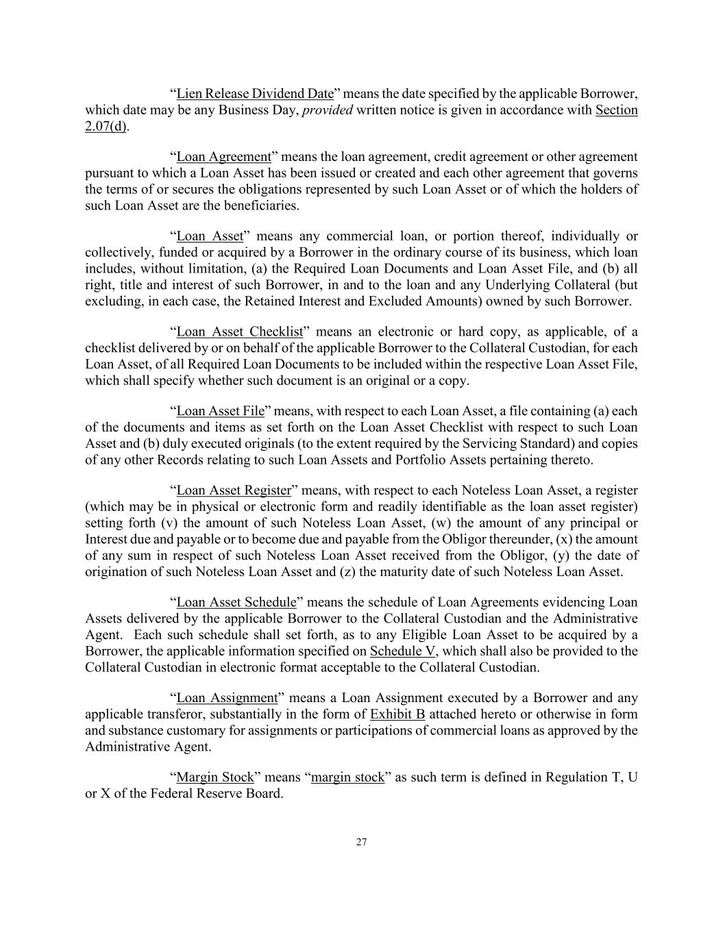 27 “Lien Release Dividend Date” means the date specified by the applicable Borrower, which date may be any Business Day, provided written notice is given in accordance with Section 2.07(d). “Loan Agreement” means the loan agreement, credit agreement or other agreement pursuant to which a Loan Asset has been issued or created and each other agreement that governs the terms of or secures the obligations represented by such Loan Asset or of which the holders of such Loan Asset are the beneficiaries. “Loan Asset” means any commercial loan, or portion thereof, individually or collectively, funded or acquired by a Borrower in the ordinary course of its business, which loan includes, without limitation, (a) the Required Loan Documents and Loan Asset File, and (b) all right, title and interest of such Borrower, in and to the loan and any Underlying Collateral (but excluding, in each case, the Retained Interest and Excluded Amounts) owned by such Borrower. “Loan Asset Checklist” means an electronic or hard copy, as applicable, of a checklist delivered by or on behalf of the applicable Borrower to the Collateral Custodian, for each Loan Asset, of all Required Loan Documents to be included within the respective Loan Asset File, which shall specify whether such document is an original or a copy. “Loan Asset File” means, with respect to each Loan Asset, a file containing (a) each of the documents and items as set forth on the Loan Asset Checklist with respect to such Loan Asset and (b) duly executed originals (to the extent required by the Servicing Standard) and copies of any other Records relating to such Loan Assets and Portfolio Assets pertaining thereto. “Loan Asset Register” means, with respect to each Noteless Loan Asset, a register (which may be in physical or electronic form and readily identifiable as the loan asset register) setting forth (v) the amount of such Noteless Loan Asset, (w) the amount of any principal or Interest due and payable or to become due and payable from the Obligor thereunder, (x) the amount of any sum in respect of such Noteless Loan Asset received from the Obligor, (y) the date of origination of such Noteless Loan Asset and (z) the maturity date of such Noteless Loan Asset. “Loan Asset Schedule” means the schedule of Loan Agreements evidencing Loan Assets delivered by the applicable Borrower to the Collateral Custodian and the Administrative Agent. Each such schedule shall set forth, as to any Eligible Loan Asset to be acquired by a Borrower, the applicable information specified on Schedule V, which shall also be provided to the Collateral Custodian in electronic format acceptable to the Collateral Custodian. “Loan Assignment” means a Loan Assignment executed by a Borrower and any applicable transferor, substantially in the form of Exhibit B attached hereto or otherwise in form and substance customary for assignments or participations of commercial loans as approved by the Administrative Agent. “Margin Stock” means “margin stock” as such term is defined in Regulation T, U or X of the Federal Reserve Board.