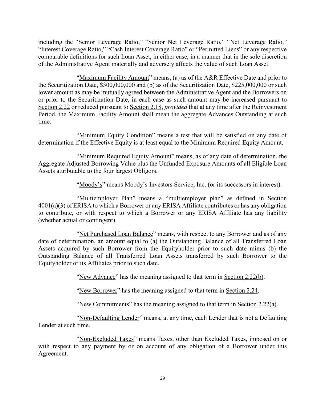 29 including the “Senior Leverage Ratio,” “Senior Net Leverage Ratio,” “Net Leverage Ratio,” “Interest Coverage Ratio,” “Cash Interest Coverage Ratio” or “Permitted Liens” or any respective comparable definitions for such Loan Asset, in either case, in a manner that in the sole discretion of the Administrative Agent materially and adversely affects the value of such Loan Asset. “Maximum Facility Amount” means, (a) as of the A&R Effective Date and prior to the Securitization Date, $300,000,000 and (b) as of the Securitization Date, $225,000,000 or such lower amount as may be mutually agreed between the Administrative Agent and the Borrowers on or prior to the Securitization Date, in each case as such amount may be increased pursuant to Section 2.22 or reduced pursuant to Section 2.18, provided that at any time after the Reinvestment Period, the Maximum Facility Amount shall mean the aggregate Advances Outstanding at such time. “Minimum Equity Condition” means a test that will be satisfied on any date of determination if the Effective Equity is at least equal to the Minimum Required Equity Amount. “Minimum Required Equity Amount” means, as of any date of determination, the Aggregate Adjusted Borrowing Value plus the Unfunded Exposure Amounts of all Eligible Loan Assets attributable to the four largest Obligors. “Moody’s” means Moody’s Investors Service, Inc. (or its successors in interest). “Multiemployer Plan” means a “multiemployer plan” as defined in Section 4001(a)(3) of ERISA to which a Borrower or any ERISA Affiliate contributes or has any obligation to contribute, or with respect to which a Borrower or any ERISA Affiliate has any liability (whether actual or contingent). “Net Purchased Loan Balance” means, with respect to any Borrower and as of any date of determination, an amount equal to (a) the Outstanding Balance of all Transferred Loan Assets acquired by such Borrower from the Equityholder prior to such date minus (b) the Outstanding Balance of all Transferred Loan Assets transferred by such Borrower to the Equityholder or its Affiliates prior to such date. “New Advance” has the meaning assigned to that term in Section 2.22(b). “New Borrower” has the meaning assigned to that term in Section 2.24. “New Commitments” has the meaning assigned to that term in Section 2.22(a). “Non-Defaulting Lender” means, at any time, each Lender that is not a Defaulting Lender at such time. “Non-Excluded Taxes” means Taxes, other than Excluded Taxes, imposed on or with respect to any payment by or on account of any obligation of a Borrower under this Agreement.