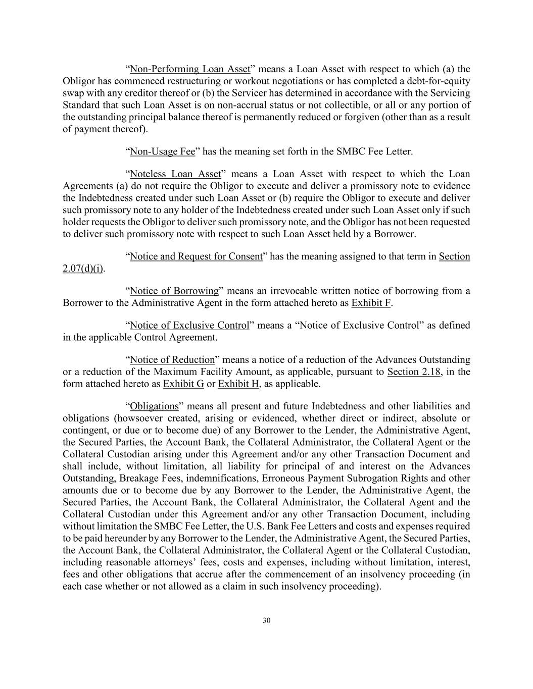 30 “Non-Performing Loan Asset” means a Loan Asset with respect to which (a) the Obligor has commenced restructuring or workout negotiations or has completed a debt-for-equity swap with any creditor thereof or (b) the Servicer has determined in accordance with the Servicing Standard that such Loan Asset is on non-accrual status or not collectible, or all or any portion of the outstanding principal balance thereof is permanently reduced or forgiven (other than as a result of payment thereof). “Non-Usage Fee” has the meaning set forth in the SMBC Fee Letter. “Noteless Loan Asset” means a Loan Asset with respect to which the Loan Agreements (a) do not require the Obligor to execute and deliver a promissory note to evidence the Indebtedness created under such Loan Asset or (b) require the Obligor to execute and deliver such promissory note to any holder of the Indebtedness created under such Loan Asset only if such holder requests the Obligor to deliver such promissory note, and the Obligor has not been requested to deliver such promissory note with respect to such Loan Asset held by a Borrower. “Notice and Request for Consent” has the meaning assigned to that term in Section 2.07(d)(i). “Notice of Borrowing” means an irrevocable written notice of borrowing from a Borrower to the Administrative Agent in the form attached hereto as Exhibit F. “Notice of Exclusive Control” means a “Notice of Exclusive Control” as defined in the applicable Control Agreement. “Notice of Reduction” means a notice of a reduction of the Advances Outstanding or a reduction of the Maximum Facility Amount, as applicable, pursuant to Section 2.18, in the form attached hereto as Exhibit G or Exhibit H, as applicable. “Obligations” means all present and future Indebtedness and other liabilities and obligations (howsoever created, arising or evidenced, whether direct or indirect, absolute or contingent, or due or to become due) of any Borrower to the Lender, the Administrative Agent, the Secured Parties, the Account Bank, the Collateral Administrator, the Collateral Agent or the Collateral Custodian arising under this Agreement and/or any other Transaction Document and shall include, without limitation, all liability for principal of and interest on the Advances Outstanding, Breakage Fees, indemnifications, Erroneous Payment Subrogation Rights and other amounts due or to become due by any Borrower to the Lender, the Administrative Agent, the Secured Parties, the Account Bank, the Collateral Administrator, the Collateral Agent and the Collateral Custodian under this Agreement and/or any other Transaction Document, including without limitation the SMBC Fee Letter, the U.S. Bank Fee Letters and costs and expenses required to be paid hereunder by any Borrower to the Lender, the Administrative Agent, the Secured Parties, the Account Bank, the Collateral Administrator, the Collateral Agent or the Collateral Custodian, including reasonable attorneys’ fees, costs and expenses, including without limitation, interest, fees and other obligations that accrue after the commencement of an insolvency proceeding (in each case whether or not allowed as a claim in such insolvency proceeding).